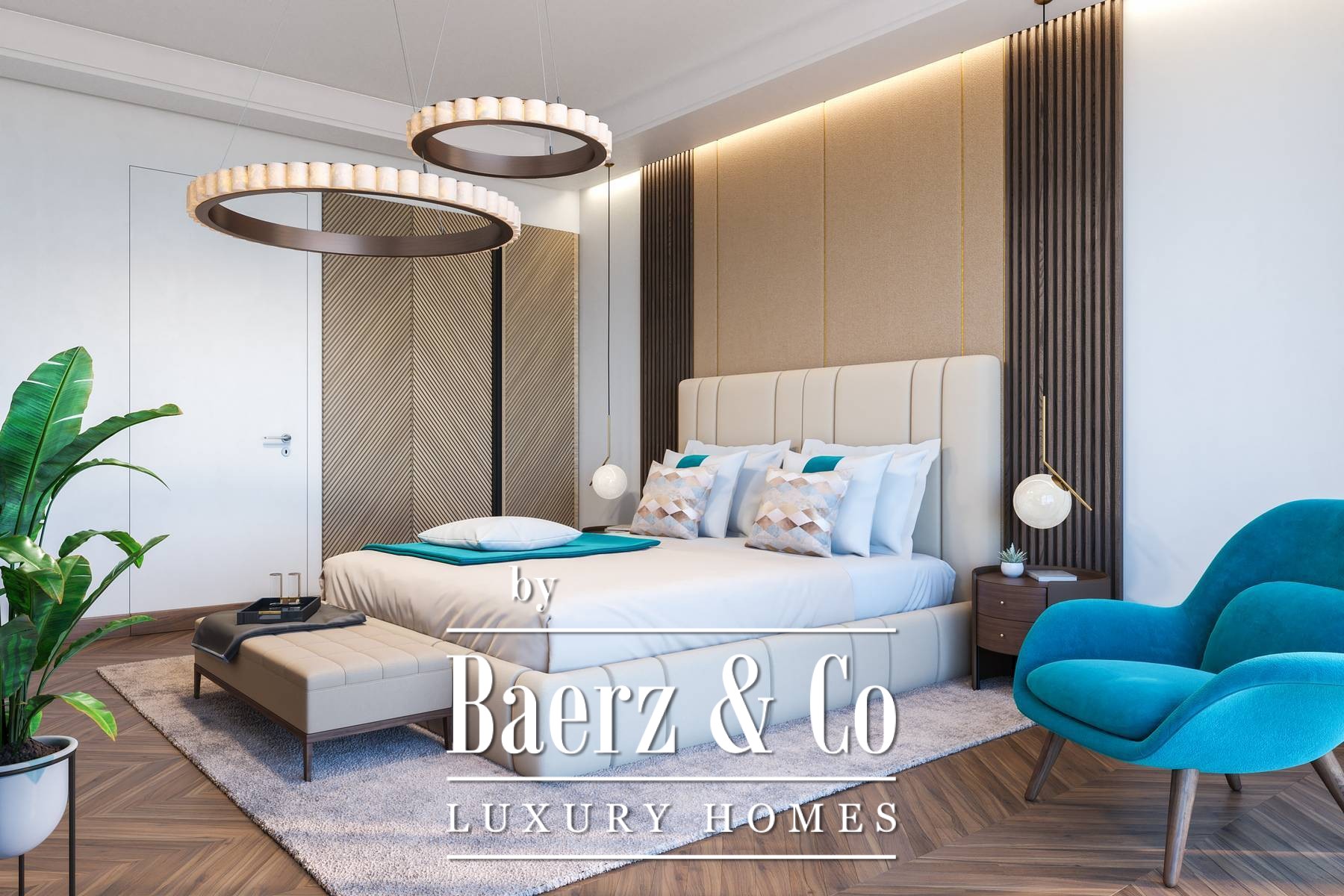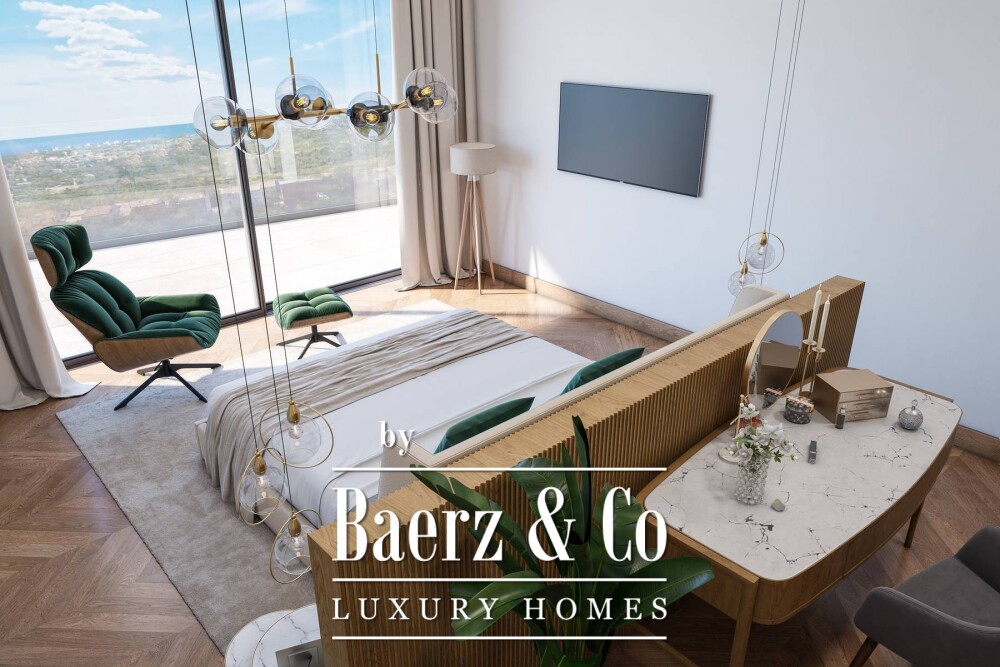 Het hart van de villa wordt gevormd door een open leefruimte waarin een ruime lounge, formele eetkamer, keuken en biljartkamer naadloos samenkomen. Een opvallend dubbele trap leidt naar de etages, waar ontspanningsruimtes en slaapkamers tot in detail zijn uitgewerkt. Strategisch geplaatste openingen in dak en trap laten het licht gedurende de dag op elegante wijze verschuiven en bieden uitzicht op de lucht en een continu gevoel van verbinding met de omgeving.