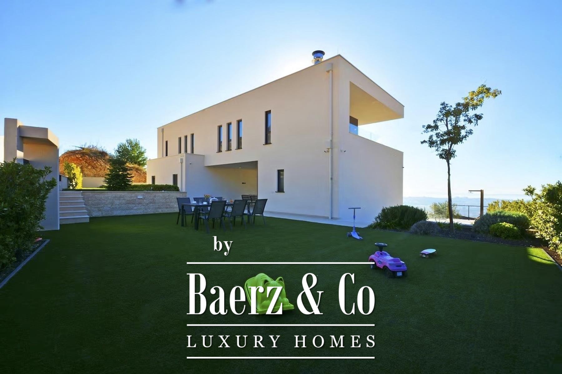 Op de eerste verdieping bevinden zich vier slaapkamers en twee badkamers, ieder met toegang tot het balkon en een royaal terras, waardoor het zeezicht behouden blijft. Het perceel van 900 m² omvat een garage voor twee auto’s, extra privéparkeerplaatsen voor vier voertuigen en een fraai aangelegde binnenplaats.