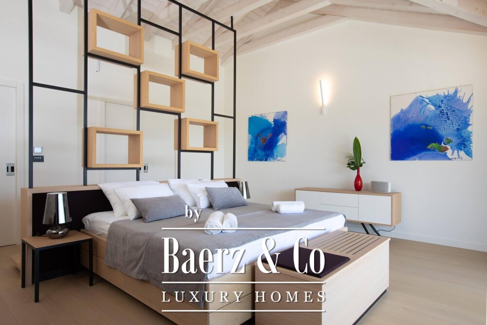 De begane grond bestaat uit een entreehal, woonkamer, keuken, eetgedeelte, berging, garderobe, gastentoilet en twee overdekte terrassen. Boven beschikt elke van de drie slaapkamers over een eigen badkamer, waaronder een master suite met inloopkast en een apart kantoor. Het overdekte balkon biedt een prachtig uitzicht op zee.