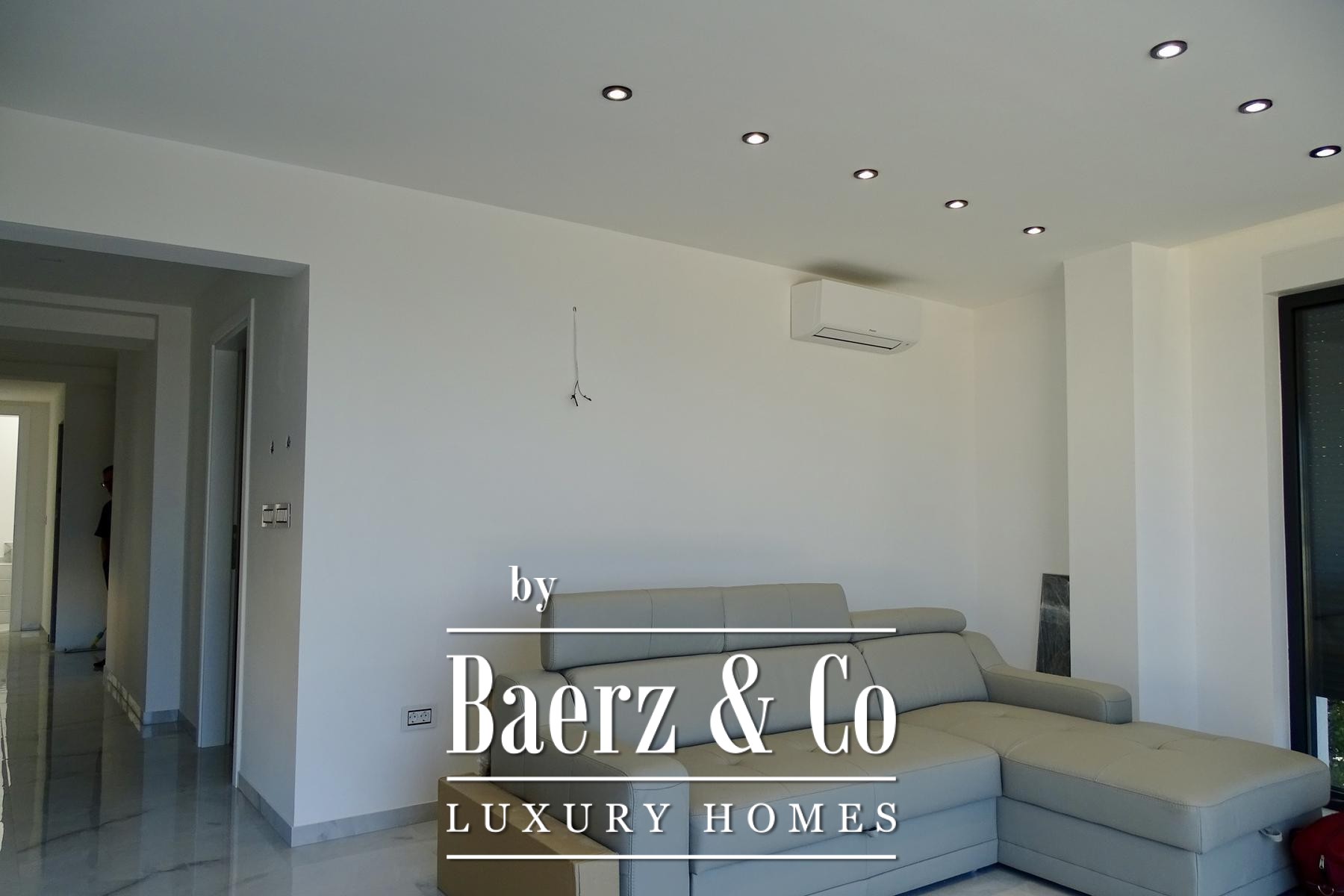 Op de begane grond bevindt zich een tweeslaapkamerappartement met een lichte woonkamer en twee badkamers, grenzend aan een terras met een zwembad van 40 m² en een geplande buitenkeuken onder een pergola. Op de eerste verdieping is er een driekamerappartement ontworpen voor zowel privacy als gezamenlijk wonen, met een ruime living, twee badkamers en directe toegang tot een dakterras van 120 m². Hier zijn aansluitingen voor water en elektriciteit aanwezig, naar wens in te vullen met bijvoorbeeld een jacuzzi of een privé salons, zodat het vrij uitzicht op de baai van Kvarner en haar eilanden volledig tot zijn recht komt.