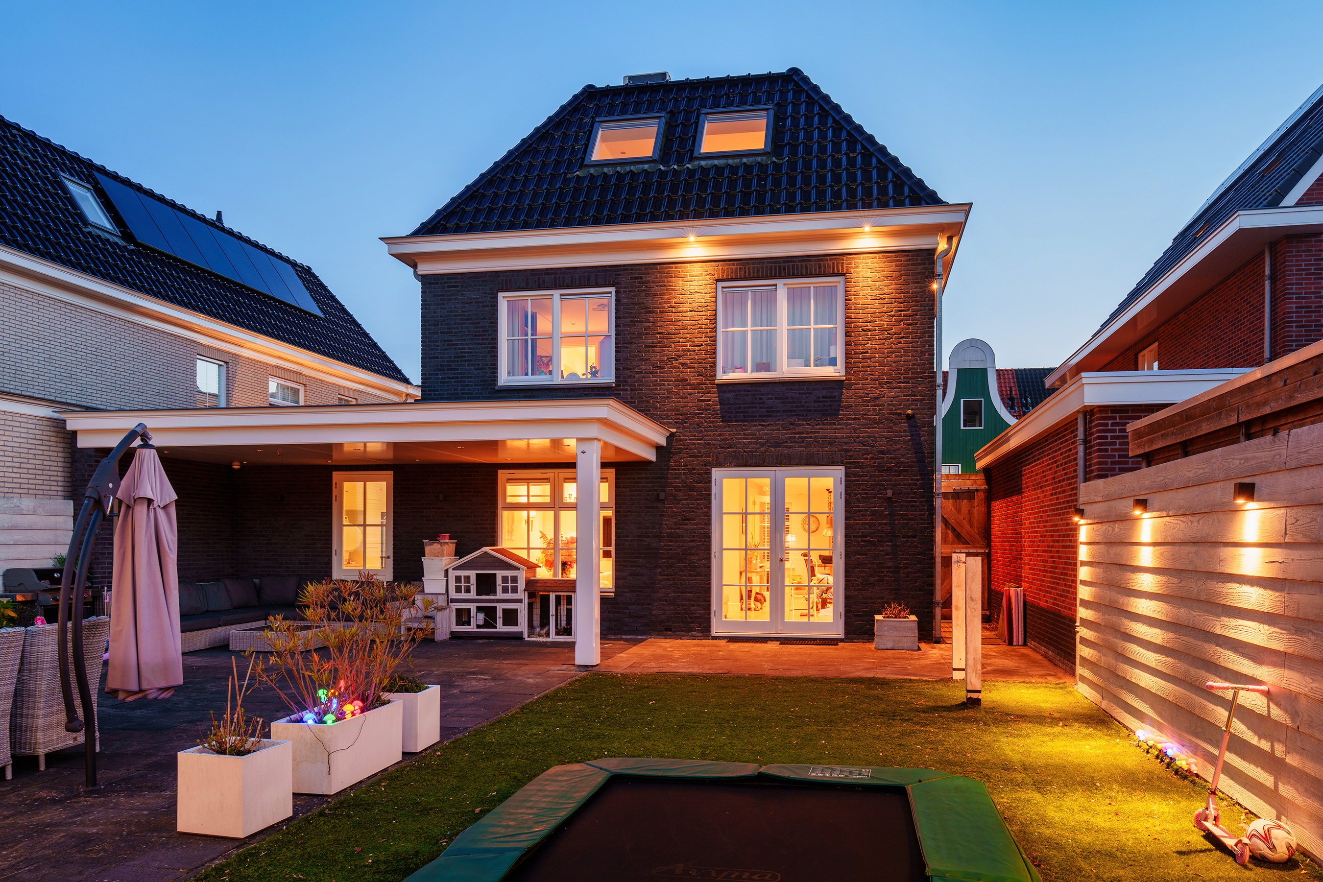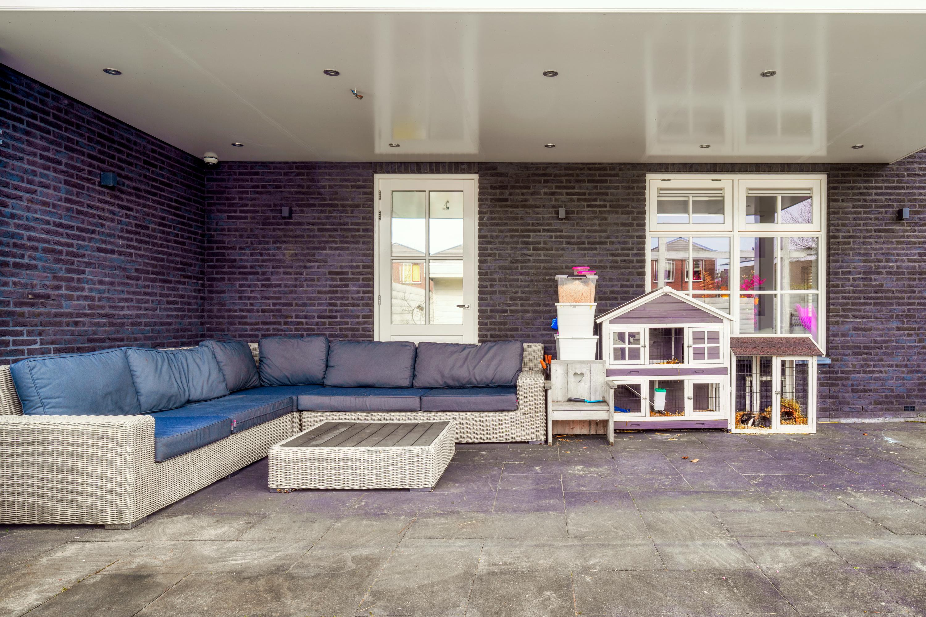 De living aan de tuinzijde is gezellig, met opvallende cinewall en open haard. Hiervandaan loop via de dubbele deuren naar de tuin met zeer grote porch. Super voor die lange avonden en feestjes buiten op het terras. Ingebouwde trampoline, en een schommel voor de kids. Met een wijntje in de hand, hou je een (klein) oogje in het zeil. De tuinkussen en die van je sloep, leg je netjes weg in de houten schuur. En die sloep? Ach, die meer je af, direct achter het huis. Je vaart op een mooie zomerdag zo naar Amsterdam.