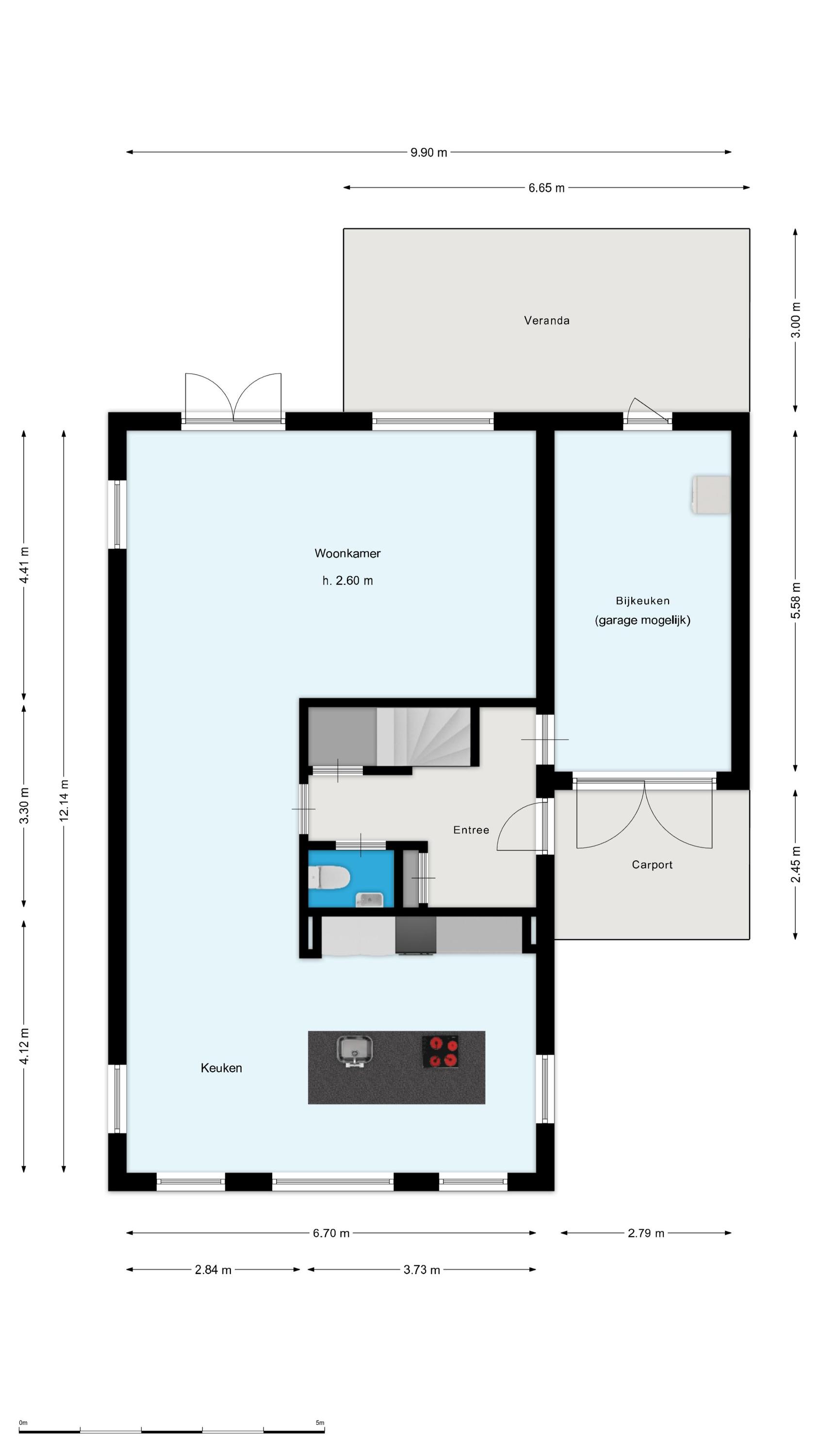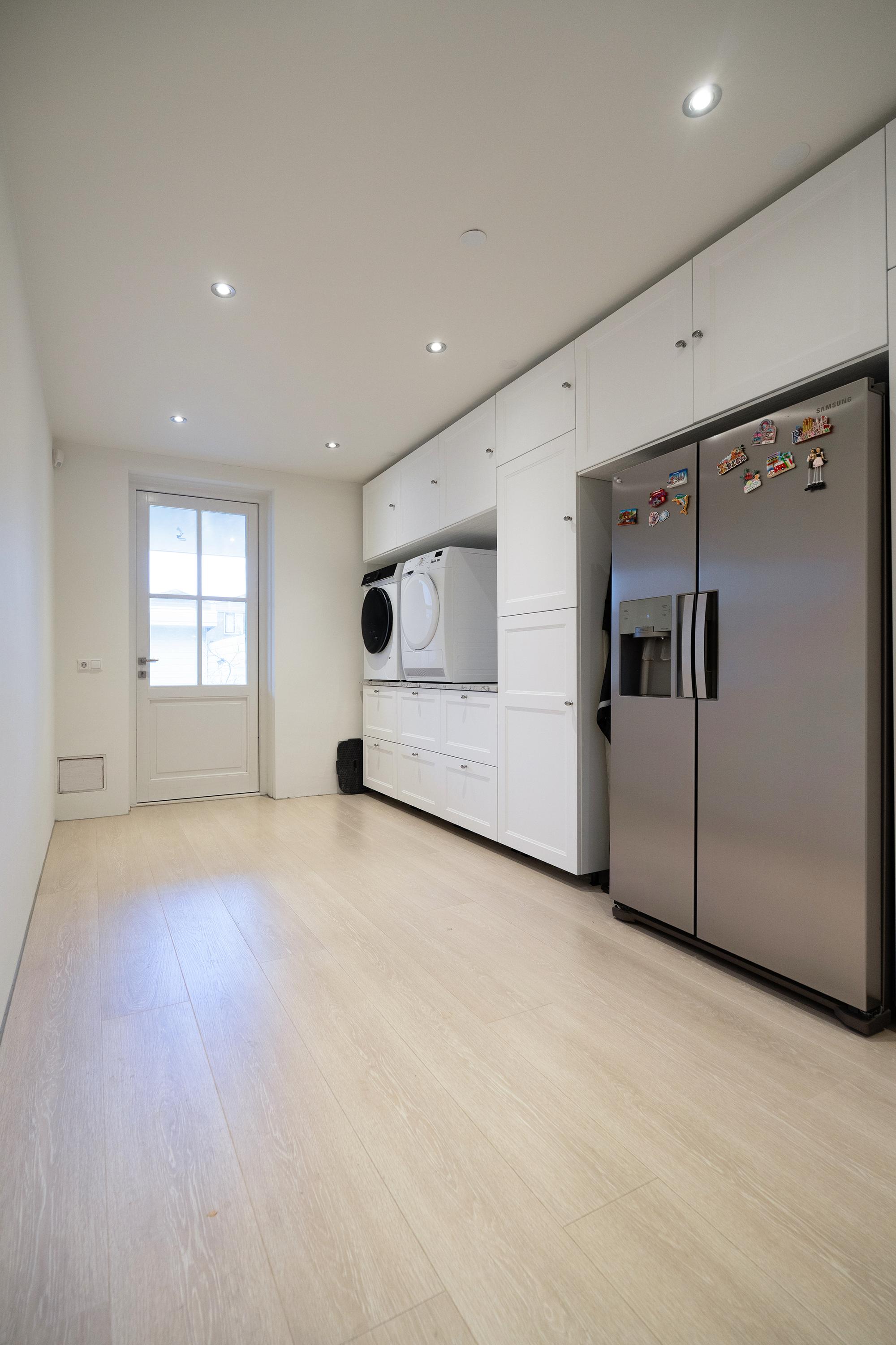 Aan de voorzijde is de royale woonkeuken gesitueerd, voorzien van een kookeiland en diverse inbouwapparatuur. Aansluitend aan de woonkamer bevindt zich de garage (momenteel een werkelijk hele fijne bijkeuken / natte ruimte), met tevens een deur naar buiten en toegang tot de carport.