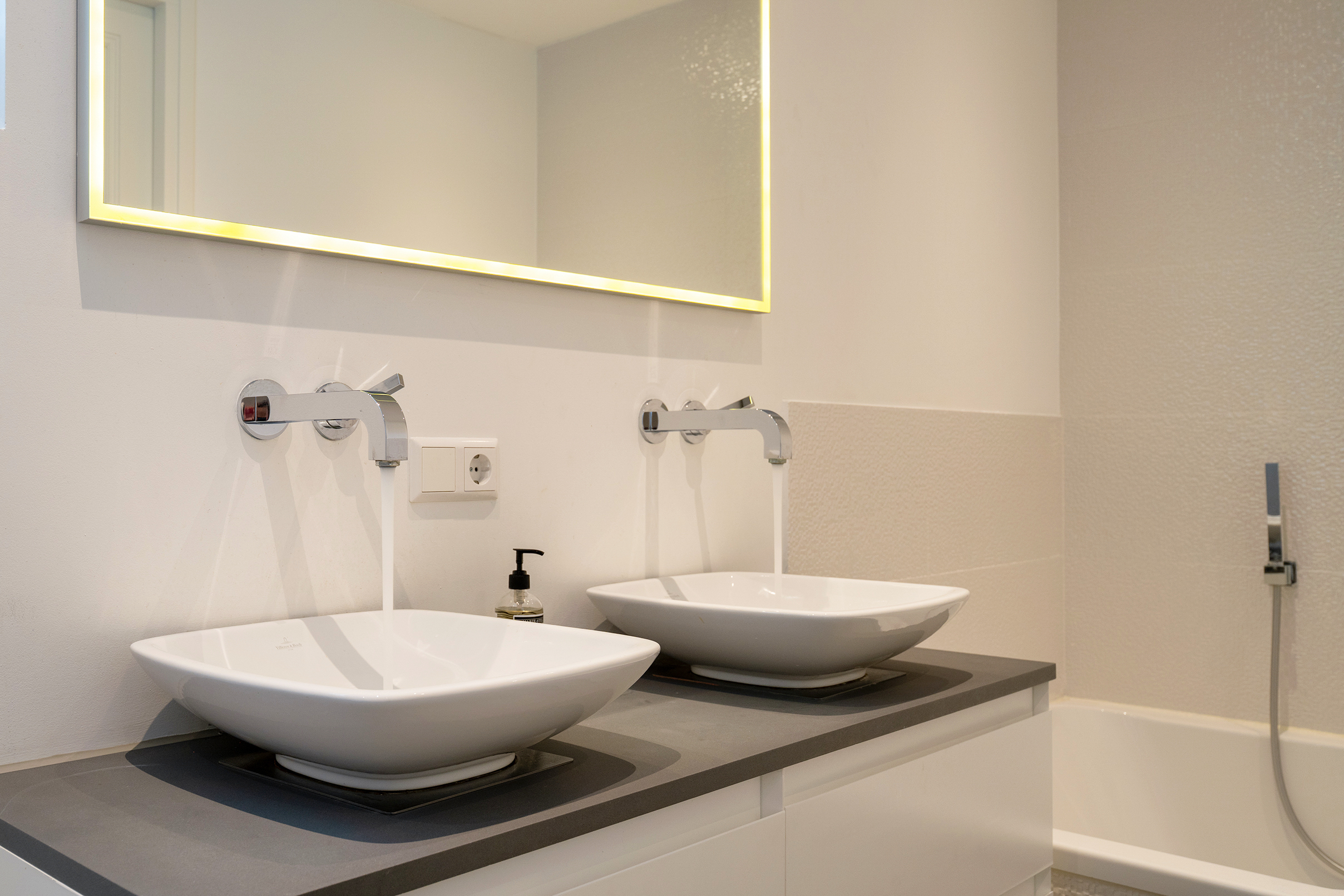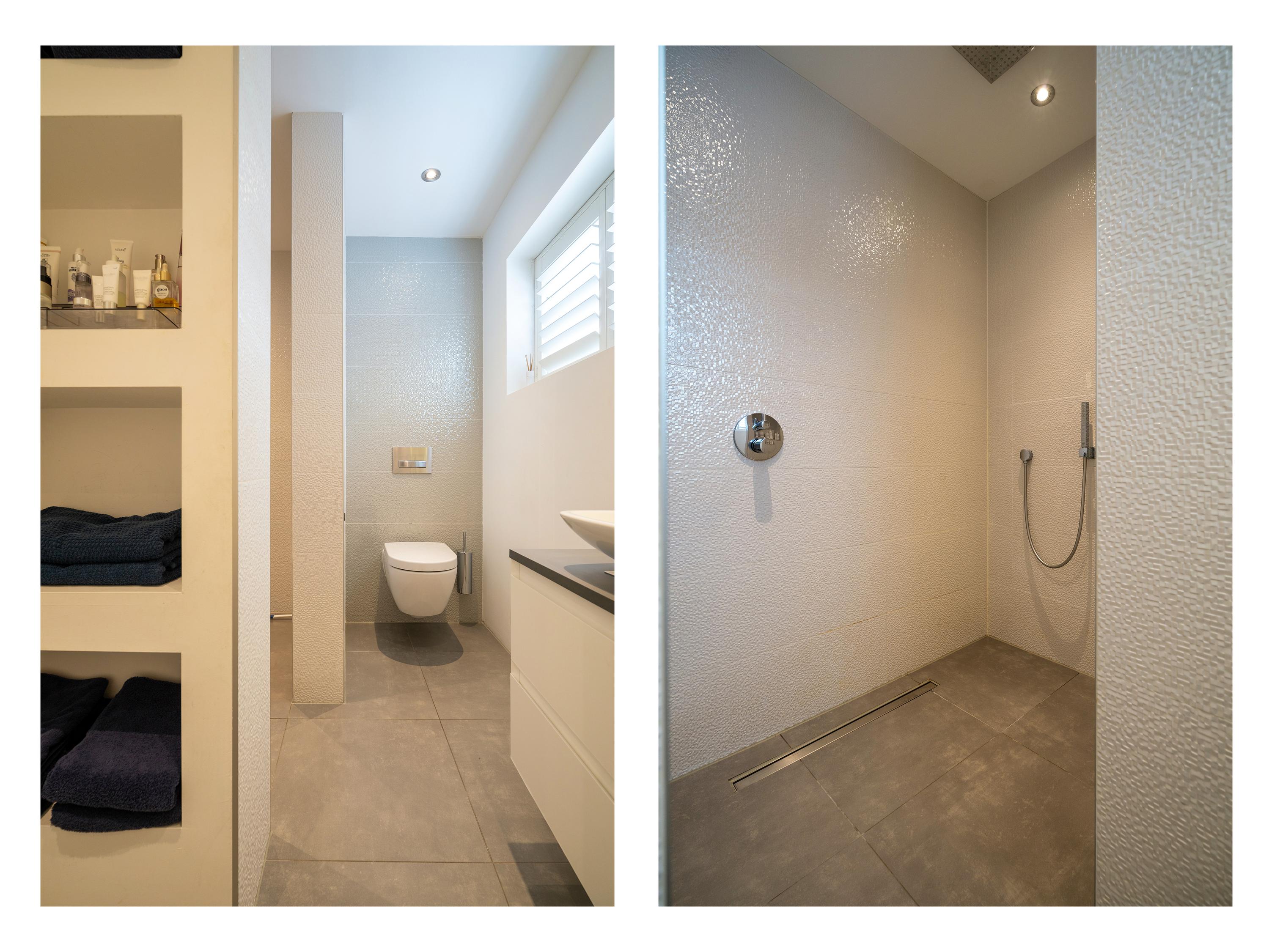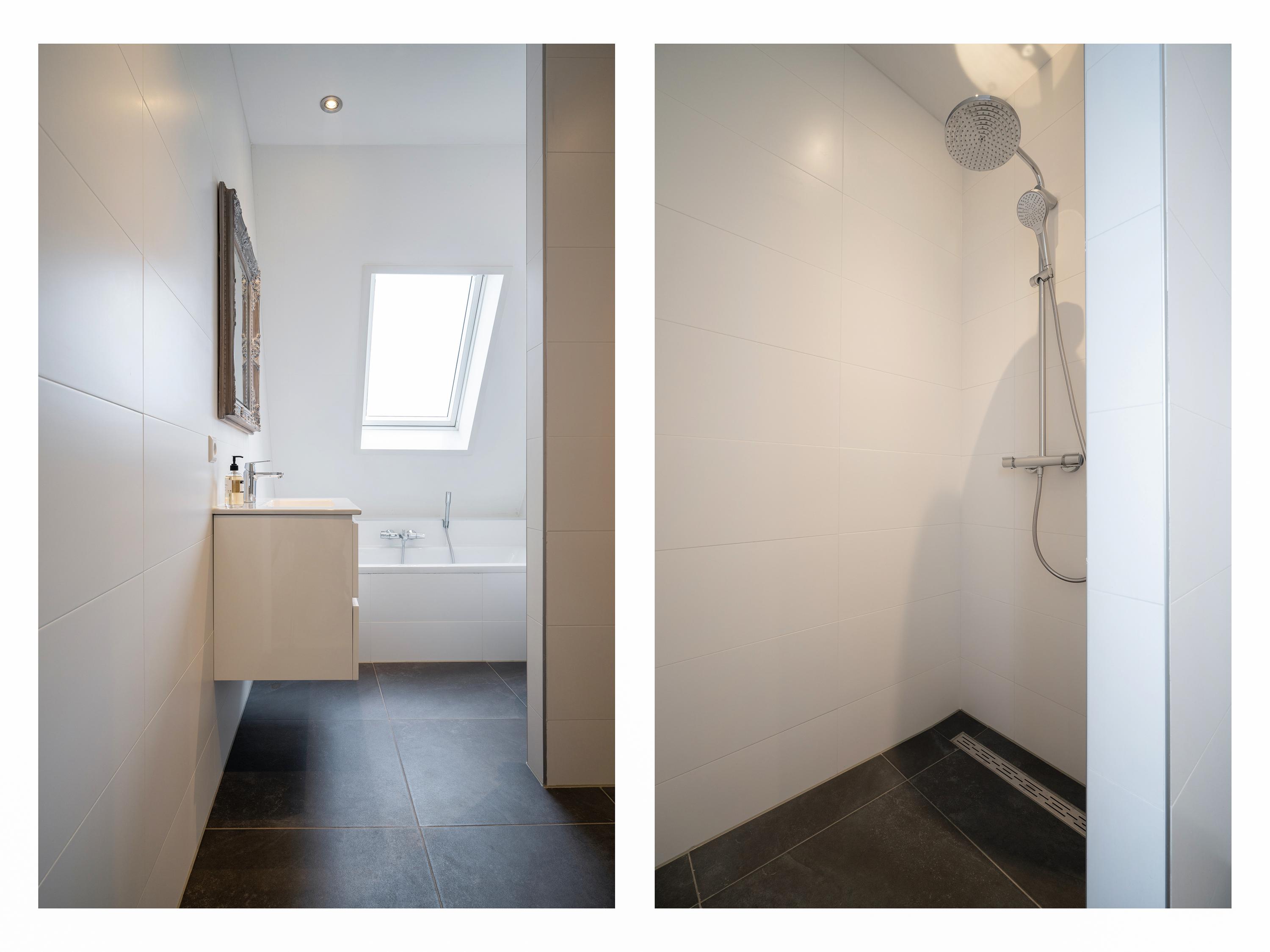 De luxe badkamer is compleet uitgevoerd met ligbad, douche, dubbele wastafel en toilet. Daarnaast is er een separate ruimte ingericht als walk-in closet.
