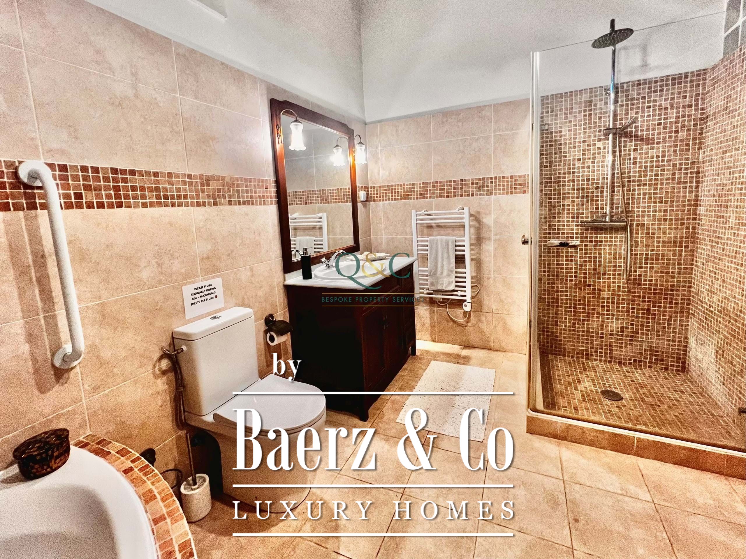 Binnen zorgen twee slaapkamers met en-suite badkamers voor zowel stijl als functionaliteit, waarvan één met douche en de ander met ligbad én douche. De originele stenen muur in de volledig uitgeruste keuken en ontbijtruimte zorgt voor een tastbare verbinding met de plek, terwijl plafonds van bamboe en houten balken bijdragen aan de kenmerkende warmte van het huis. Een houtkachel en duo-therm radiatoren van natuursteen bieden comfortabel wonen in elk seizoen, aangevuld met airconditioning die entree en woonkamer subtiel koelt. Een extra kantoorruimte biedt veelzijdigheid en gemak.