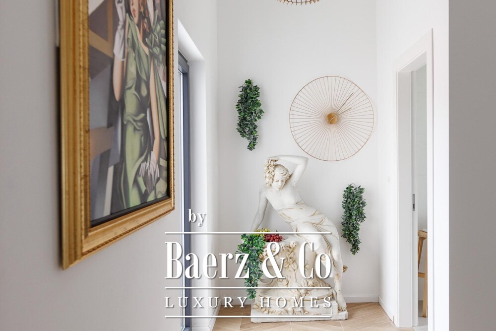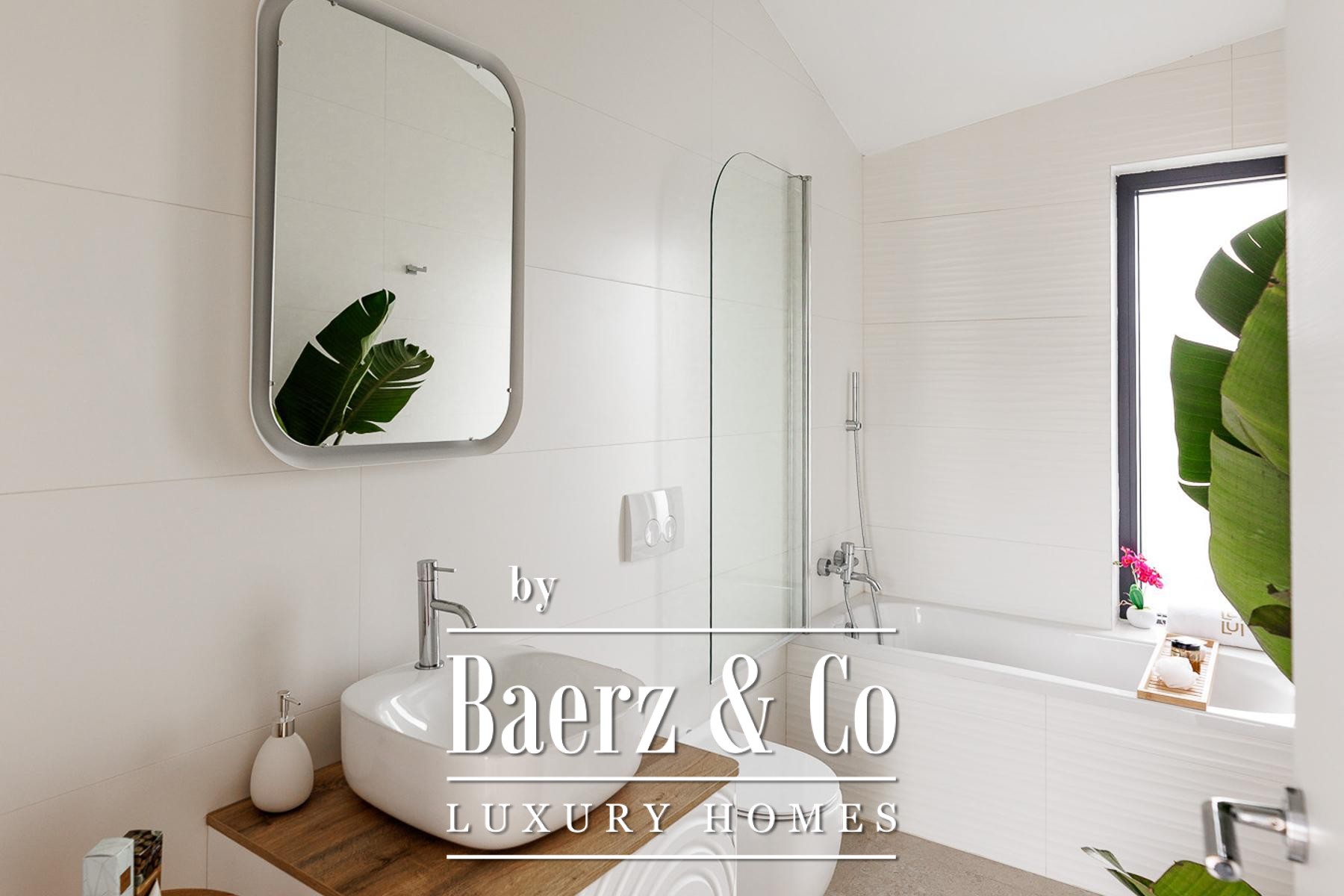 De woning is verdeeld over drie zorgvuldig ontworpen verdiepingen. Het souterrain biedt ruimte aan een wijnkelder, fitnessruimte, kinderspeelkamer en een spa met Finse sauna, waardoor er een privéomgeving ontstaat voor wellness en gezelschap. Op de begane grond vindt u een open keuken en eetruimte, die overloopt in een met glas omgeven woonkamer met directe zichtlijnen naar het terras en het zwembad. Op dit niveau geeft een slaapkamer met eigen badkamer toegang tot een privéterras.