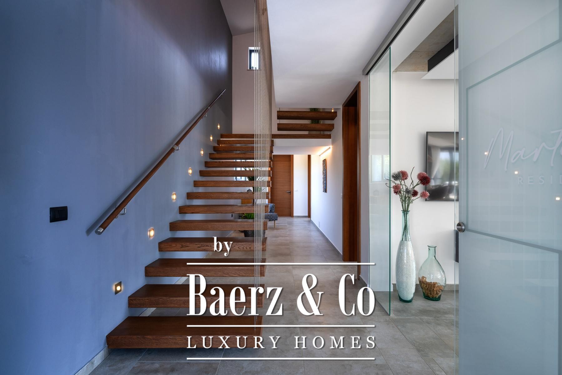 Via een trap van massief hout leidt de eerste verdieping naar een serene werkplek op de vide en twee extra slaapkamers, ieder met een eigen badkamer en zicht op de olijfgaarden tot aan het Učka-gebergte. Elke kamer is uitgerust met exclusieve Bentley-bedden en maatwerk dat speciaal voor deze woning is ontworpen.