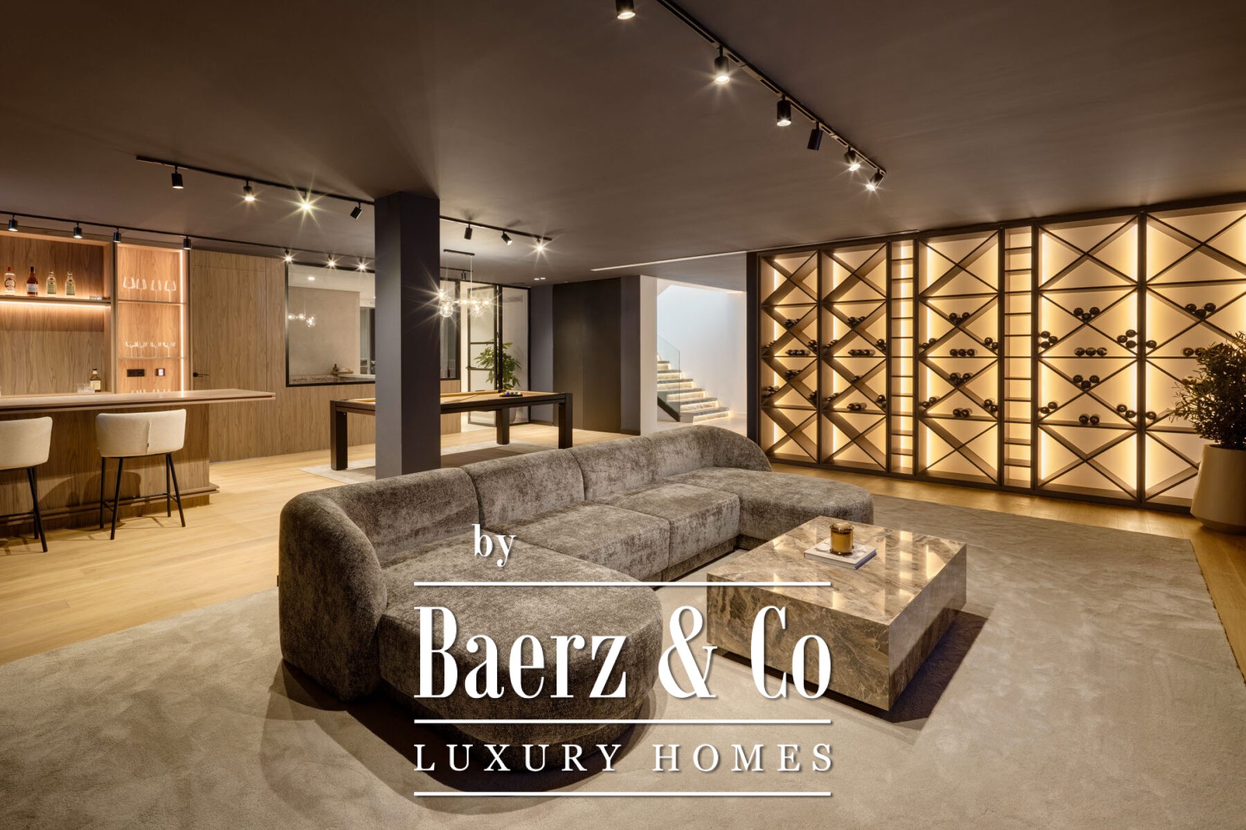 Het interieur onderscheidt zich door hoogwaardige eiken vloeren, grootformaat porseleinen tegels en de nieuwste apparatuur van Gaggenau en Siemens. Voor ontspanning is er een privé verwarmd zwembad, een eigen bioscoop en een gym. De garage voldoet aan de moderne eisen. De villa wordt volledig gemeubileerd in een hedendaagse stijl aangeboden, met de mogelijkheid het meubilair apart aan te schaffen voor €250.000.