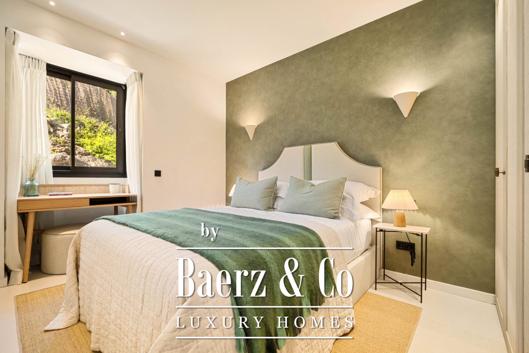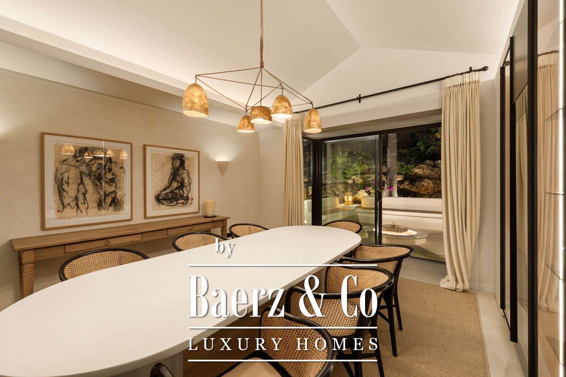 Villa Marbella met zee- en bergzicht bevindt zich in alle rust in Nueva Andalucía, op enkele minuten van de Los Naranjos Golf en nabij de befaamde stranden en restaurants van Marbella. Deze volledig gerenoveerde gelijkvloerse villa biedt 241 m² woonoppervlak op een verhoogd perceel van 855 m² en ademt de mediterrane levensstijl. Het leefgedeelte kenmerkt zich door een open indeling, hoge gewelfde plafonds en een palet aan zachte natuurlijke tinten. Daglicht stroomt vrij door de kamer dankzij schuifpuien van vloer tot plafond, die uitkomen op een royaal terras waar het infinity-zwembad lijkt te zweven boven het dal. Zowel vanuit de woning als vanaf het dakterras strekken panoramische vergezichten zich uit over de vallei tot aan de zee.