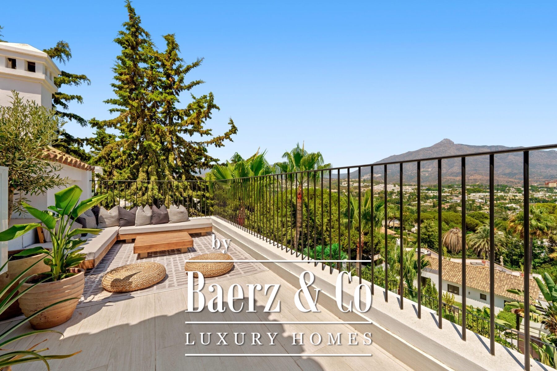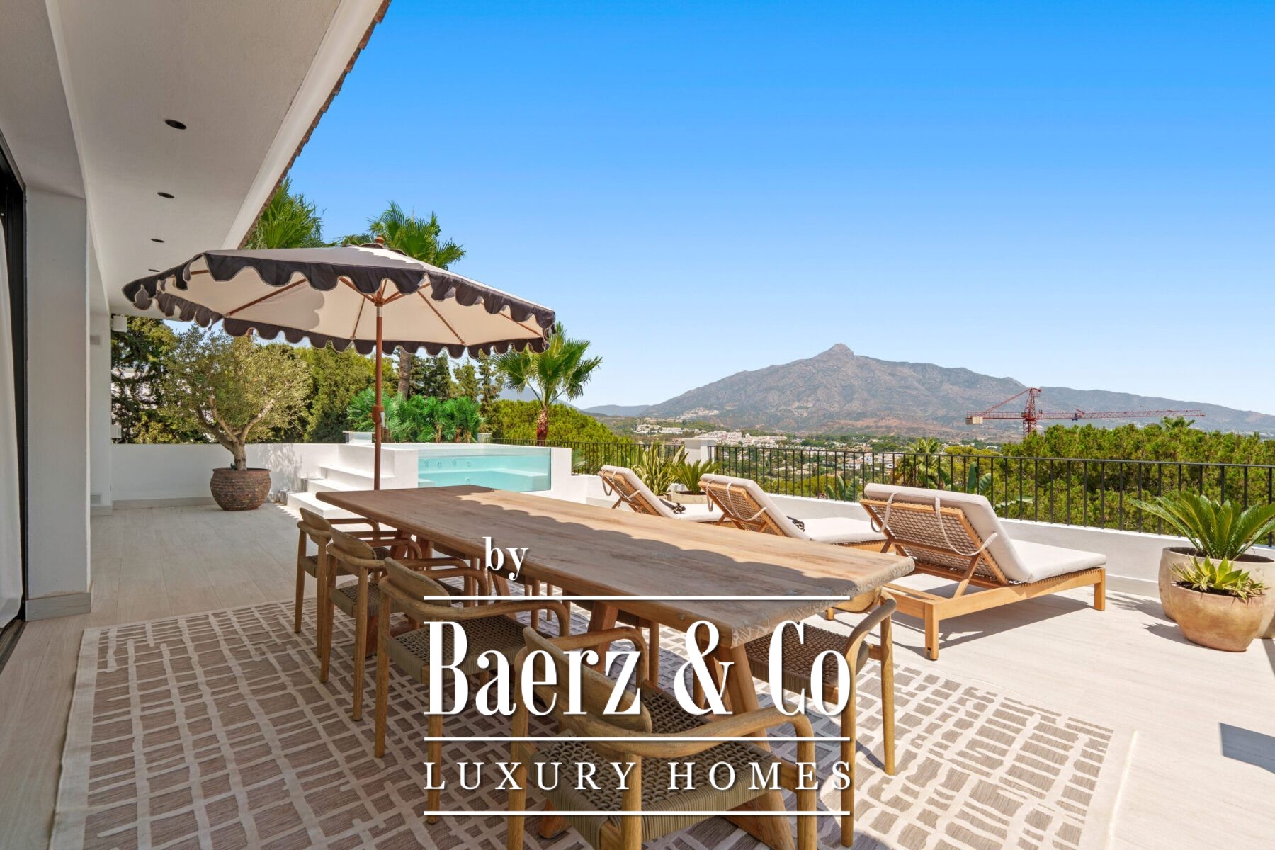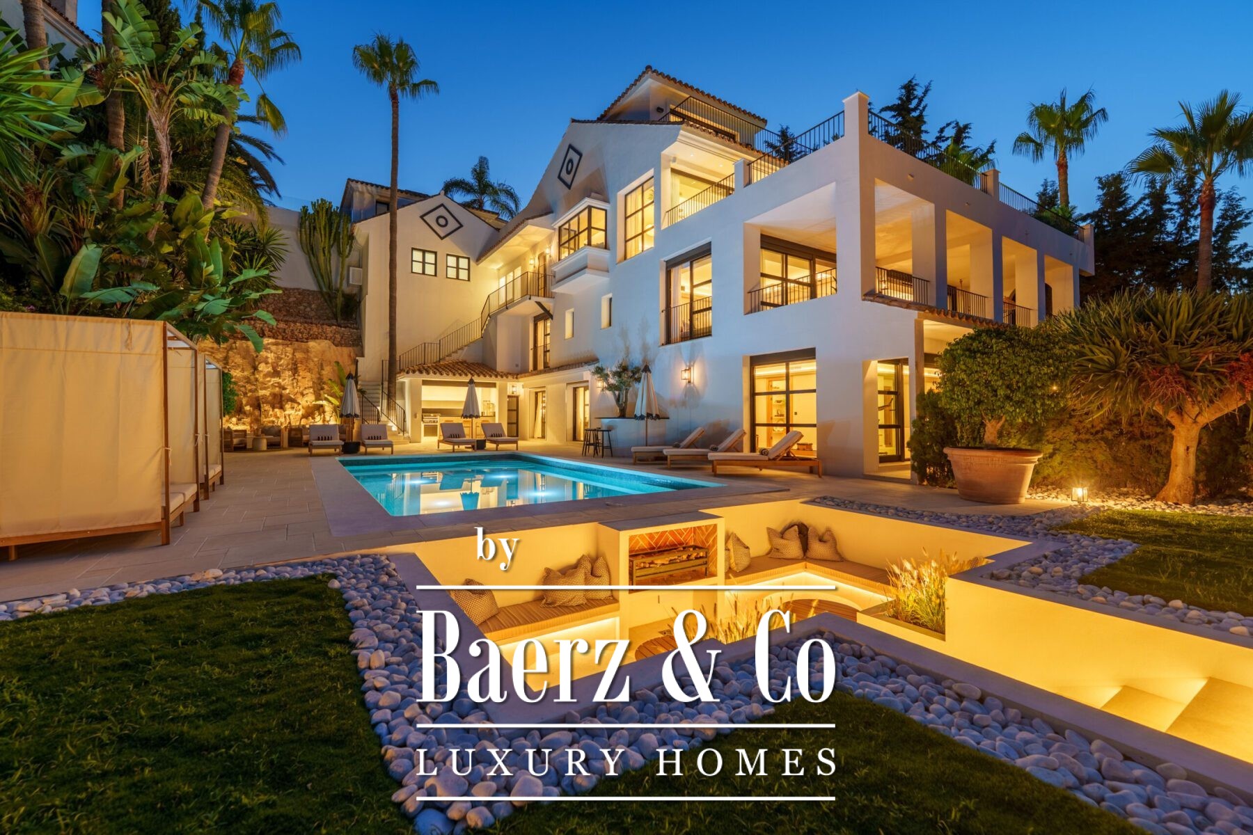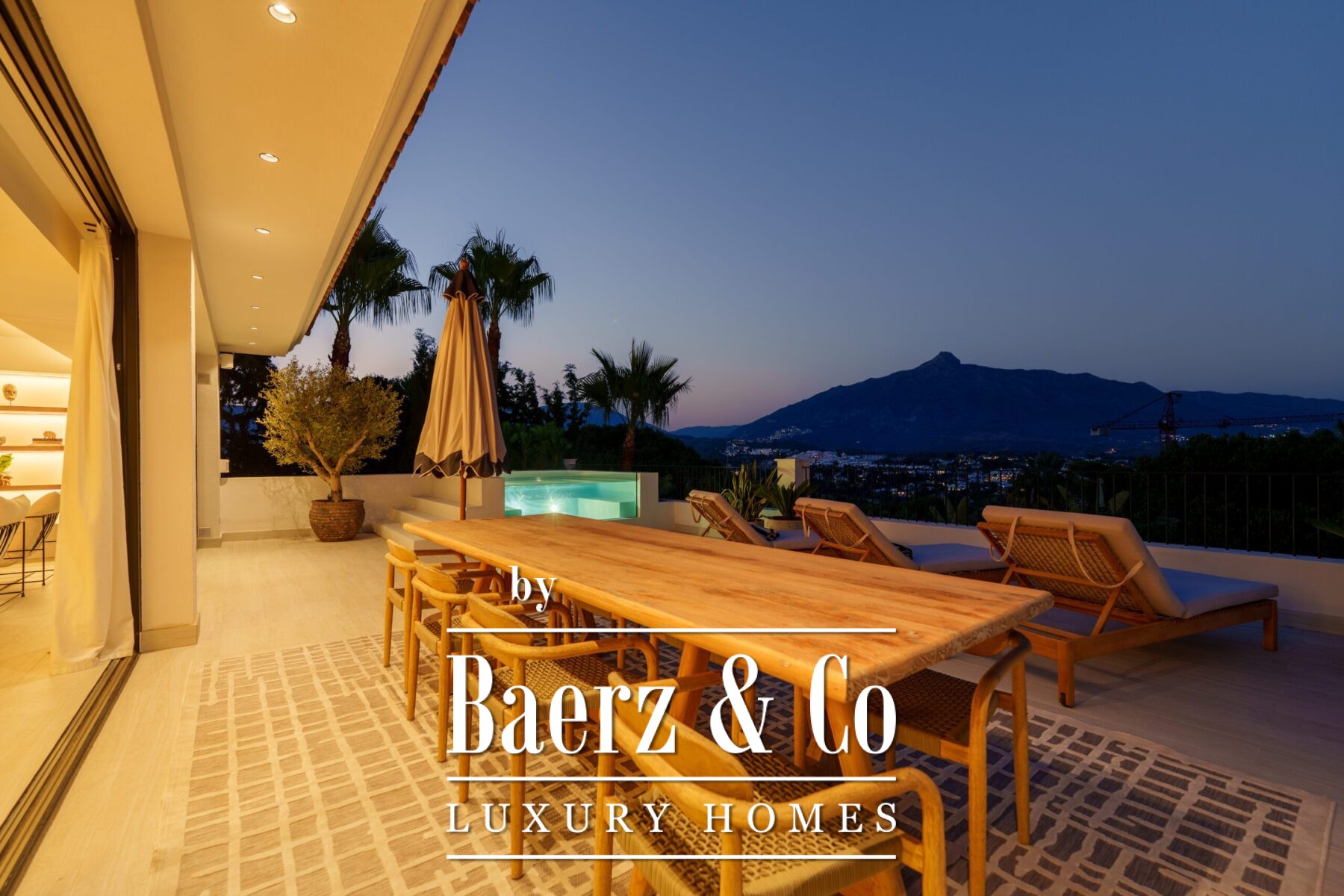 In the heart of the prestigious Nueva Andalucía, just minutes from world-class golf courses, Puerto Banús, and Marbella’s finest dining and shopping, stands this luxury villa as a masterpiece of modern Mediterranean living. This extraordinary five-level villa captures panoramic views of the Mediterranean Sea and the iconic La Concha mountain, blending timeless Andalusian charm with cutting-edge contemporary elegance.