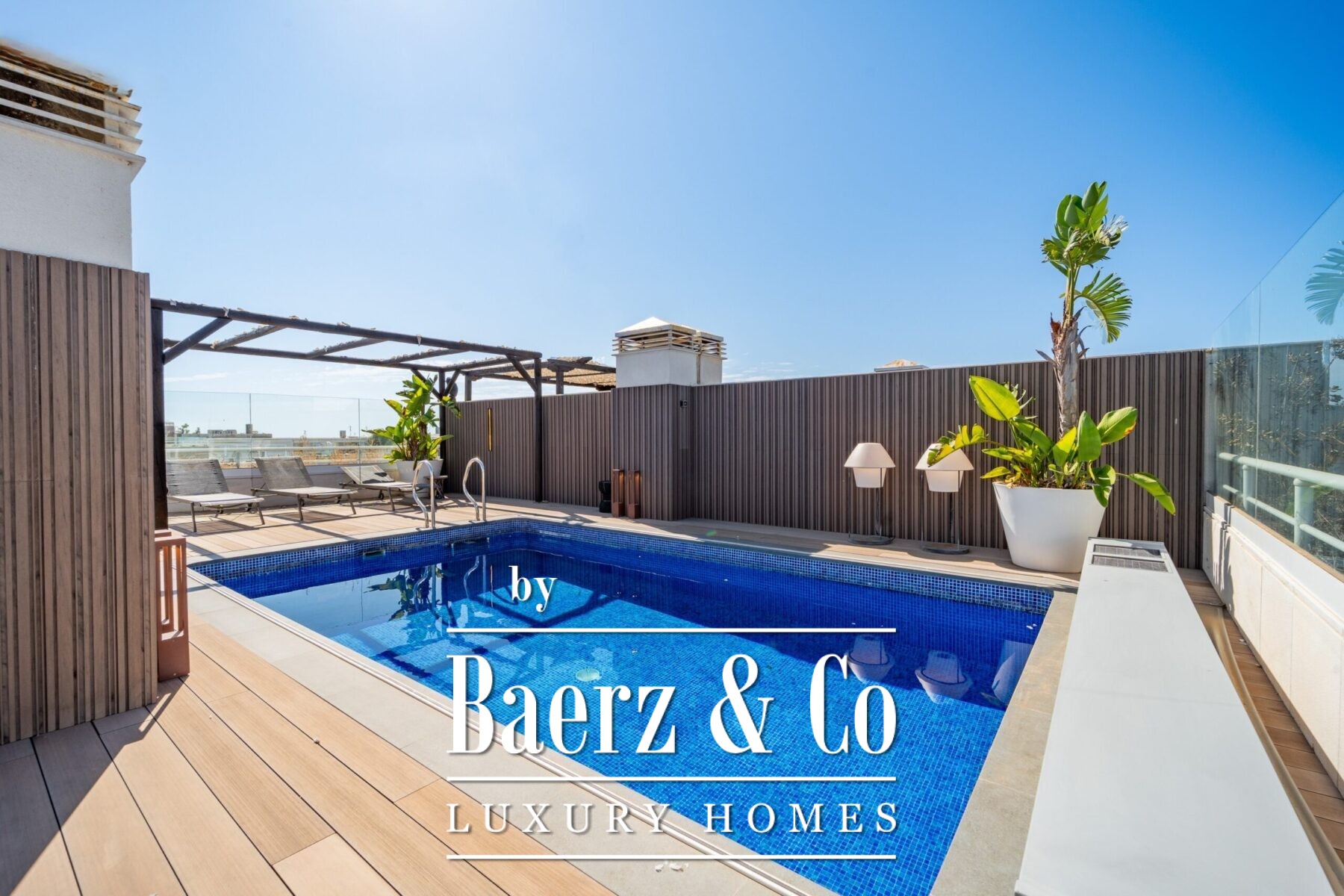 Boven transformeert het 300 m² grote dakterras ontspanning tot een dagelijks ritueel, met een klimaatgeregelde lounge, een overdekte ruimte geïnspireerd op Afrikaanse architectuur, een buiten-eetgedeelte en een volledig uitgeruste tweede keuken. Het privé dakterras met verwarmd zwembad biedt panoramisch zicht tot vrijwel 360 graden over de Costa del Sol. Voorzieningen binnen het afgesloten domein omvatten verzorgde tropische tuinen, twee buitenzwembaden en één binnenzwembad, fitnessruimte, een uitgebreide spa met sauna en hydromassage, evenals 24-uurs beveiliging. Twee garageplaatsen en een ruime berging zorgen voor extra gemak en privacy.