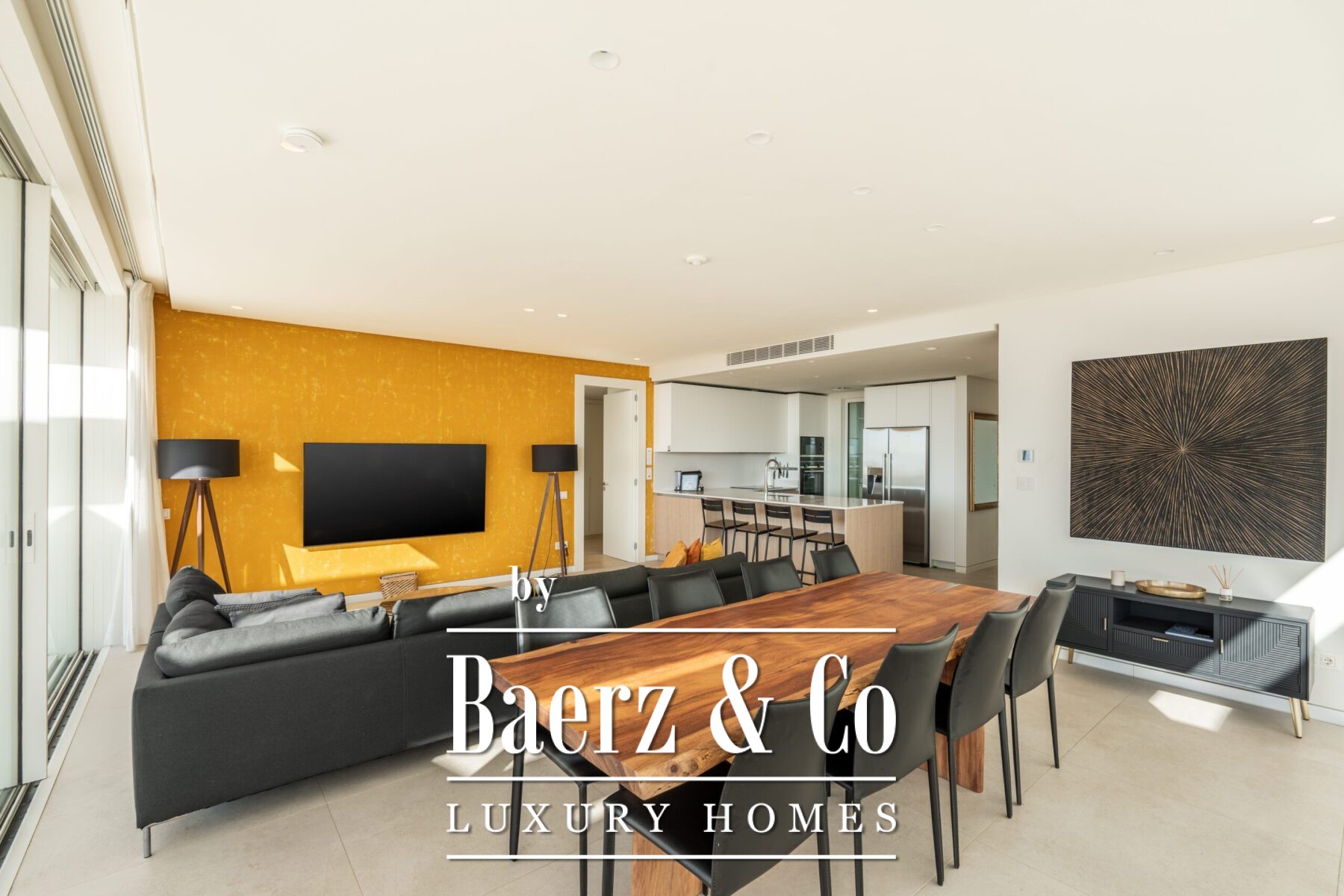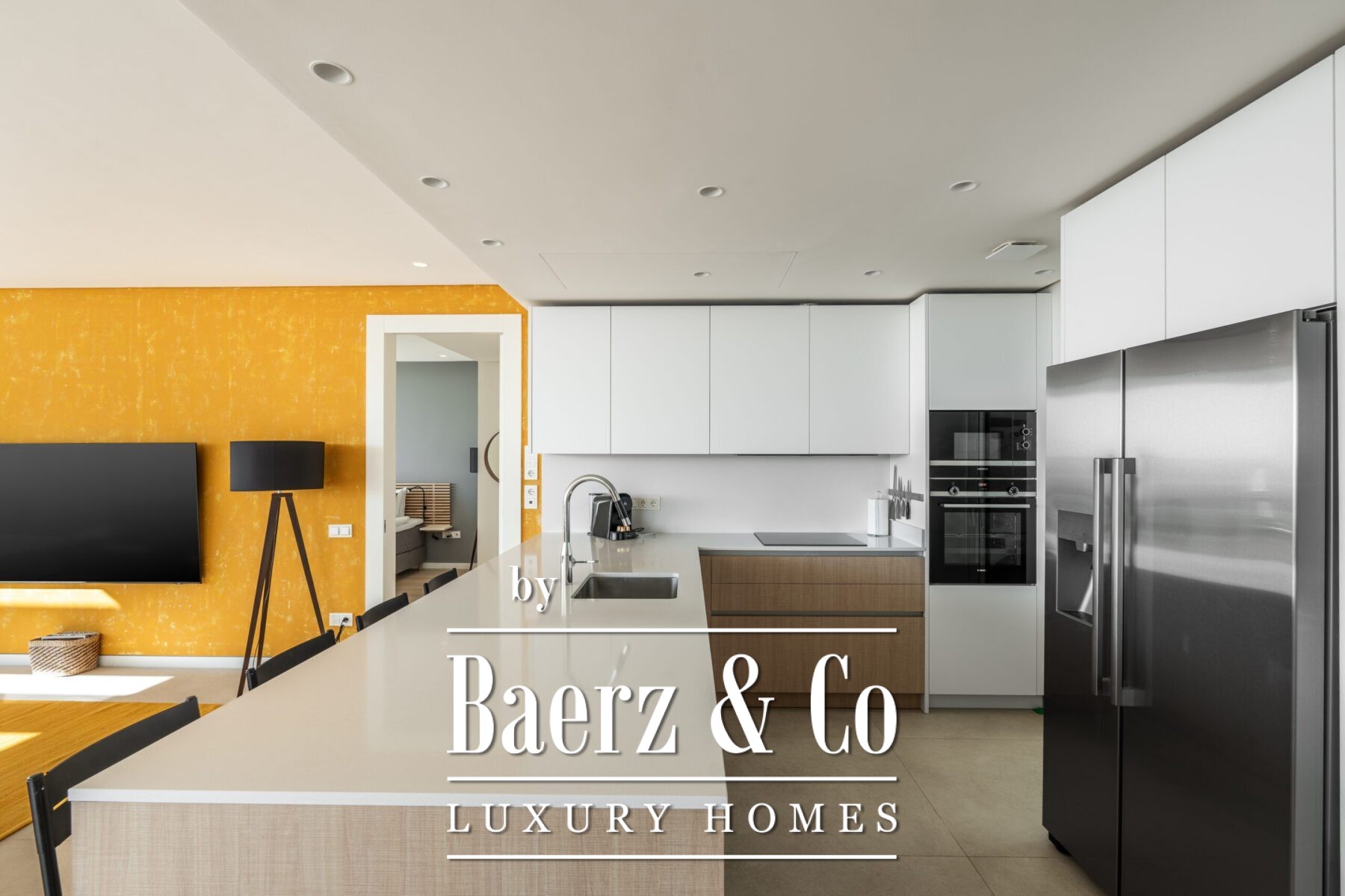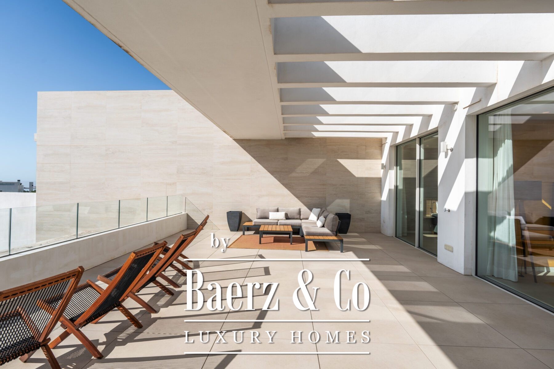 De open indeling combineert ruimte en geborgenheid, met een volledig uitgeruste keuken en een woon-eetgedeelte dat direct aansluit op het royale terras. Er zijn drie slaapkamers, elk met een eigen en-suite badkamer, waaronder een master suite met inloopkast en terras. Een gasten-wc en een aparte wasruimte met extra berging verhogen het dagelijkse comfort. Het penthouse wordt volledig gemeubileerd verkocht, is voorzien van airconditioning en vloerverwarming, en beschikt over een dubbele garage en een berging.