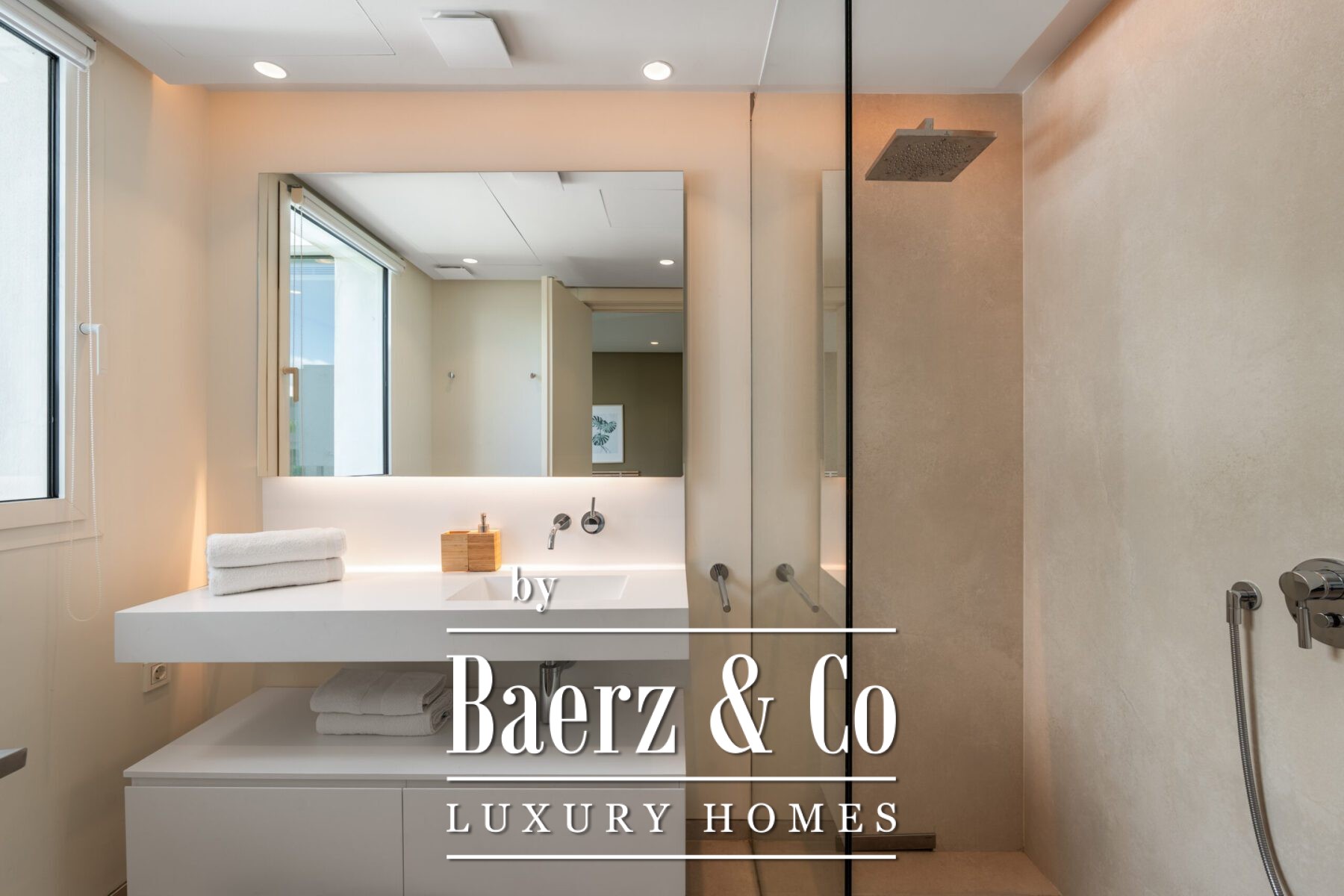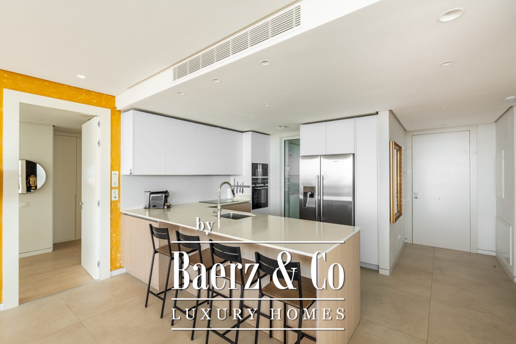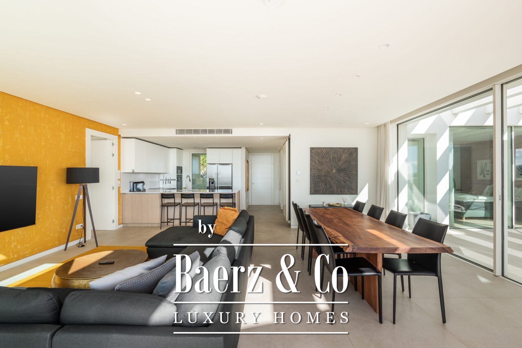 De open indeling combineert ruimte en geborgenheid, met een volledig uitgeruste keuken en een woon-eetgedeelte dat direct aansluit op het royale terras. Er zijn drie slaapkamers, elk met een eigen en-suite badkamer, waaronder een master suite met inloopkast en terras. Een gasten-wc en een aparte wasruimte met extra berging verhogen het dagelijkse comfort. Het penthouse wordt volledig gemeubileerd verkocht, is voorzien van airconditioning en vloerverwarming, en beschikt over een dubbele garage en een berging.