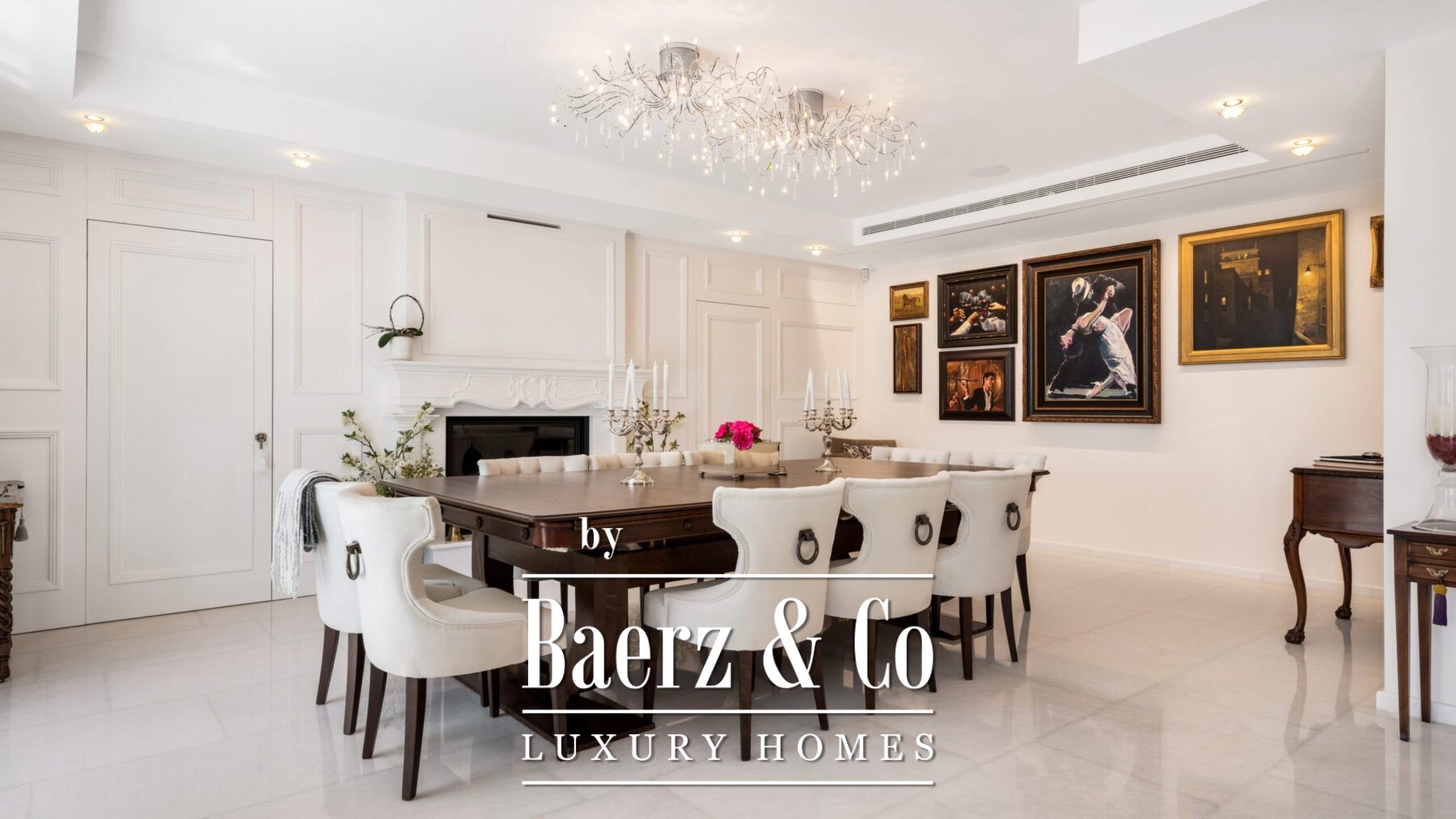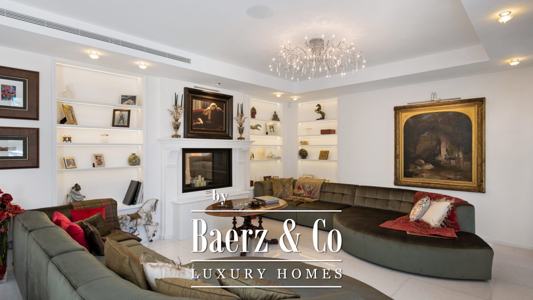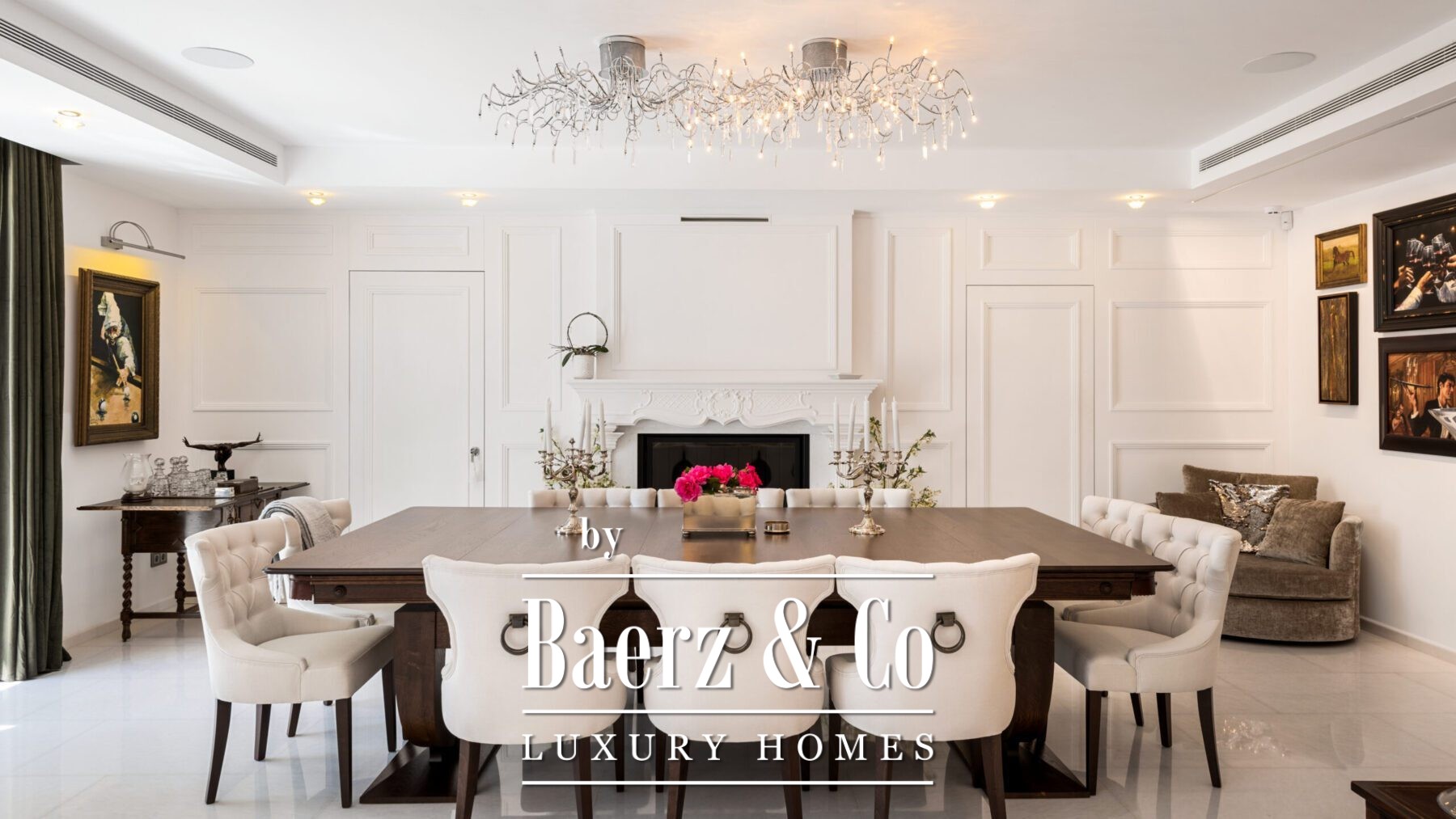 Het hoofdleefgedeelte ademt een verwelkomende sfeer, met een stijlvolle gebogen sofa, een moderne haard en zorgvuldig geselecteerde kunstwerken. De formele eetkamer, voorzien van een lange houten tafel, dubbele kroonluchters en een tweede haard, vormt het ideale decor voor stijlvol dineren. De keuken is uitgerust met taupe-kleurig maatwerk, donkerstenen werkbladen en een kookeiland. Aangrenzende eet- en loungehoeken met houten balken, een bar en directe verbinding met tuin, terrassen en het zwembad maken het plaatje compleet.