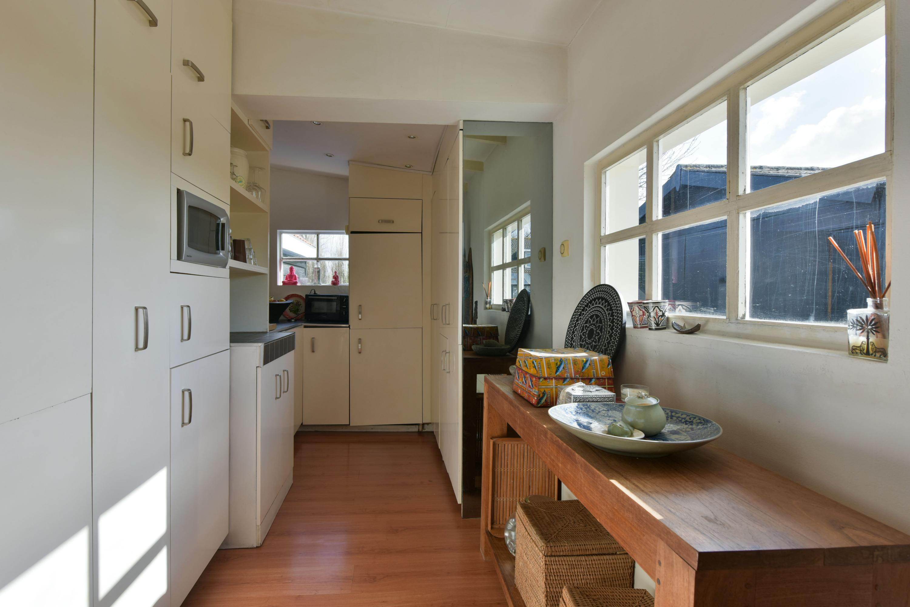 De open keuken is ruim opgezet en van alle gemakken voorzien. Het grote kookeiland met veel lades biedt volop werk- en opbergruimte, terwijl de kastenwand zorgt voor extra bergruimte. De keuken beschikt over een gasfornuis met afzuigkap, een heteluchtoven, koelkast en vaatwasser. Praktisch detail: de wasmachine, de wasdroger en cv-ketel zijn netjes weggewerkt in verschillende keukenkasten.