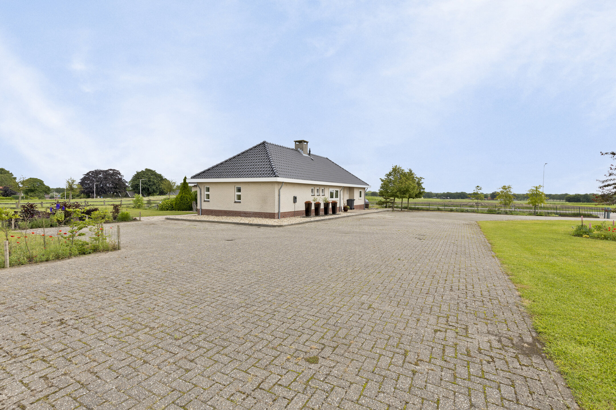 … want daar ligt een indrukwekkende 1.2ha op u te wachten. Aan de voorzijde wordt het perceel ontsloten door een elektrisch hek, waardoor u zo de garage inrijdt. Bovengrond parkeren kan ook, want de oprit heeft plek voor zeker acht auto’s. Tevens is er een laadpaal, dus u rijdt altijd met een volle batterij weg.
