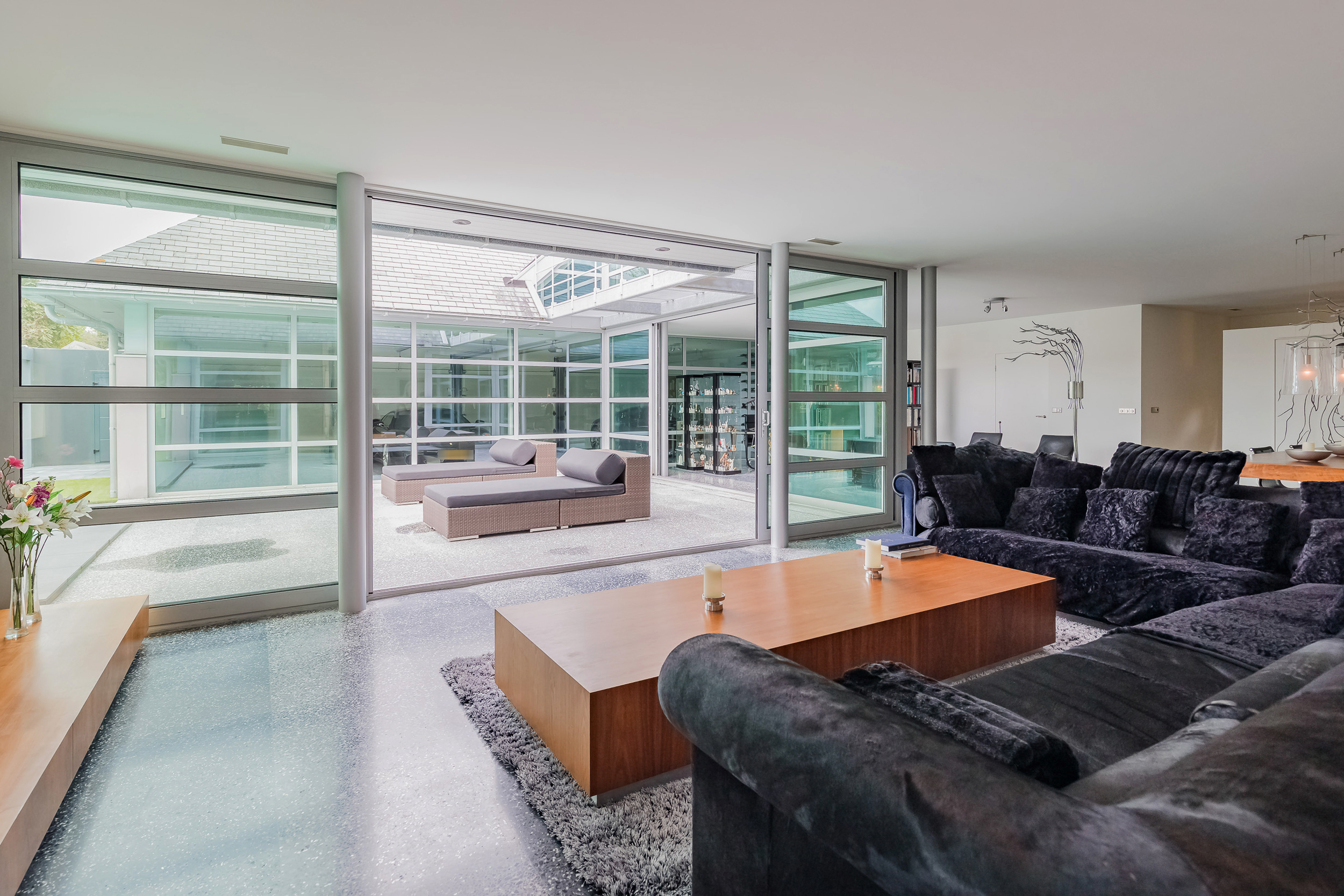 De gehele begane grond is voorzien van een terrazzovloer met vloerverwarming. Om de binnen/buiten beleving te versterken geven grote schuifpuien toegang tot de tuin en is de Terrazzovloer naar buiten doorgetrokken.