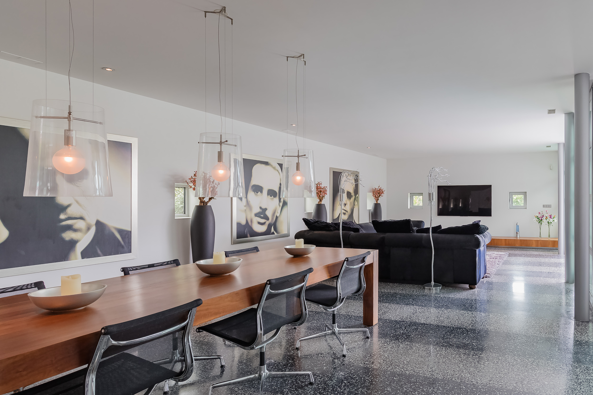 De inpandige garage van 76 m² is volledig geïsoleerd en ook hier is de terrazzo vloer voorzien van vloerverwarming. De glazen binnenwand is eenvoudig te verwijderen zodat de gehele begane grond één ruimte wordt. Het woonoppervlak komt hiermee op 356m² (€ 7.008,43 m²)