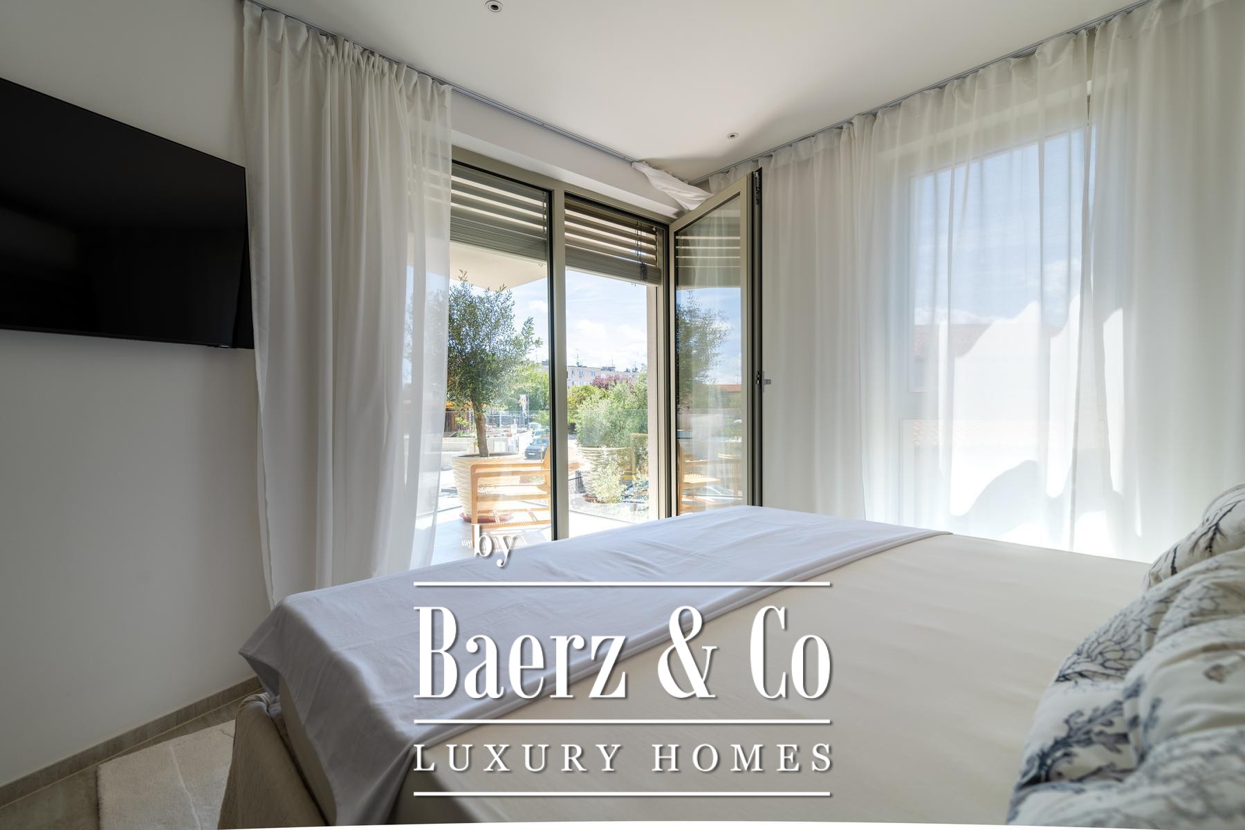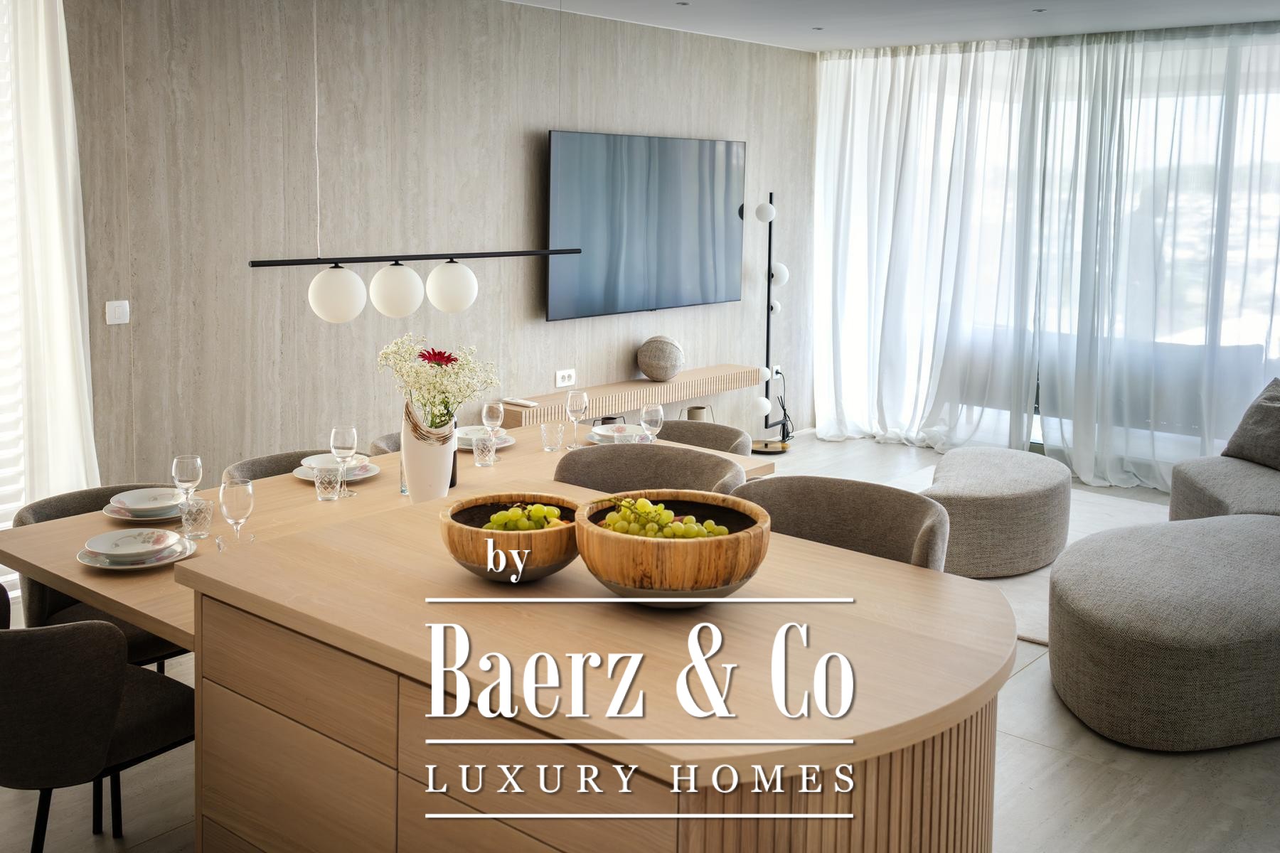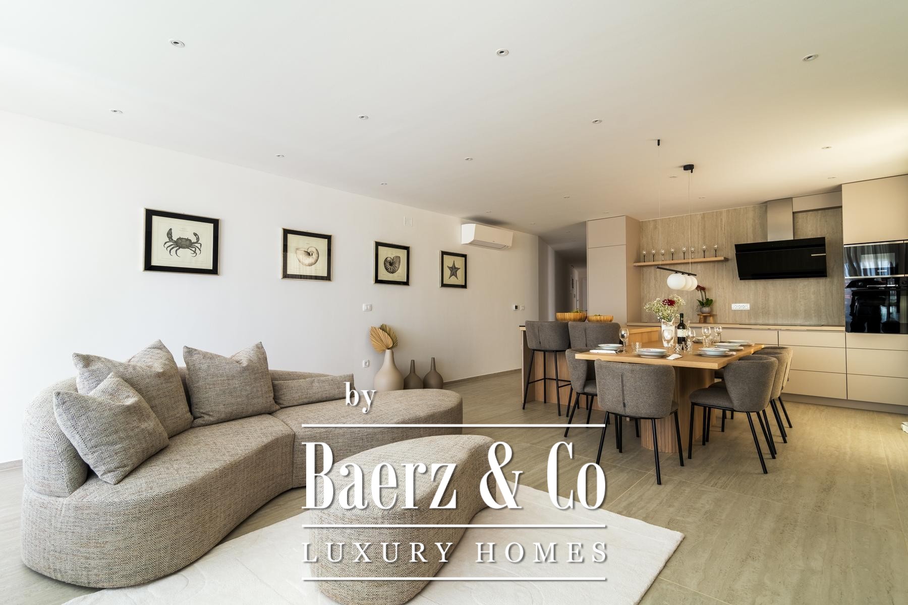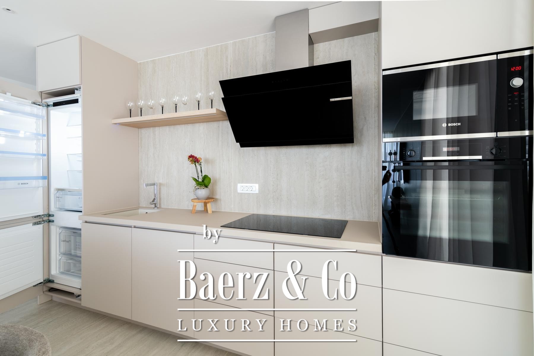Het open leefgedeelte wordt rijkelijk verlicht en vormt één geheel met de keuken, eetkamer en zitkamer. Via deze ruimte is de overdekte terras met panoramisch zeezicht toegankelijk. De master bedroom beschikt over een eigen badkamer en balkon, terwijl de twee andere slaapkamers een stijlvol ingerichte badkamer delen. Elk detail – van Bosch-apparatuur tot vloerverwarming en airconditioning – is gericht op comfort en kwaliteit. Het appartement biedt daarnaast twee parkeerplaatsen, een privéberging en toegang tot een verwarmd zoutwaterzwembad, een sauna en een fitnessruimte.