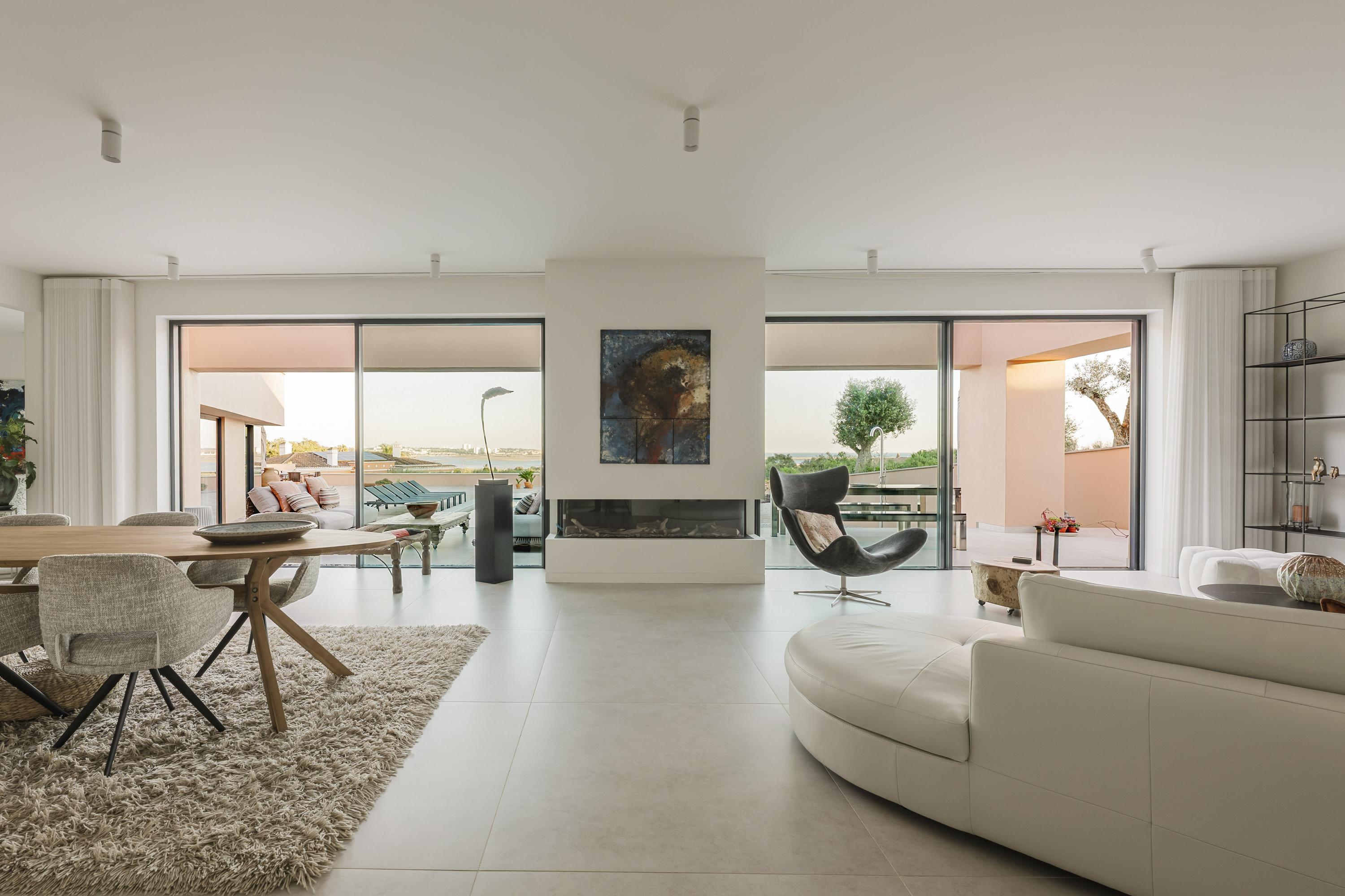 Licht, uitnodigend en met weids uitzicht over de Atlantische Oceaan en Palmares Golf. De naadloze overgang naar terras en zwembad creëert een moeiteloze binnen-buitenbeleving. Het voorste terras kan optioneel worden afgesloten met glas, waardoor een elegante all-season lounge of eetruimte ontstaat zonder het uitzicht te verliezen.