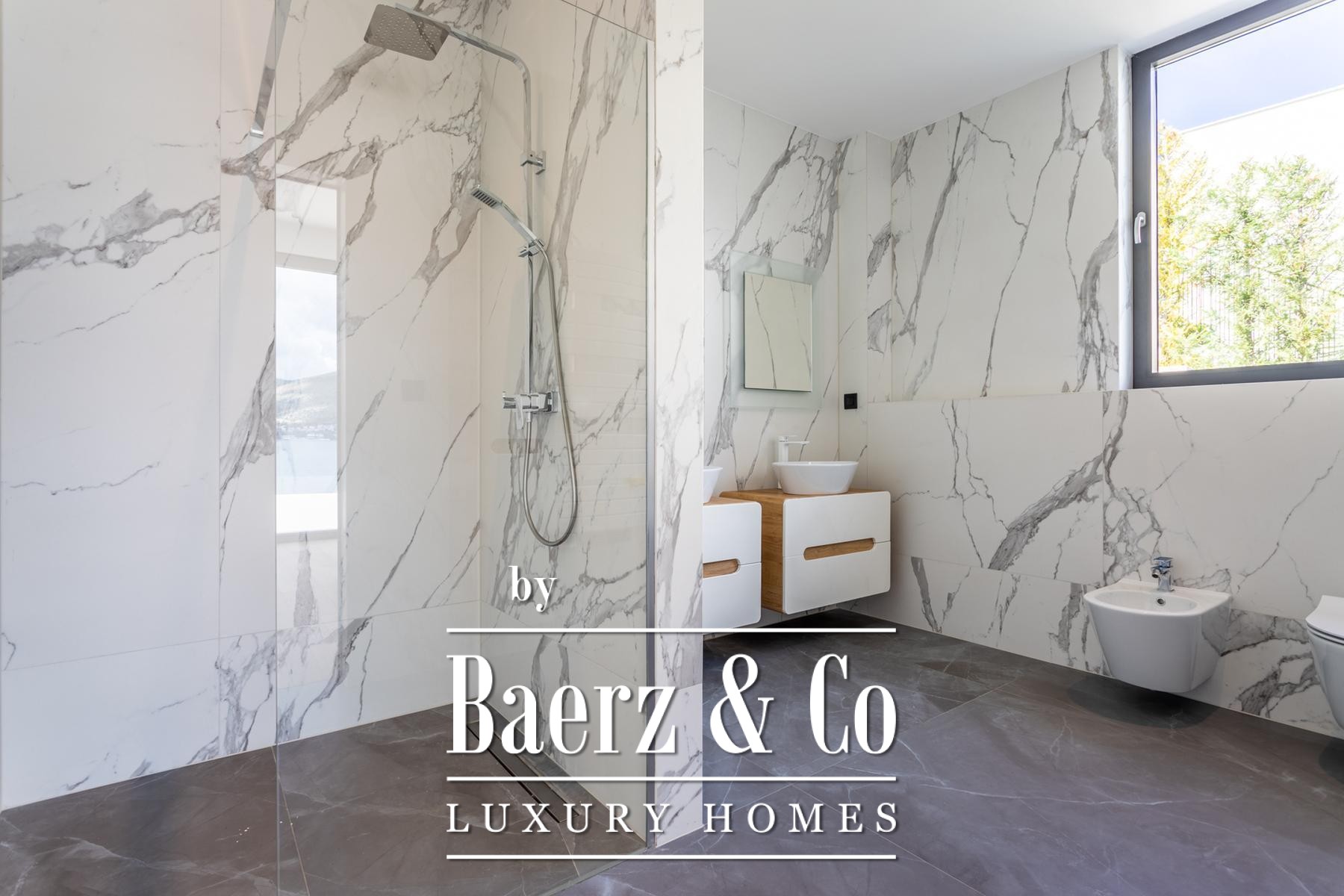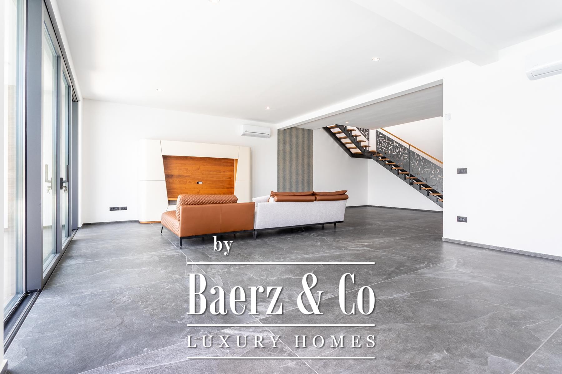 Alle vijf slaapkamers en badkamers zijn afgewerkt met hoogwaardige materialen: grootformaat keramische tegels, parketvloeren, driedubbele beglazing en elegante sanitaire voorzieningen. De woonkamer wordt rijkelijk voorzien van daglicht en sluit naadloos aan op een volledig uitgeruste keuken. Alle etages zijn via een lift verbonden, wat moeiteloze toegankelijkheid garandeert.