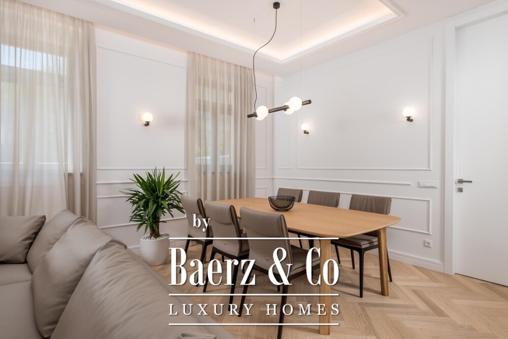 Appartement Opatija belichaamt verfijnd stedelijk wonen en biedt een zeldzaam uitzicht midden in het centrum van de stad. Deze recent gerenoveerde beganegrondwoning van 91,67 m² is met uiterste zorg voor kwaliteit en verhouding afgewerkt. Bij binnenkomst ontvouwt zich een royale hal die leidt naar de woonkamer; keuken en eetruimte zijn hier naadloos geïntegreerd, badend in natuurlijk licht en omkaderd door panoramische vergezichten over stad en zee.