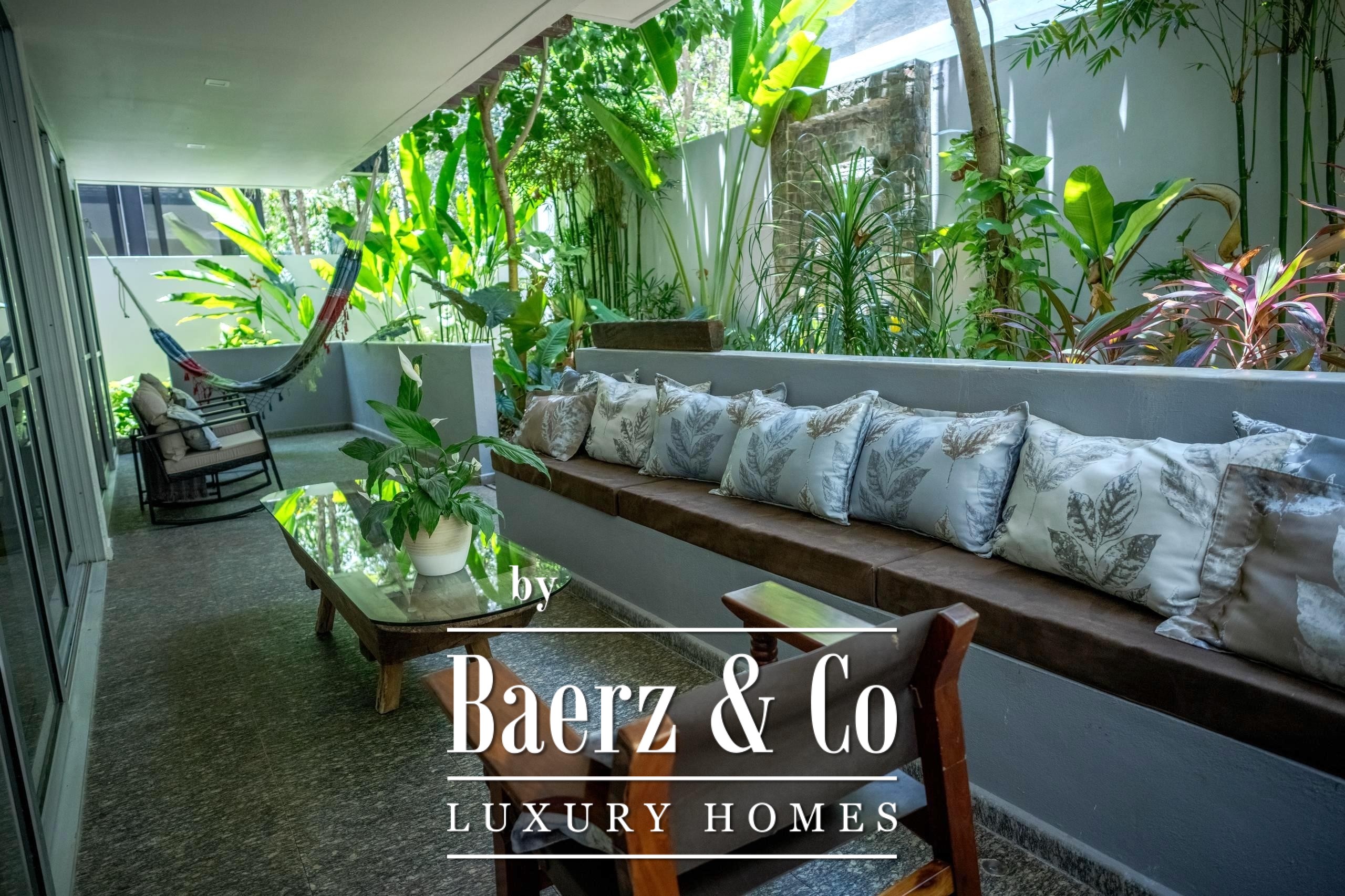 En planta baja, disfruta de una sala-comedor amplia con ventanales corredizos que se abren completamente hacia una terraza integrada con un hermoso jardín tropical, creando un ambiente ideal para el descanso o la convivencia. La cocina equipada cuenta con barra integrada al comedor, cubierta de granito negro y carpintería en madera, perfecta para quienes aman cocinar o recibir invitados.