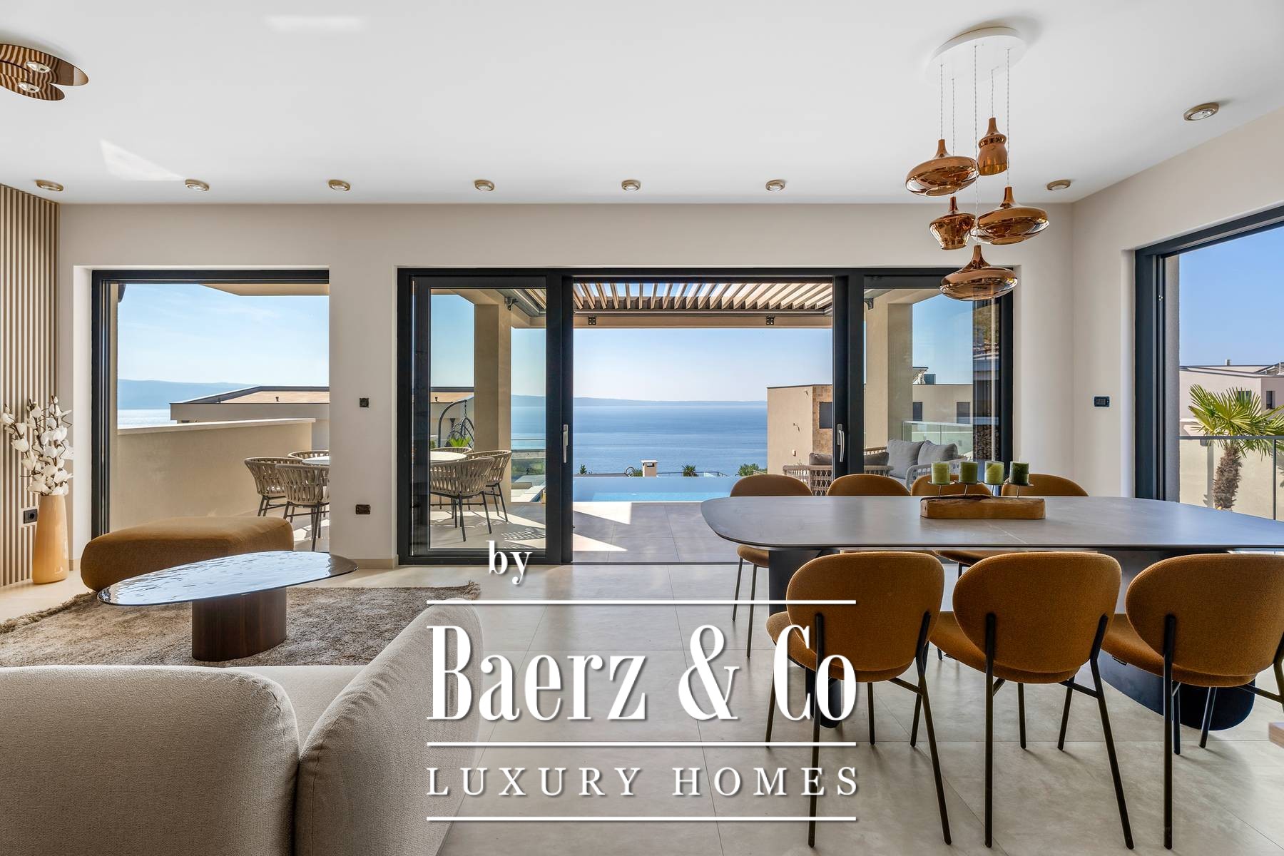 Villa Podstrana met panoramisch zeezicht is gelegen op een verhoogd perceel van 640 m² en biedt uitzonderlijke privacy, op slechts 300 m van de Adriatische kust. Deze villa in Podstrana beslaat 355 m² verdeeld over vier niveaus en combineert modern design met hoogwaardige bouwkwaliteit en een ingetogen gevoel van luxe. De oprijlaan is omheind en biedt plaats aan drie auto's, waarna men binnenkomt in een interieur waar ruimtelijk ritme samengaat met zorgvuldig geselecteerde materialen. Vijf slaapkamers bieden plaats aan gasten, waarvan vier beschikken over een en suite badkamer, terwijl de riante leefruimtes naadloos overgaan in terrassen, een zonneterras en een overloopzwembad van 32 m² met verwarmd water en panoramisch uitzicht op zee.