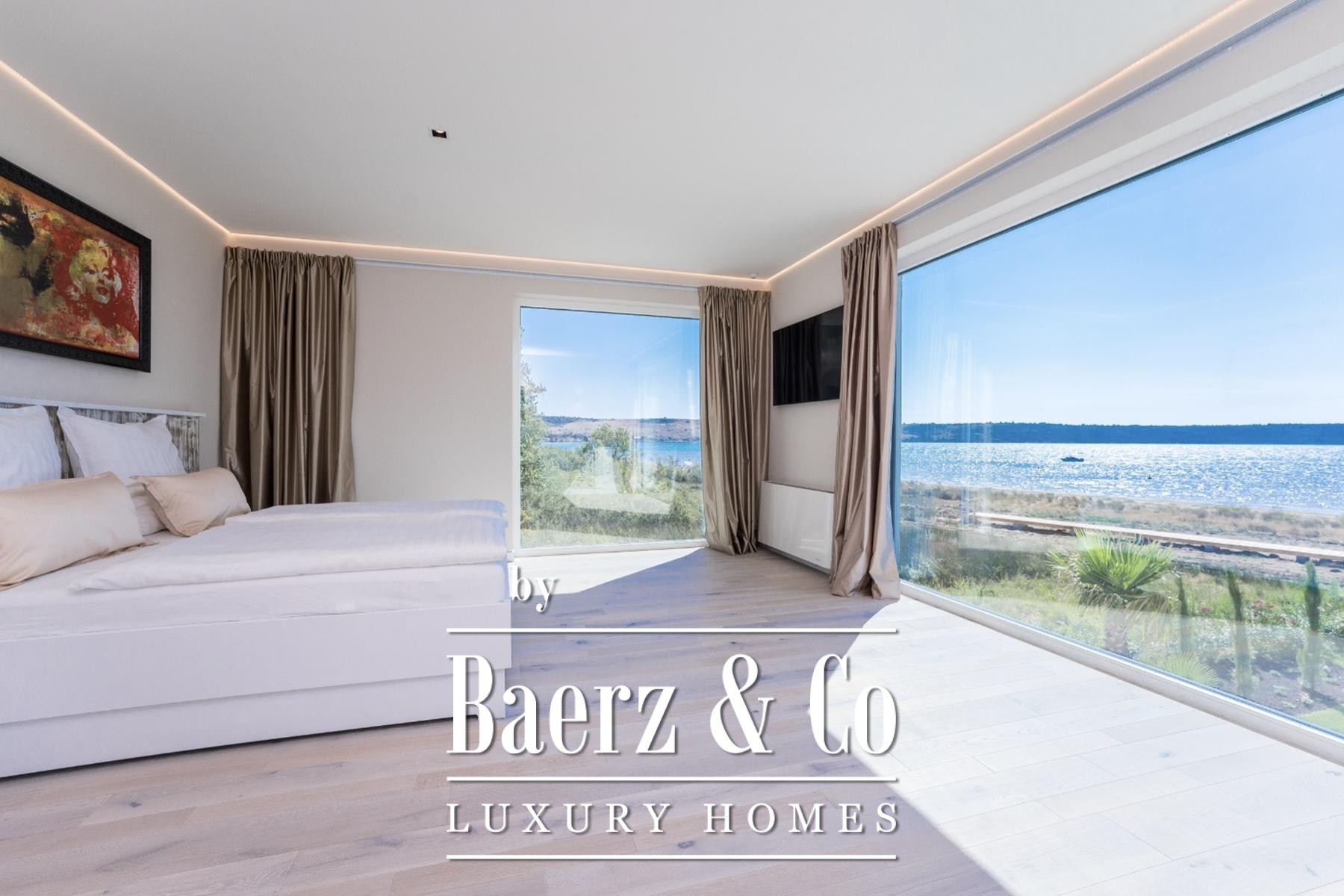 Op de eerste verdieping bevinden zich drie slaapkamers, elk met inbouwkast en eigen badkamer. De master suite beschikt bovendien over een privébalkon met zeezicht. De tweede verdieping biedt een dakterras van 110 m², ingericht als een privé wellnessruimte met sauna, jacuzzi, badkamer, buitenkeuken, eetgedeelte voor tien personen en een lounge, uitgerust met een Bluetooth-geluidssysteem en een onbelemmerd uitzicht over zee en Velebitgebergte.