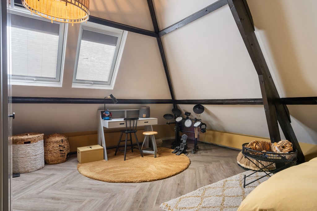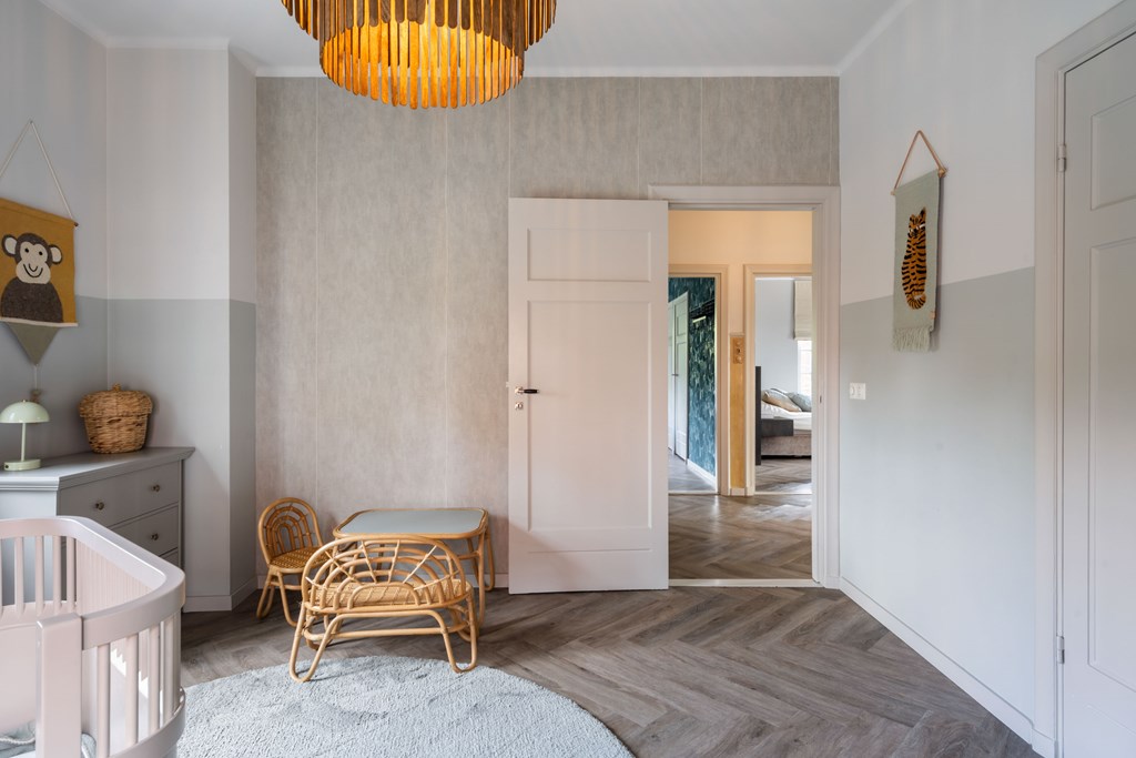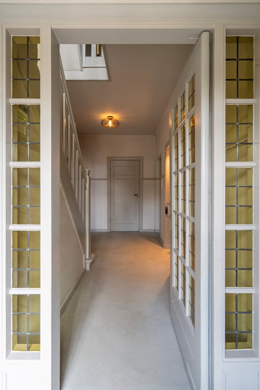 Wanneer u vanuit de hal naar de eerste verdieping gaat, komt u uit bij de indrukwekkende trap die als een rode draad door het huis loopt. Deze statige trap, een blikvanger in de woning, leidt u naar de bovenverdieping.