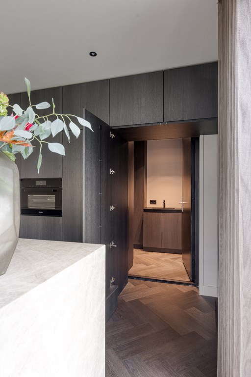Achter een onopvallende deur bevindt zich de praktische bijkeuken, met ruimte voor opslag en huishoudelijke apparatuur. Deze ruimte grenst bovendien aan een extra kamer die zich uitstekend leent als werk-, hobby- of speelruimte.