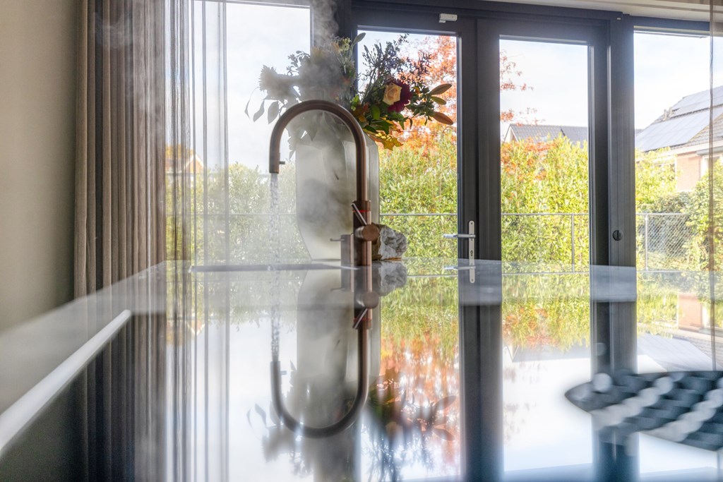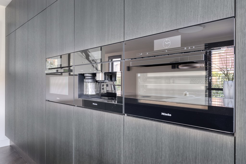 De moderne leefkeuken vormt het hart van het huis en is uitgerust met hoogwaardige apparatuur. Het keukenblad is uitgevoerd in Pure Kwartsiet, een stijlvol en duurzaam natuursteen. U kookt op een Bora inductiekookplaat met geïntegreerde afzuiging, terwijl de Miele-ovens en inbouw koffiemachine en de grote koelkast, vriezer en vaatwasser van Siemens zorgen voor optimaal kookcomfort. De keuken biedt voldoende ruimte voor een royale eettafel en heeft openslaande deuren naar het terras, waardoor u direct buiten kunt dineren of ontspannen.