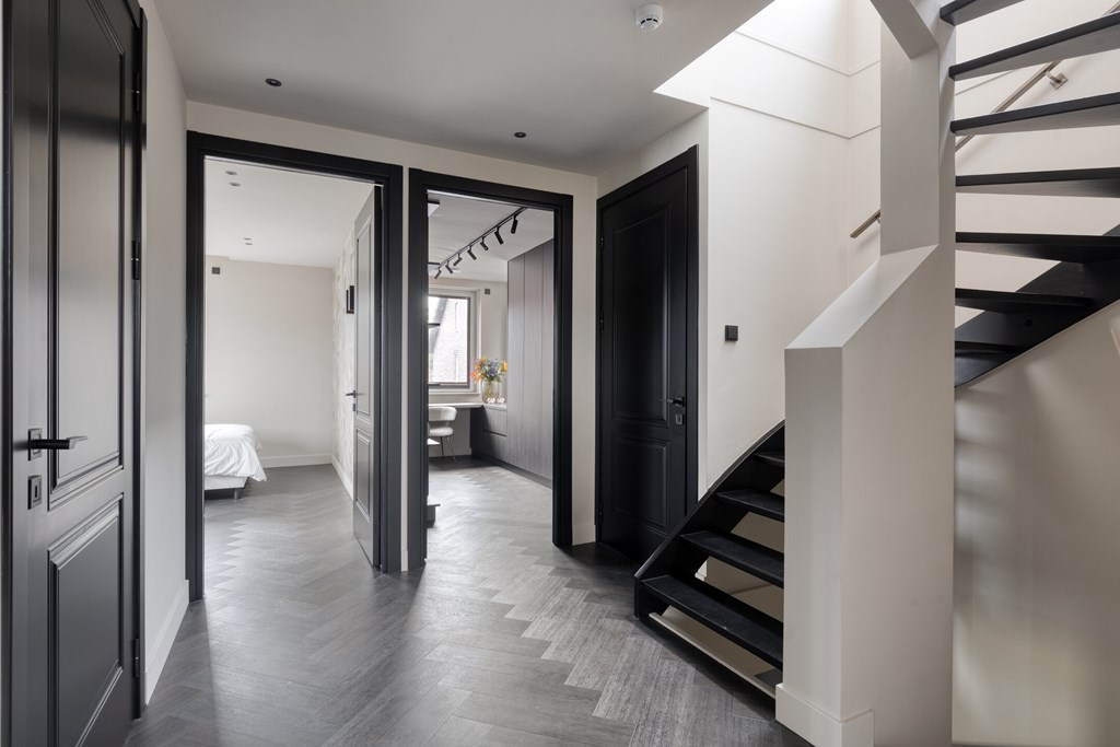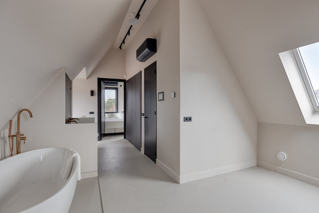 De moderne badkamer is volledig betegeld en voorzien van een inloopdouche met glazen wand, een dubbele wastafel met spiegel en Sonos-speaker. Op de overloop bevindt zich een separate toiletruimte met zwevend toilet. Alles straalt kwaliteit en comfort uit.
