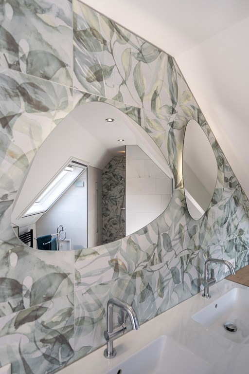 De overloop geeft toegang tot drie slaapkamers en een badkamer. De royale masterbedroom beschikt over een eigen en suite badkamer en is uitgerust met airconditioning voor extra comfort. De dubbele openslaande deuren van de slaapkamer geven u toegang tot een balkon, waar u een prachtig weids uitzicht heeft op de groene tuin. Grenzend aan de slaapkamer komt u in een ruime kastenkamer met daglicht. De tweede en derde slaapkamer liggen aan de voorzijde van het huis en beschikken beide over een ruime inbouwkast, ruimte voor een groot bed en een bureau, een openslaande deur naar het balkon aan de voorzijde en airconditioning. De schuine wanden, hoge nokken en zichtbare houten balken geven de hele verdieping een sfeervolle, karakteristieke uitstraling.