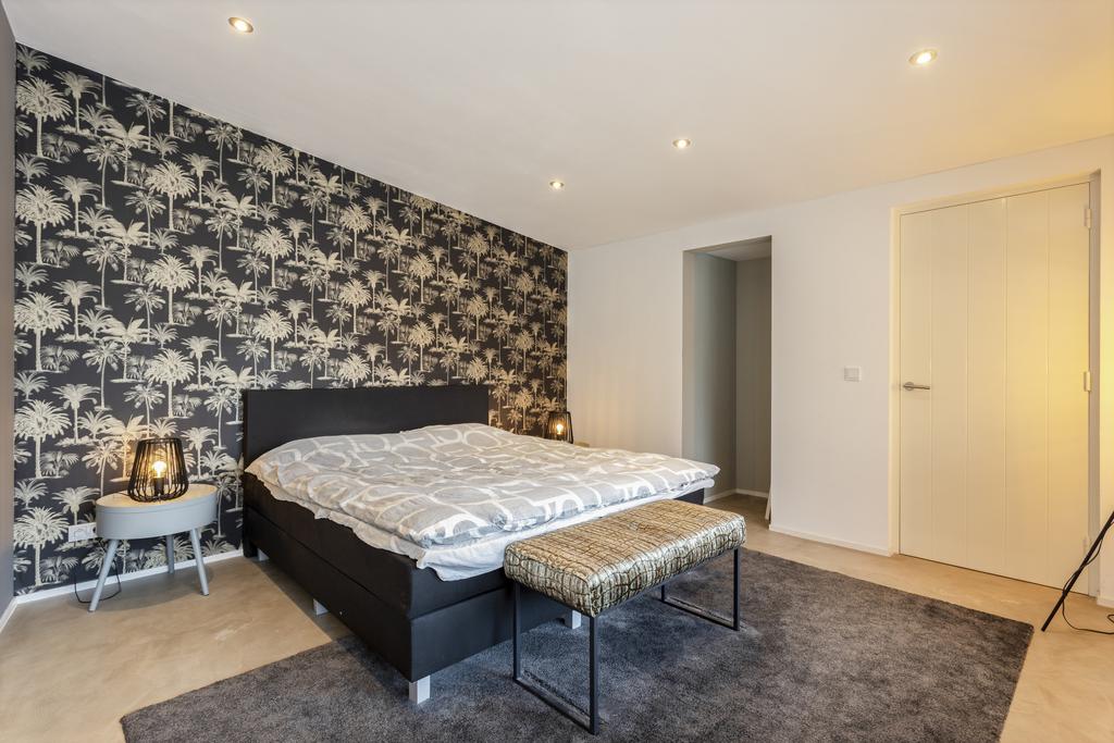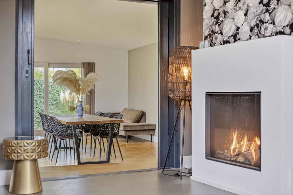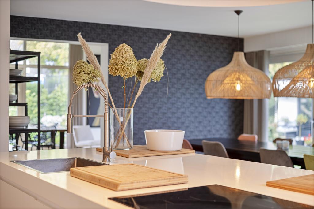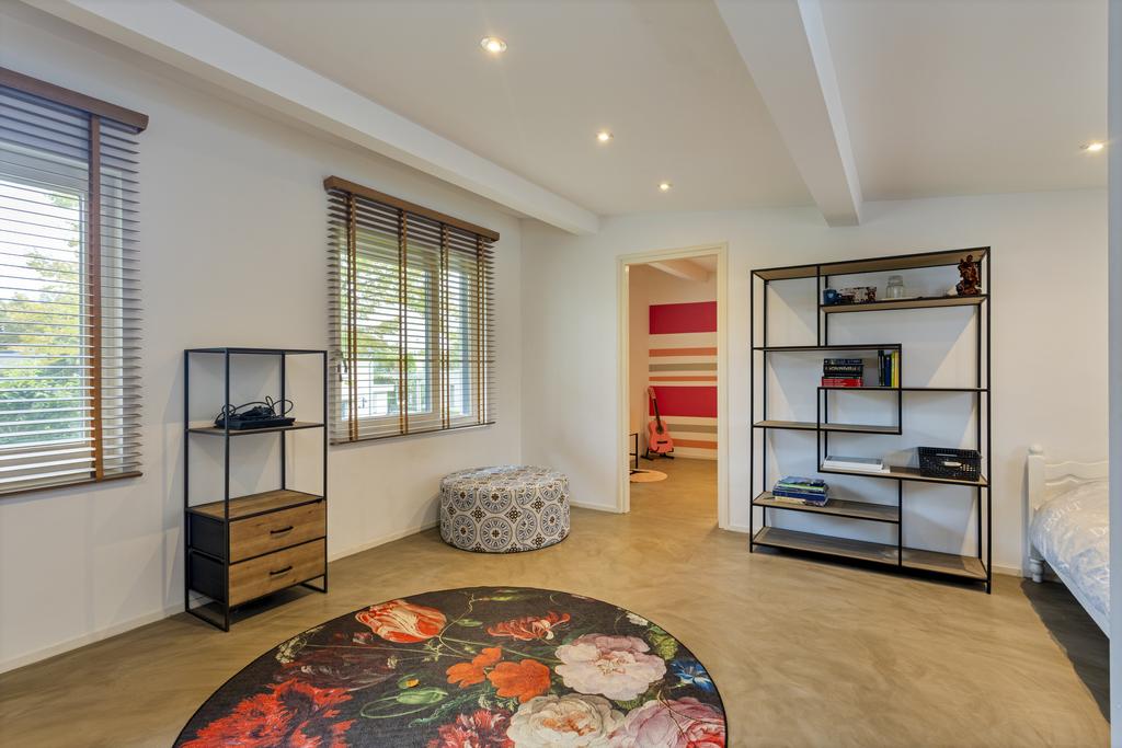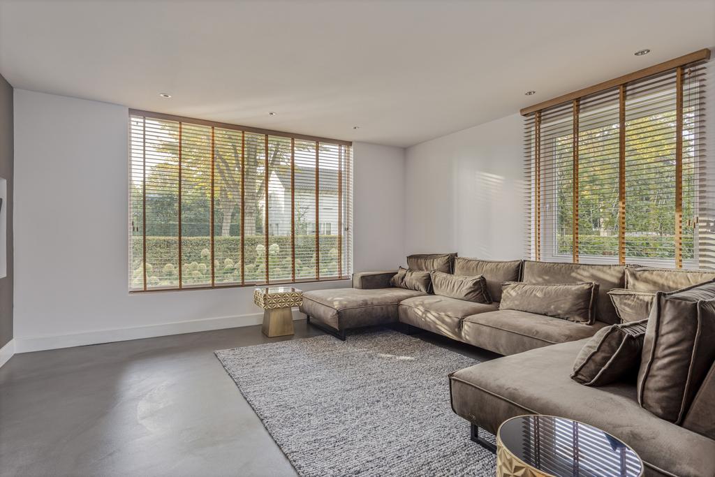 Begane grond: entree, ruime ontvangsthal en doorgang naar de linker- en achtervleugel van de woning met leuke, speelse hoogte verschillen en een knusse, doch ruime TV- kamer (ca. 22 m2) met haardpartij, eetkamer (ca. 30 m2) met fraai tuincontact en de zeer fraaie leef- keuken (ca. 36 m2) eveneens met prachtig tuincontact. De zij- en achtertuin zijn middels een viertal schuifpuien te bereiken. Alle ruimtes zijn of met een betonlook vloer of met een houten visgraad vloer afgewerkt. De keuken is uitgevoerd in een eilandopstelling en voorzien van alle benodigde inbouwapparatuur.