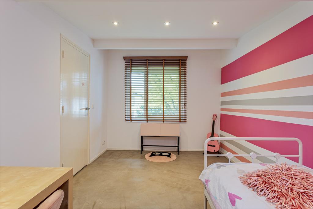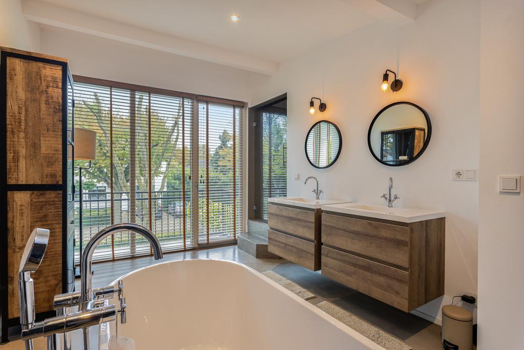 1e verdieping: overloop, 3 volwaardige slaapkamers waarbij de master bedroom de beschikking heeft over een inbouw schuifkastenwand. De slaapkamers zijn allen volwaardig qua grootte, de badkamer is ook weer royaal en fraai ingedeeld met een ligbad, dubbele vaste wastafel, douche en een flinke raampartij met Frans balkon. De verdieping biedt dezelfde sfeer als de begane grond.