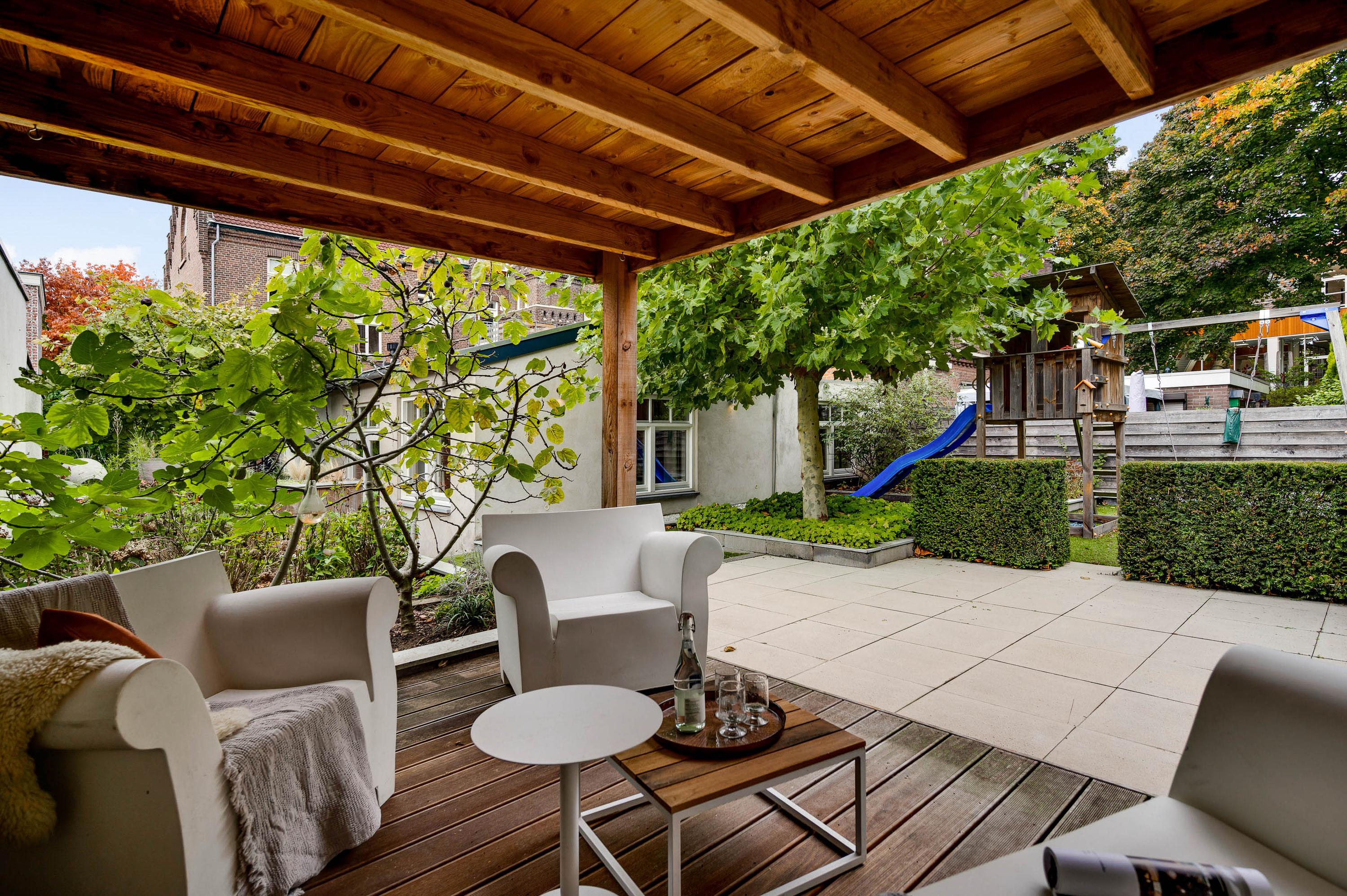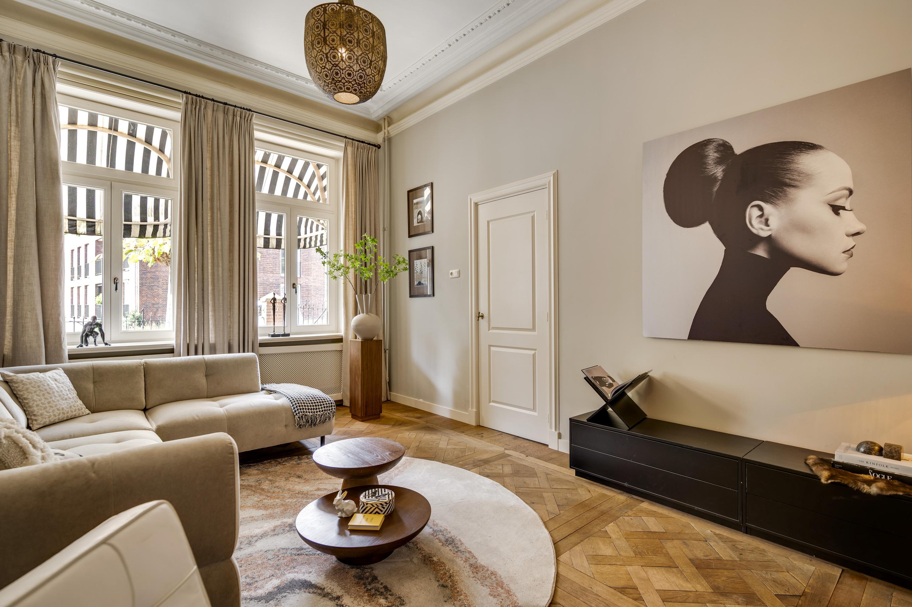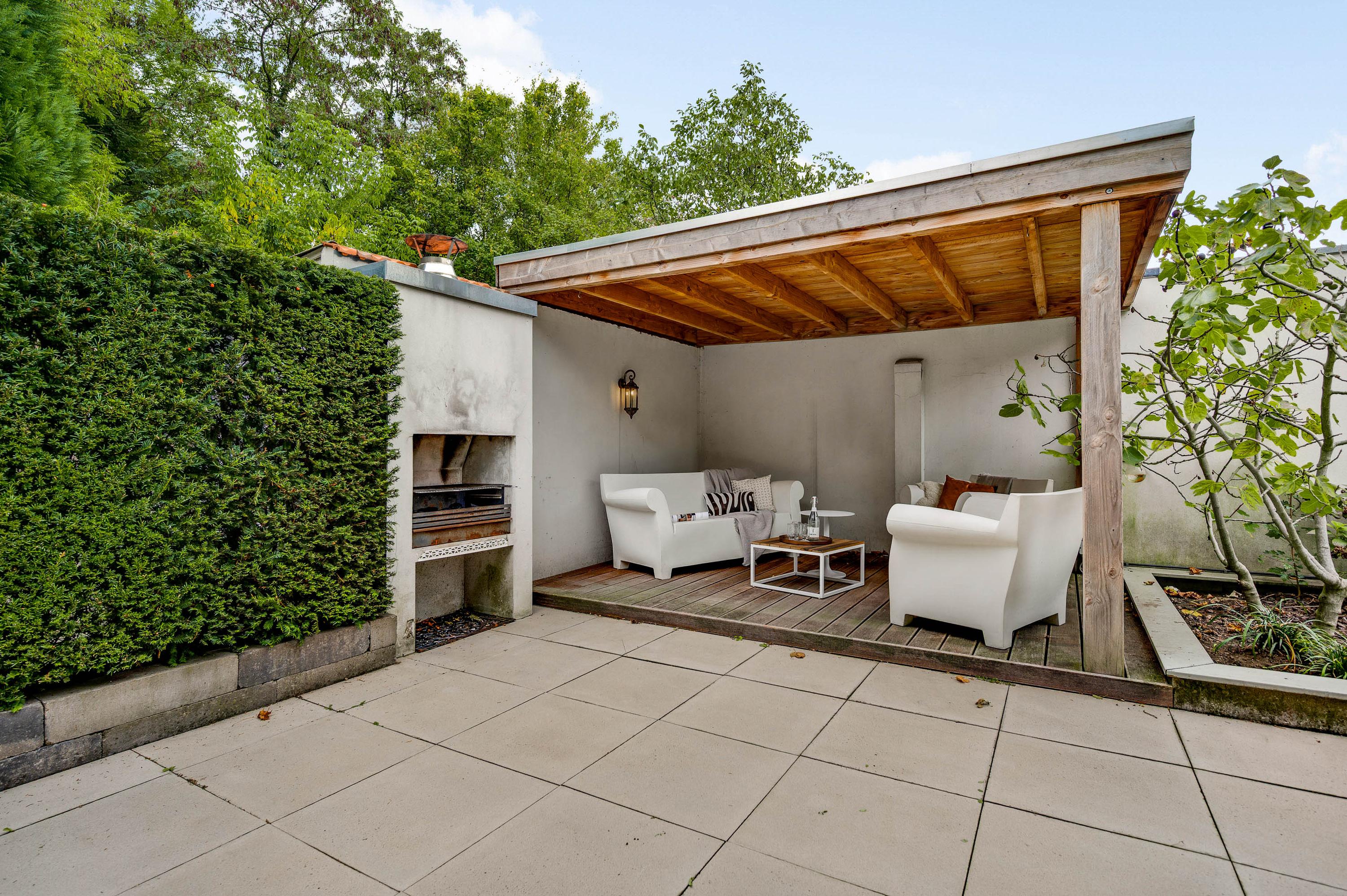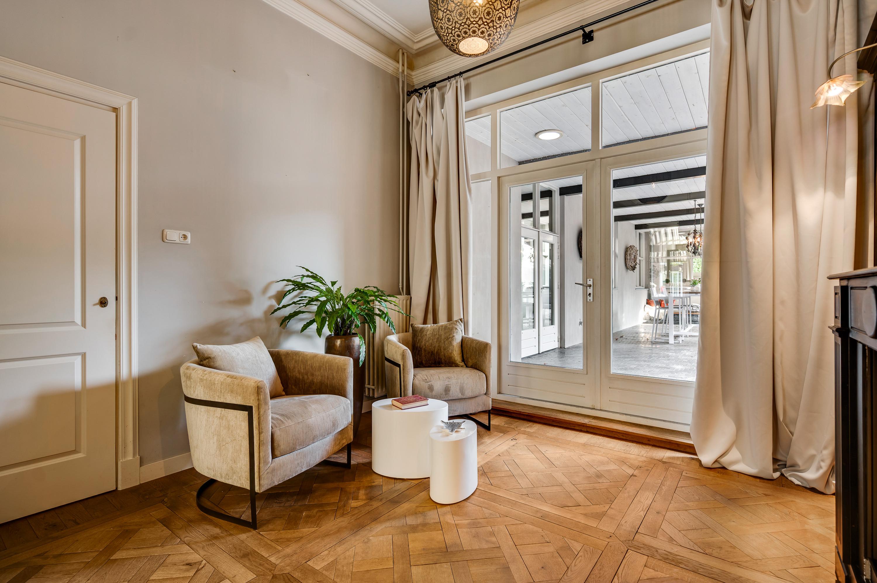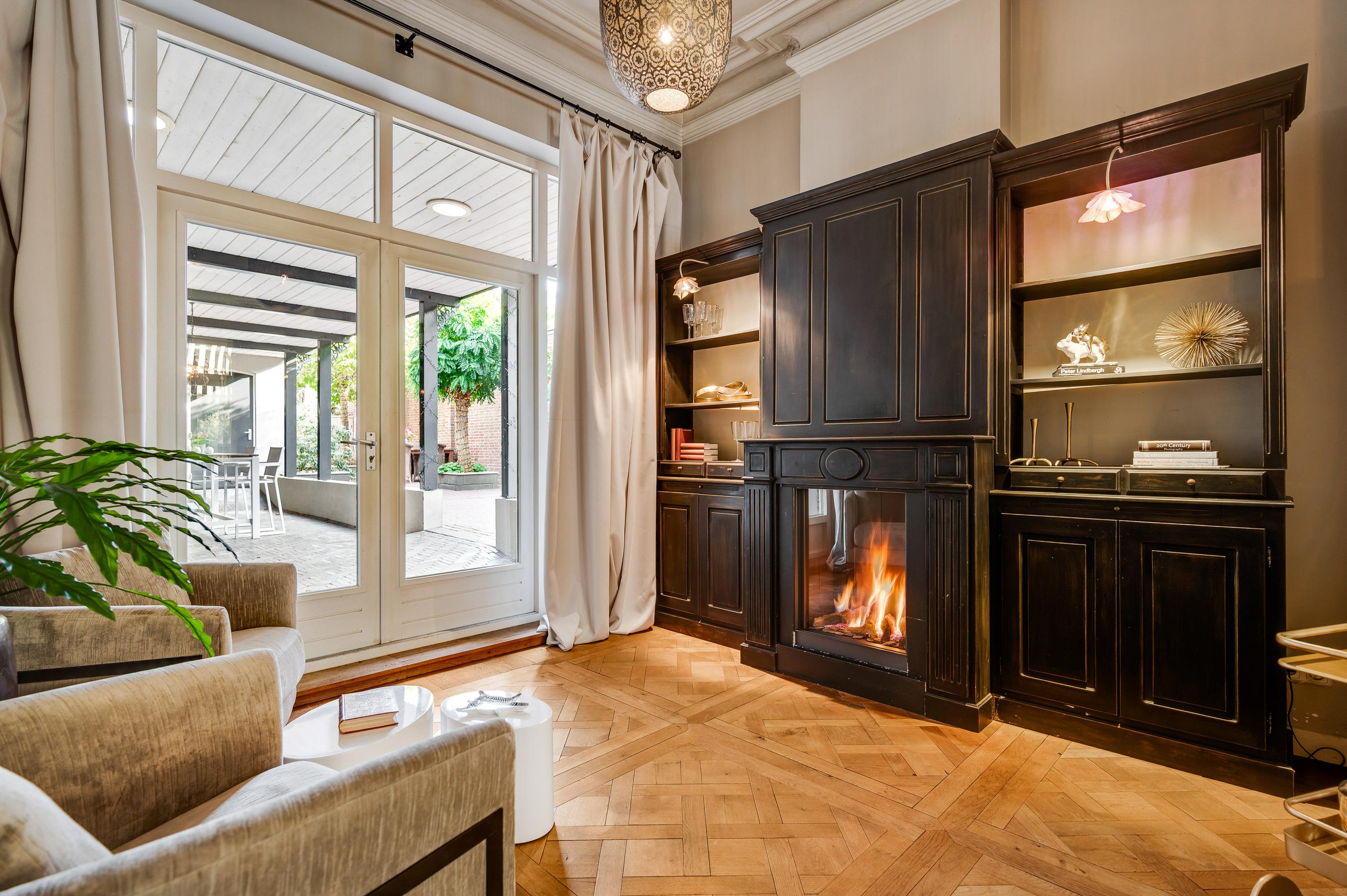 Bij binnenkomst wordt u direct omarmd door de warme sfeer en verfijnde afwerking. De imposante woonkamer van bijna tien meter lengte vormt het hart van het huis. Hier ligt een prachtige Versailles-parketvloer, die in combinatie met de design gashaard en de hoge raampartijen zorgt voor een ambiance van exclusieve rust. Via de openslaande tuindeuren loopt de ruimte naadloos over in het overkapte terras en de stijlvolle stadstuin – een privé-oase midden in de stad.
