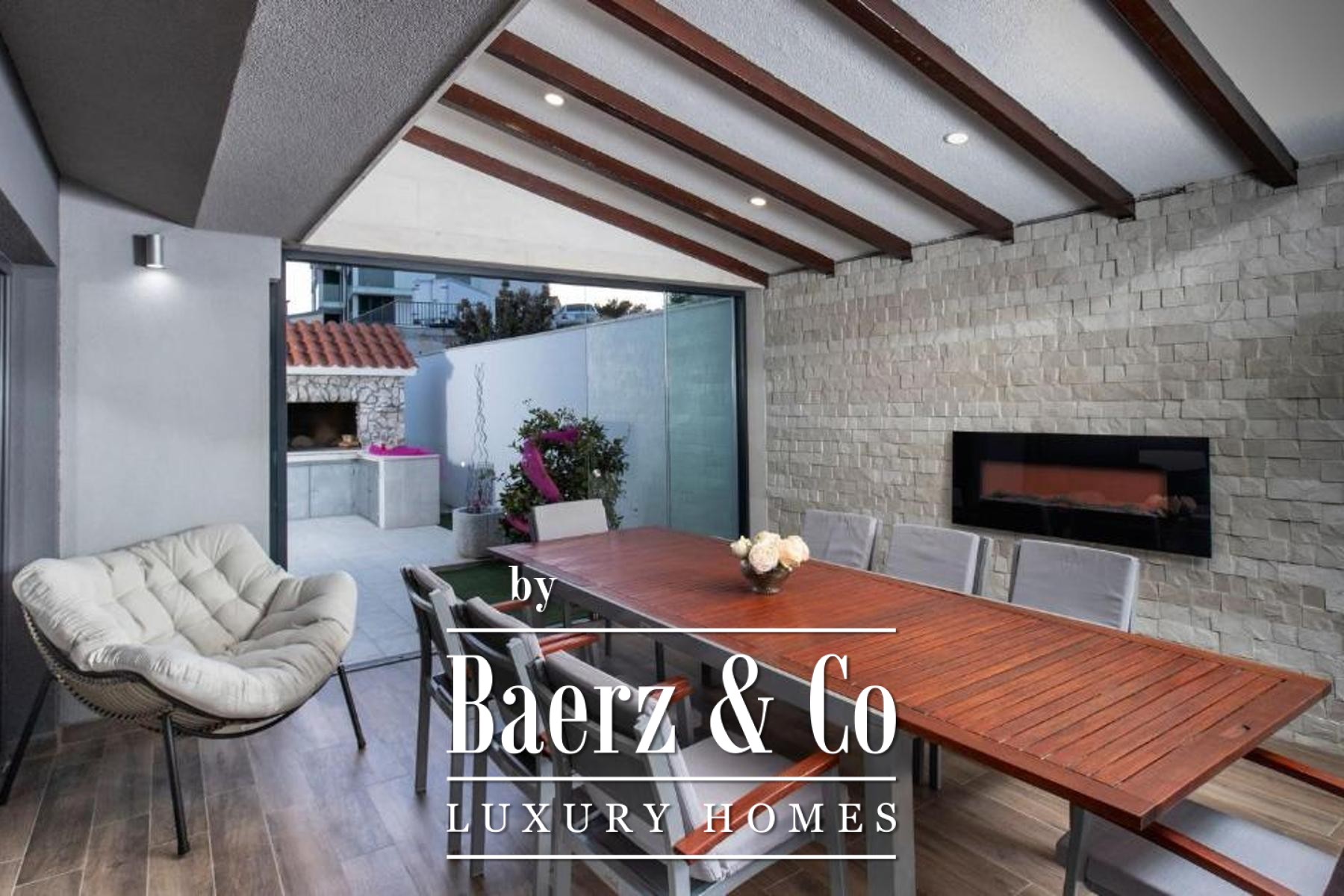 De bovenverdieping biedt een lichte leefruimte met keuken en eetgedeelte, twee slaapkamers en twee badkamers, waarbij elke hoofdruimte toegang biedt tot balkons met uitzicht op zee en zwembad. Flexibiliteit staat centraal, want de eerste verdieping kan worden gescheiden in zelfstandige appartementen om tegemoet te komen aan diverse woonwensen of voor eventuele gastverblijven. Verfijnde afwerkingen en hoogwaardige inrichting kenmerken elk detail, terwijl doordachte voorzieningen zoals een taverne met barbecue, een uitnodigende eet- en ontmoetingsruimte en een zonnige tuin bijdragen aan het wooncomfort. Drie parkeerplaatsen maken het geheel compleet, voor ontspanning en mogelijkheden aan de prachtige Kroatische kust.