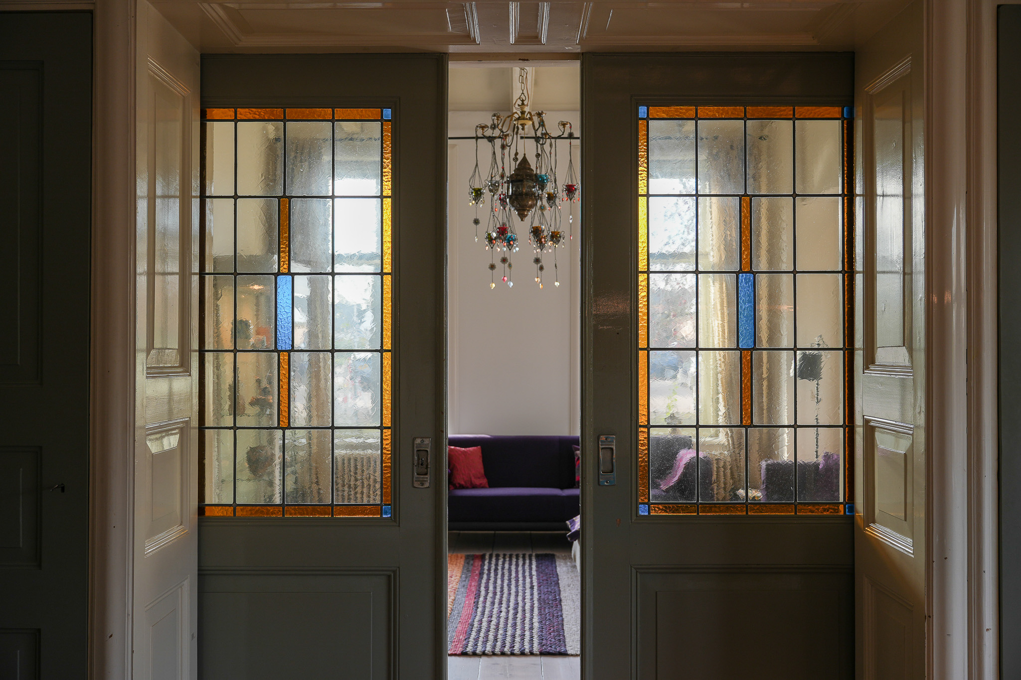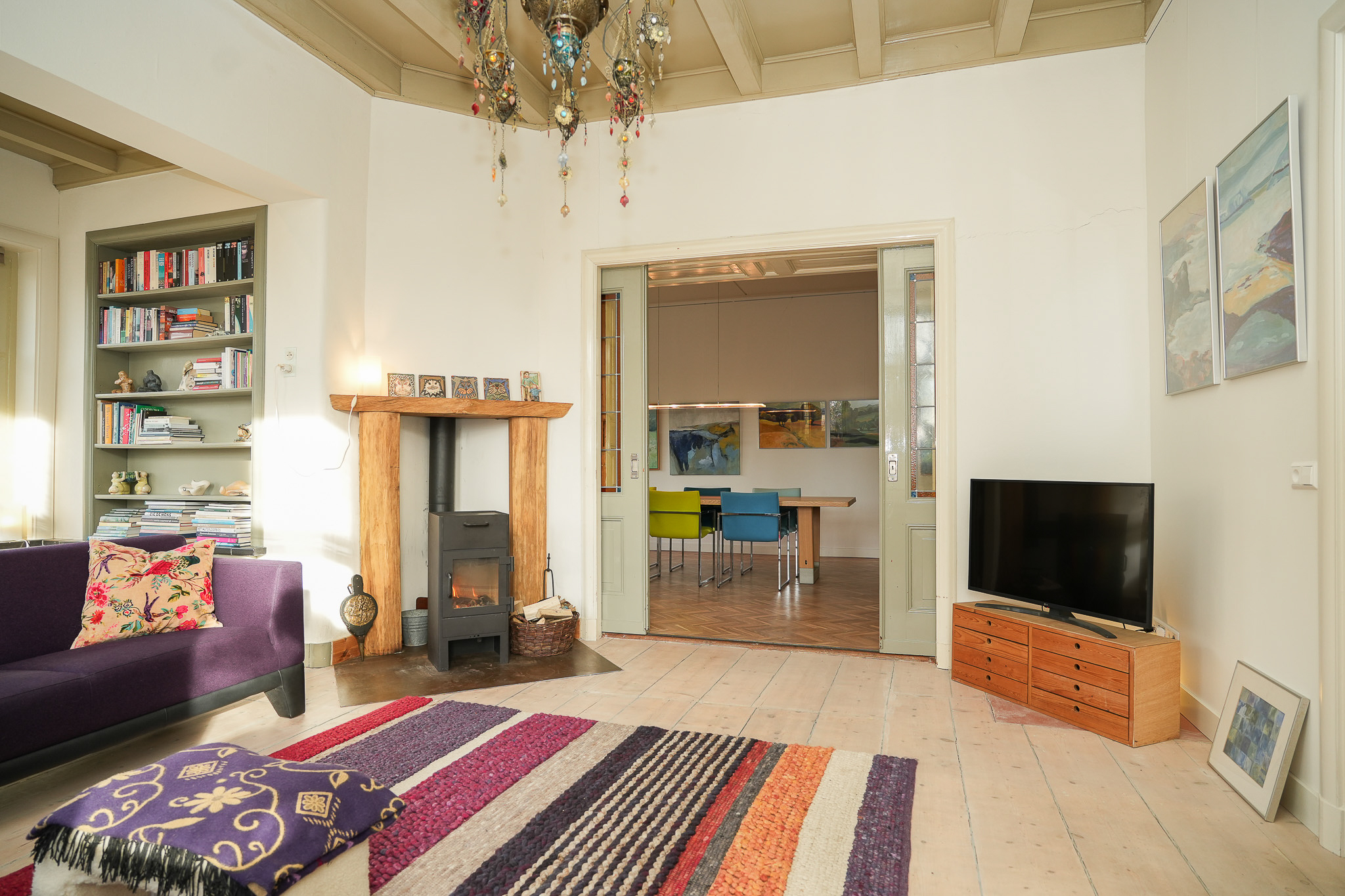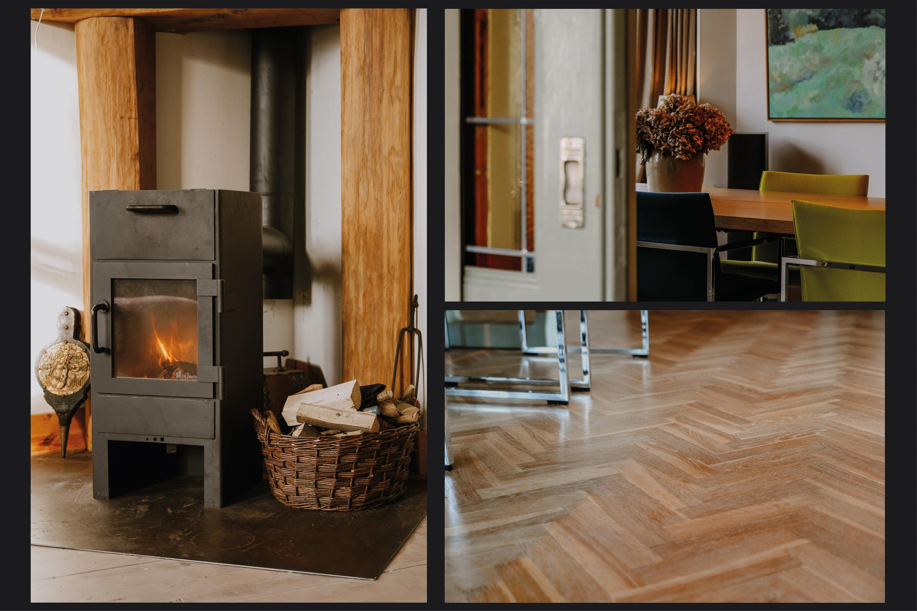 De entree voert naar een L-vormige gang, die toegang geeft tot de verschillende vertrekken, waar licht en hoogte meteen opvallen. Halverwege de gang bevindt zich de fraaie trap naar de eerste verdieping met een karakteristiek bordes. Aan de voorzijde ligt de woonkamer en suite, verdeeld in een zit- en eetgedeelte. Deze ruimte wordt gekenmerkt door originele schuifdeuren met glas-in-lood en een erker. In het eetgedeelte zorgen de parketvloer en vaste inbouwkasten voor een rustige en verzorgde uitstraling; in het zitgedeelte dragen het balkenplafond, de maatwerk wandkasten en de stoere houtkachel bij aan een warme, huiselijke sfeer.
