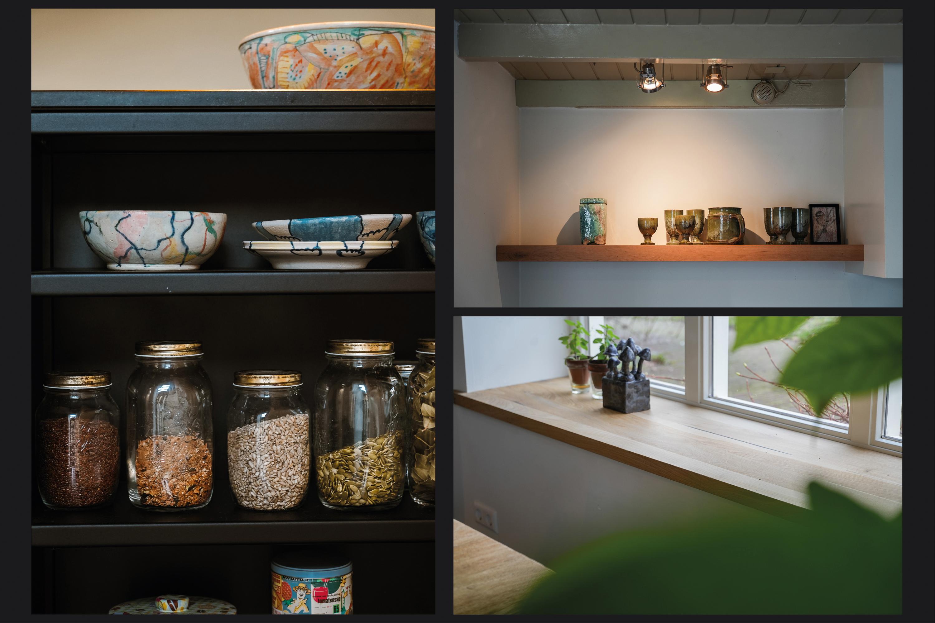 Entree en gang met granitovloer, voorkamer met houtkachel en suitedeuren naar de achterkamer met erker, werk-/muziekkamer met boekenwand, werk-/slaapkamer in de opkamer, gelegen boven de wijnkelder, tuingerichte woonkeuken met maatwerkkeuken, wasruimte en toilet op de begane grond.