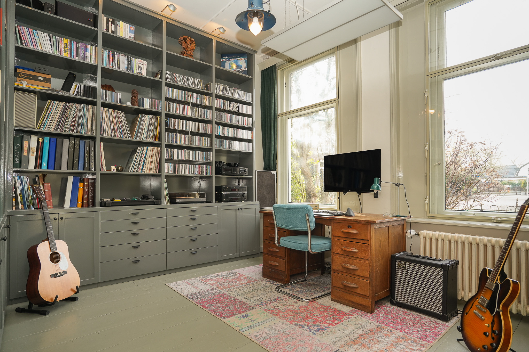 Aan de andere zijde van de gang bevindt zich de werk-/muziekkamer, een aangename ruimte met veel vaste kasten. Aansluitend aan de gang, bij het bordes, ligt een tweede kamer, geschikt als atelier, studeer- of extra slaapkamer. Aan de gang grenzen ook het toilet, de wasruimte en de wijnkelder.