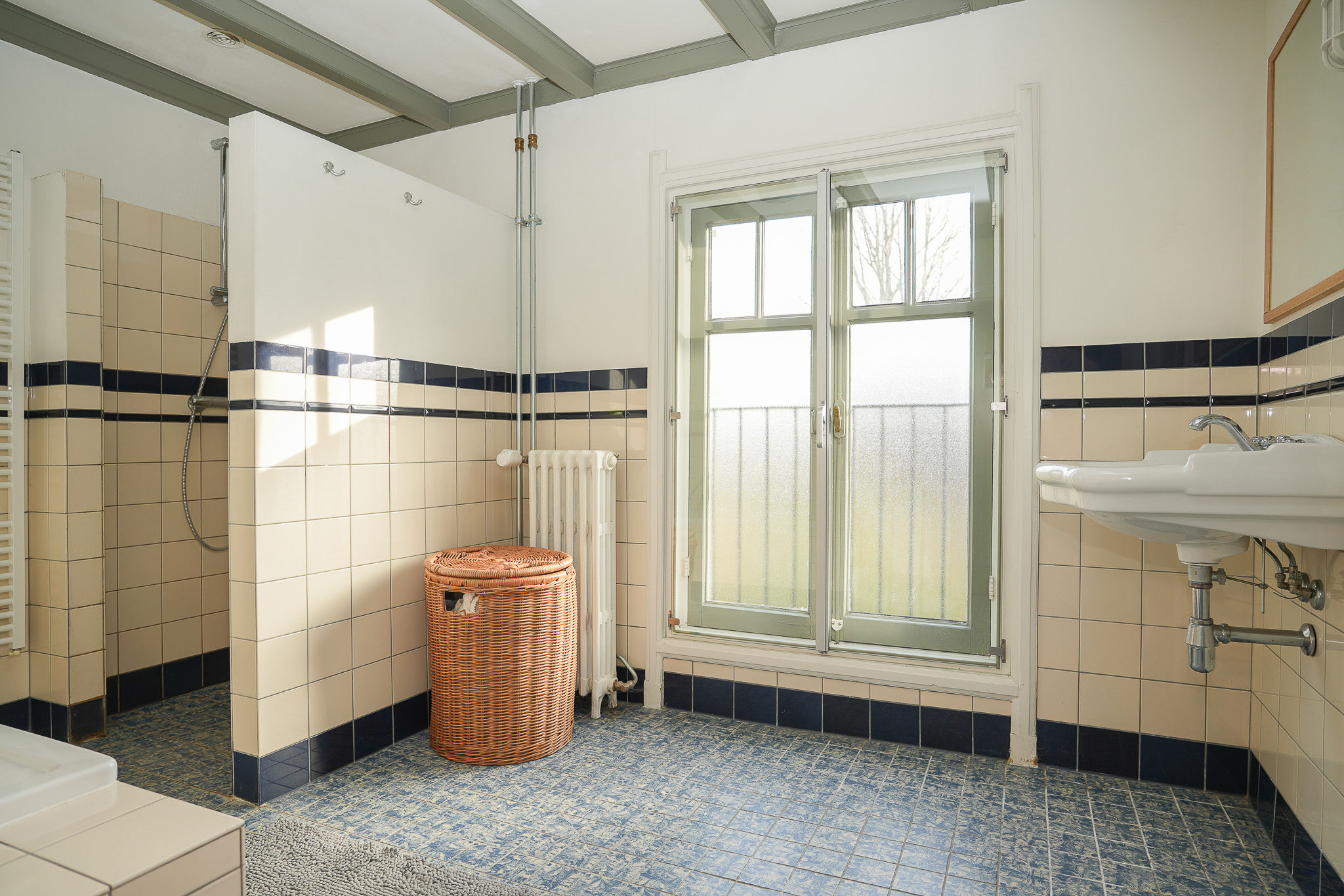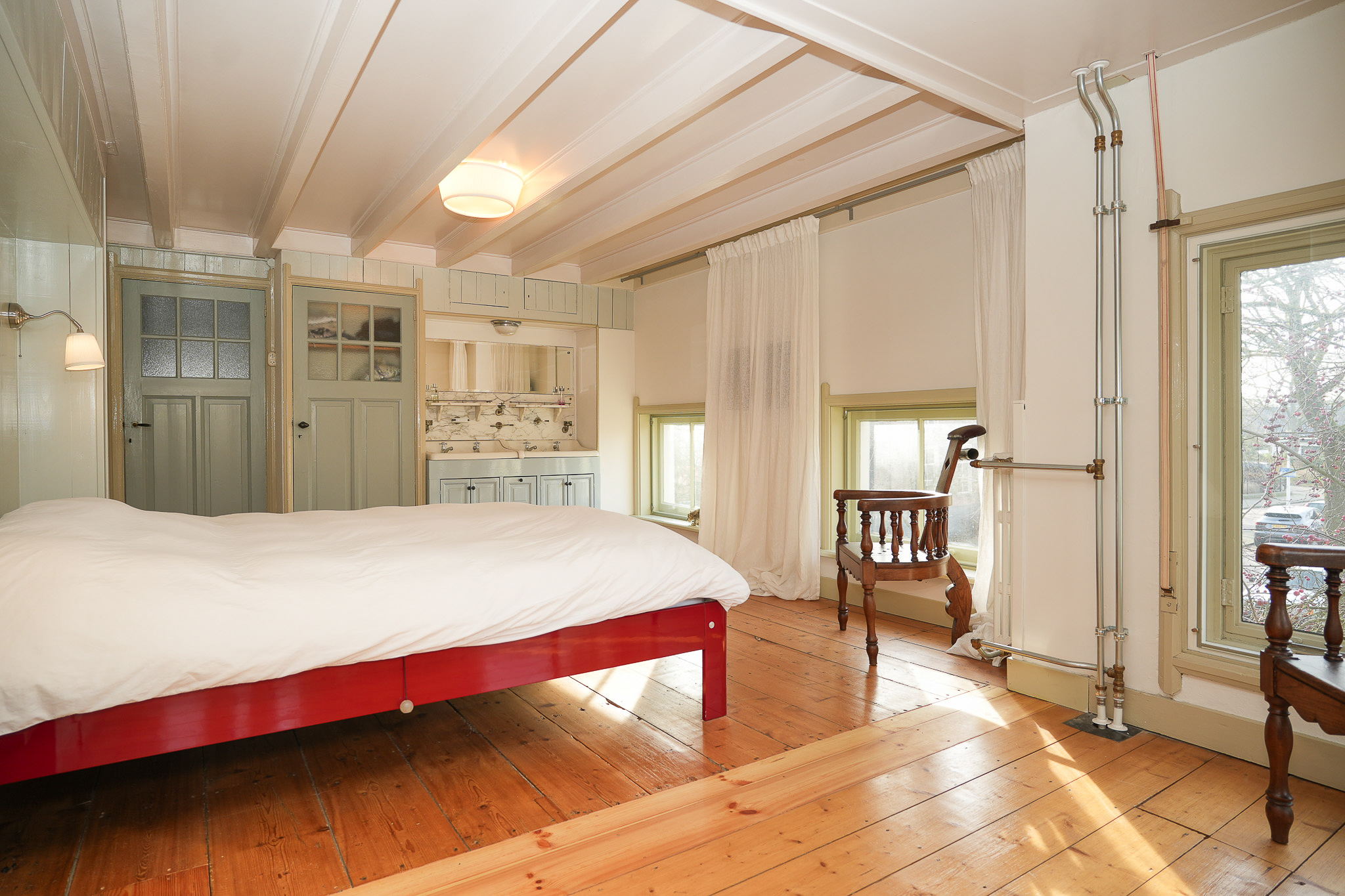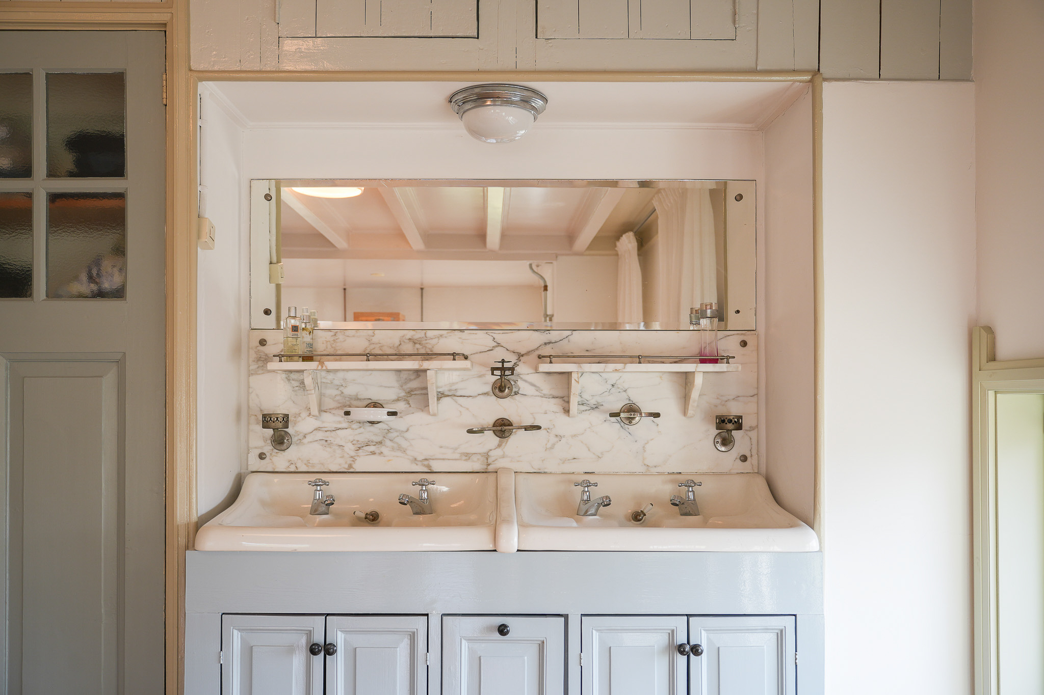 In de ouderslaapkamer aan de voorzijde is een bijzonder, oorspronkelijk wastafelmeubel behouden gebleven. Dit meubel bestaat uit twee porseleinen waskommen, opgenomen in een maatwerk meubel met kastruimte, en wordt geaccentueerd door een marmeren achterwand, bijpassend beslag en een brede spiegel. Een sfeervol detail dat het historische karakter van de villa benadrukt en de slaapkamer een Franse allure geeft. Een fraai aanvullend detail is de kastruimte in deze kamer, waar zich in het verleden een lift bevond.