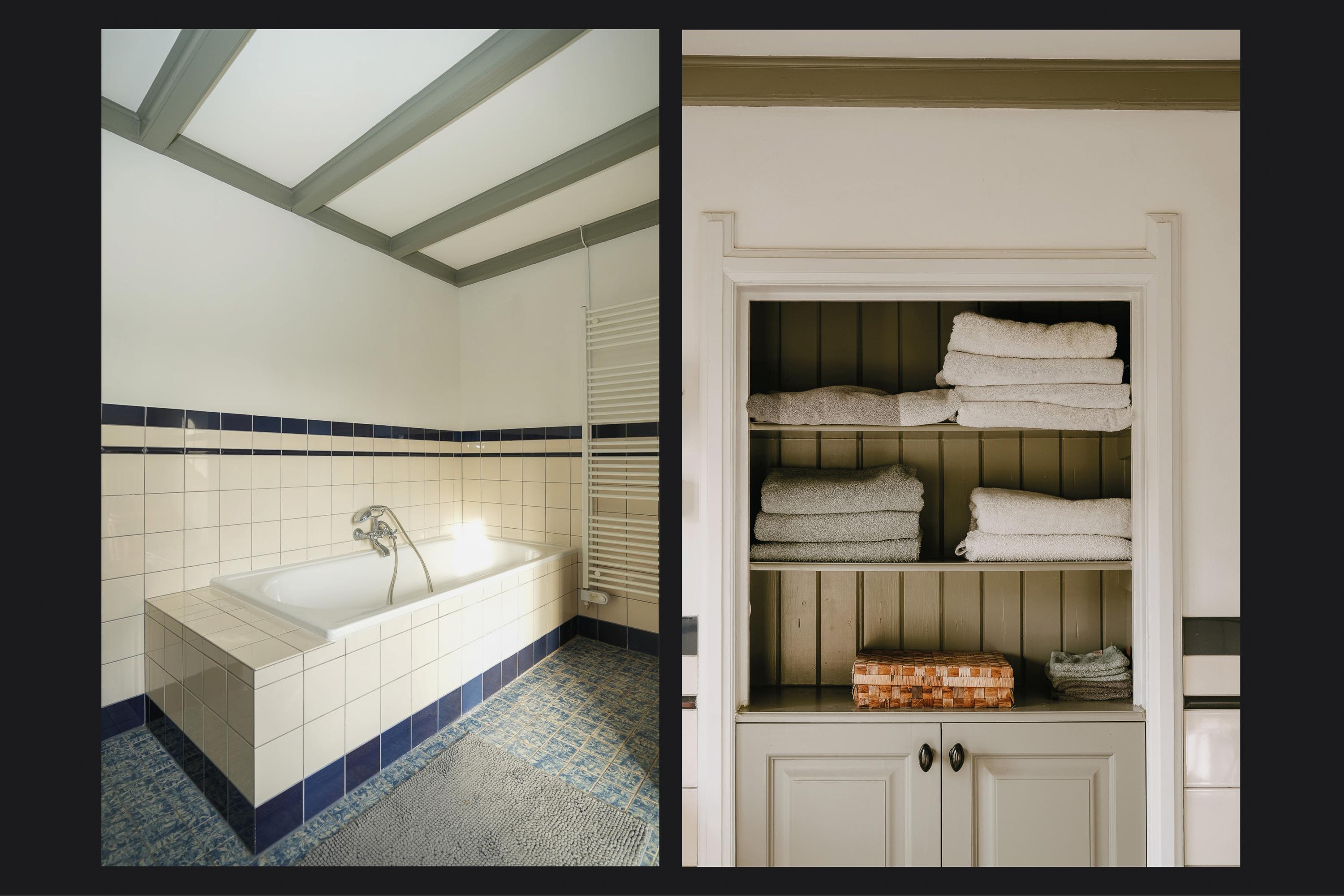 De badkamer is eenvoudig, maar functioneel en beschikt over een douche, ligbad en wastafel. Er is een ruime separate toiletruimte met wastafelmeubel.