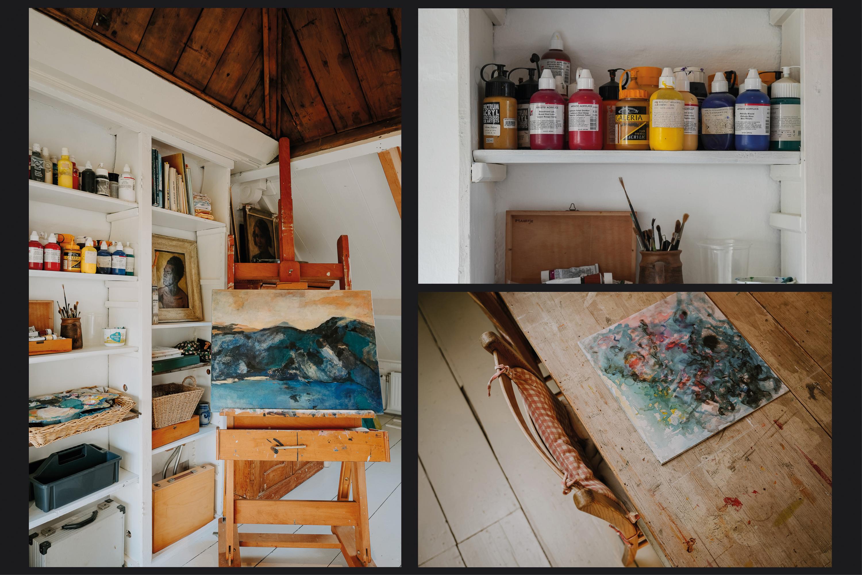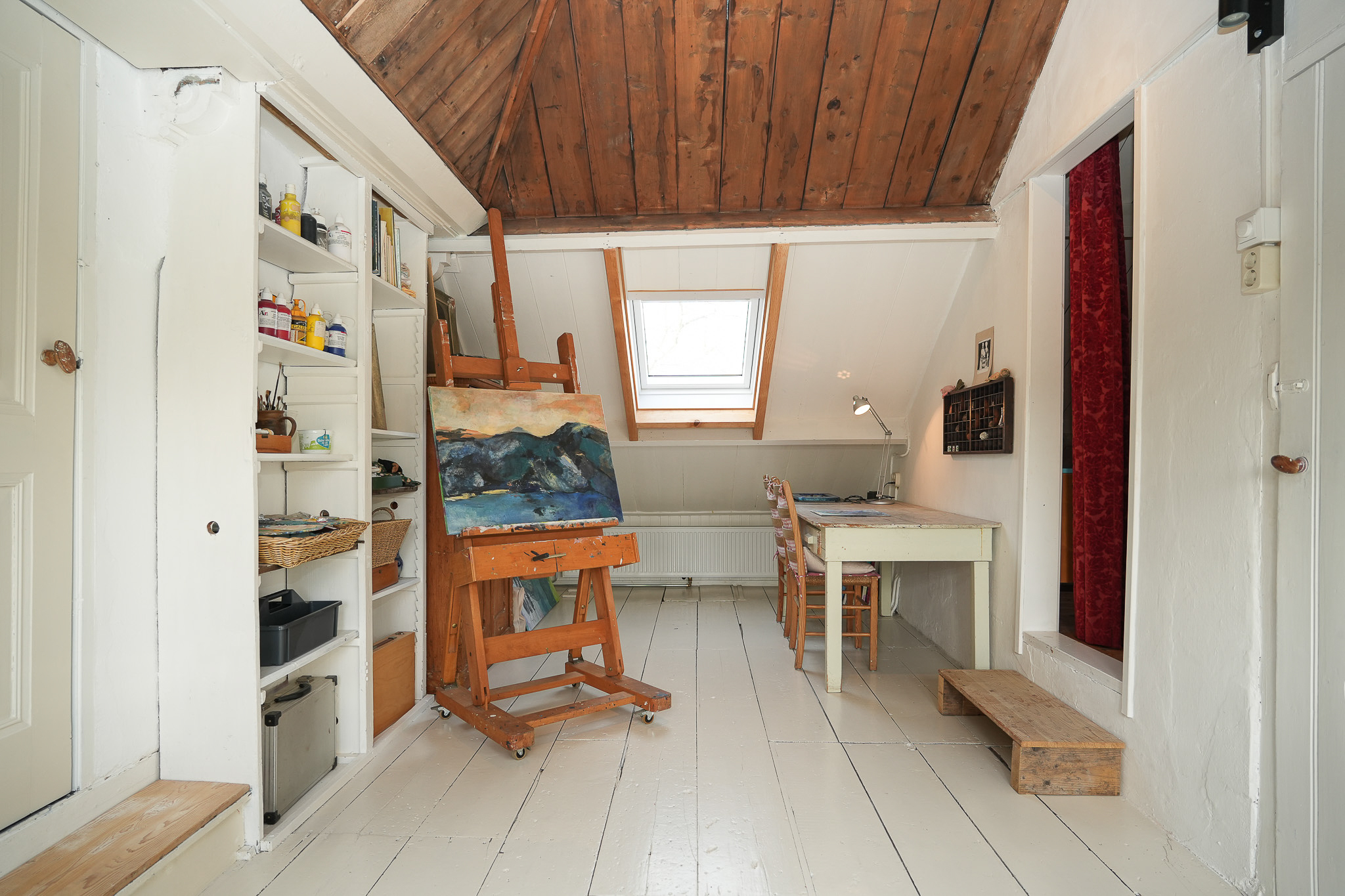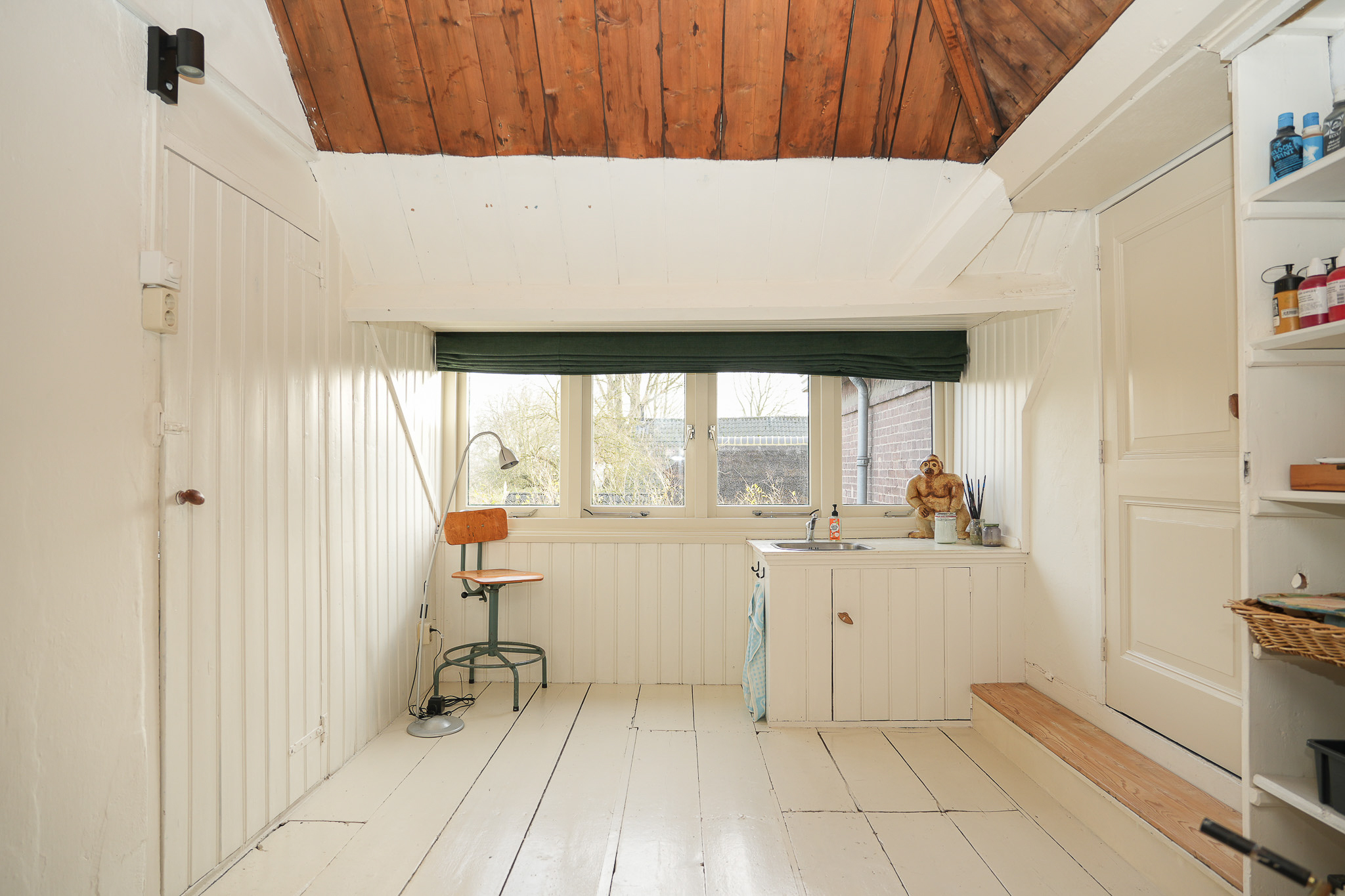 Aan de achterzijde van de verdieping is een ruimte ingericht als atelier. Hier bevinden zich tevens de vierde slaapkamer en een lager gelegen technische ruimte, die door de huidige eigenaren ook wordt gebruikt als praktische droogruimte voor de was.