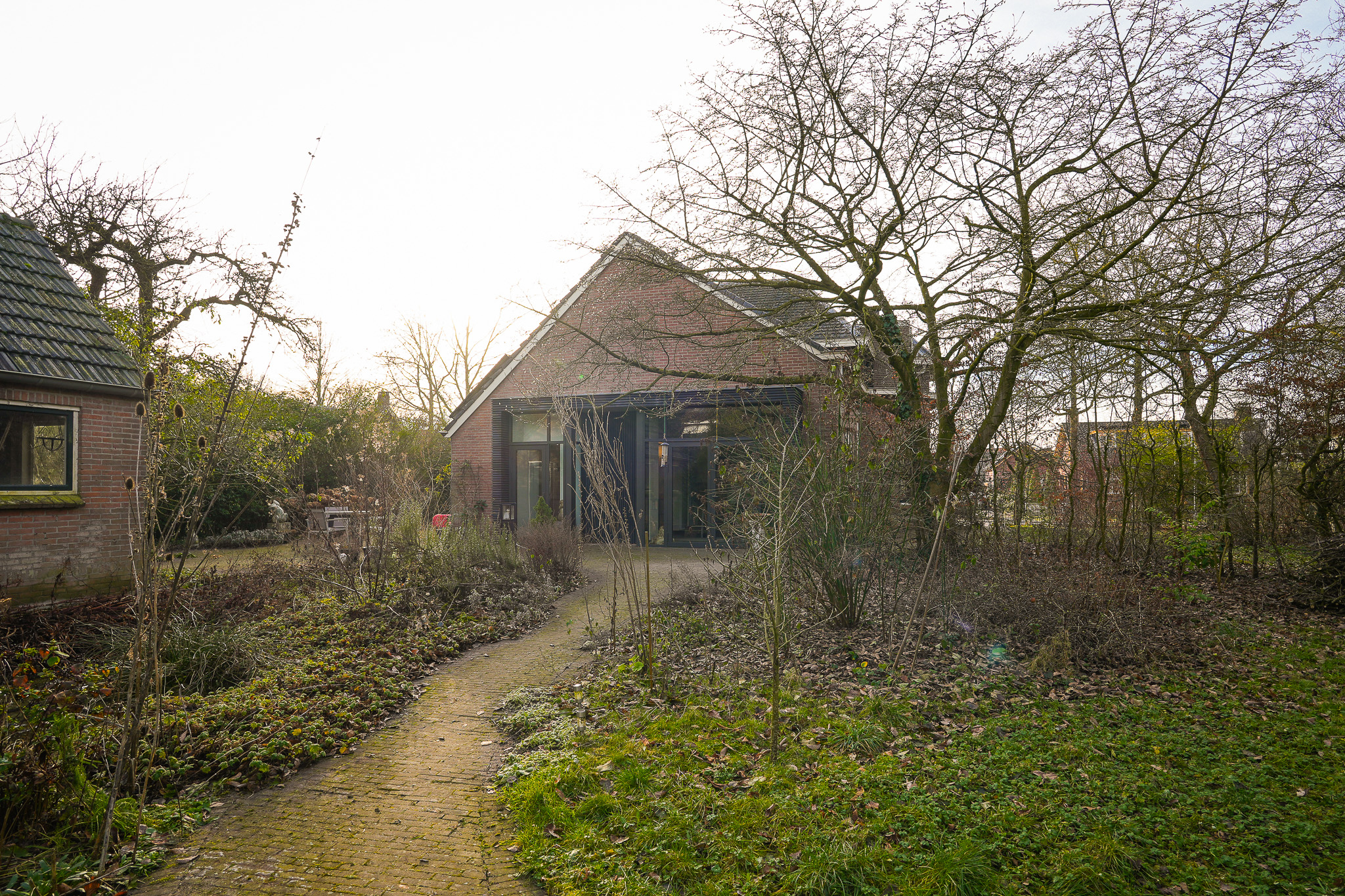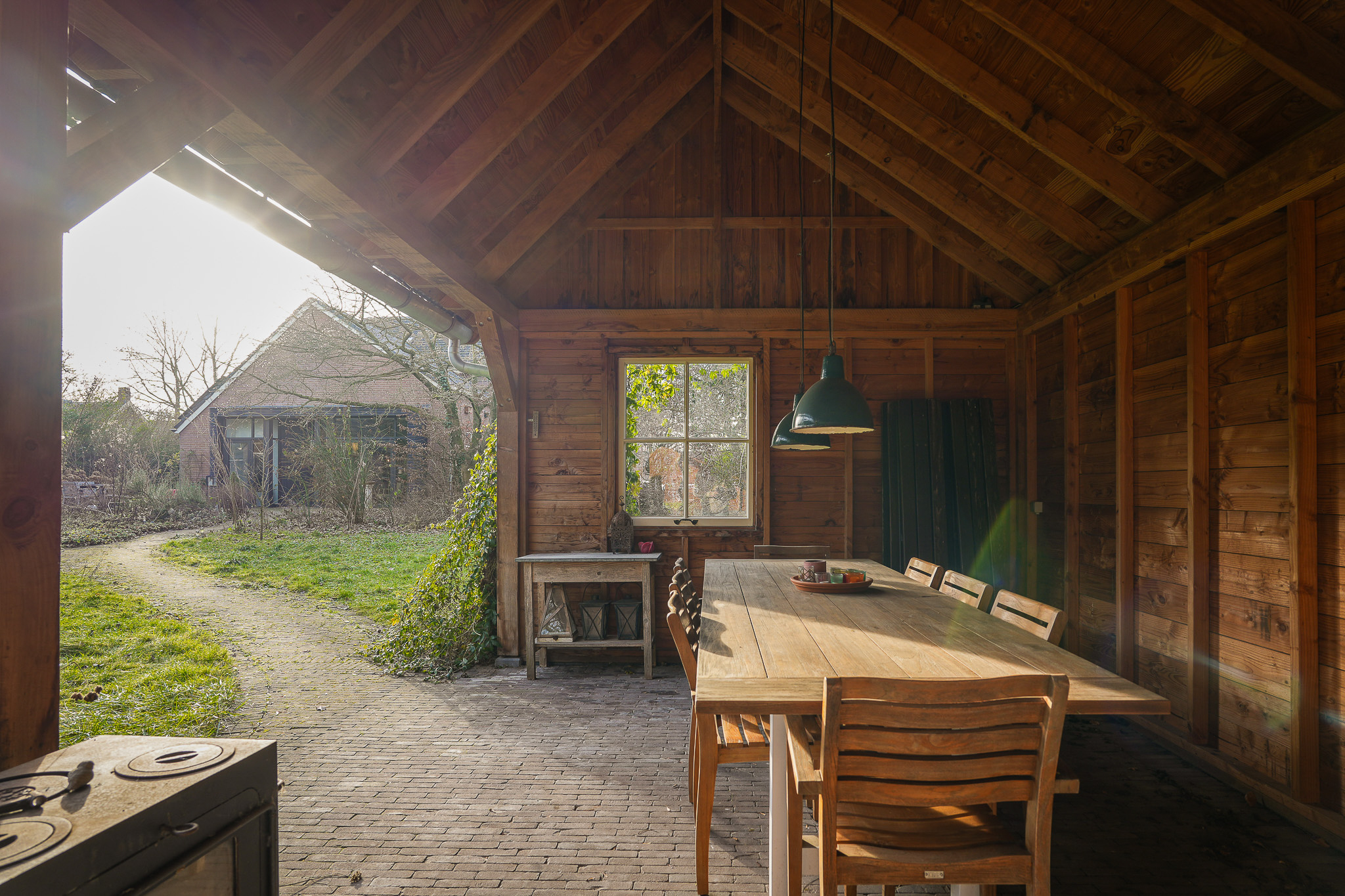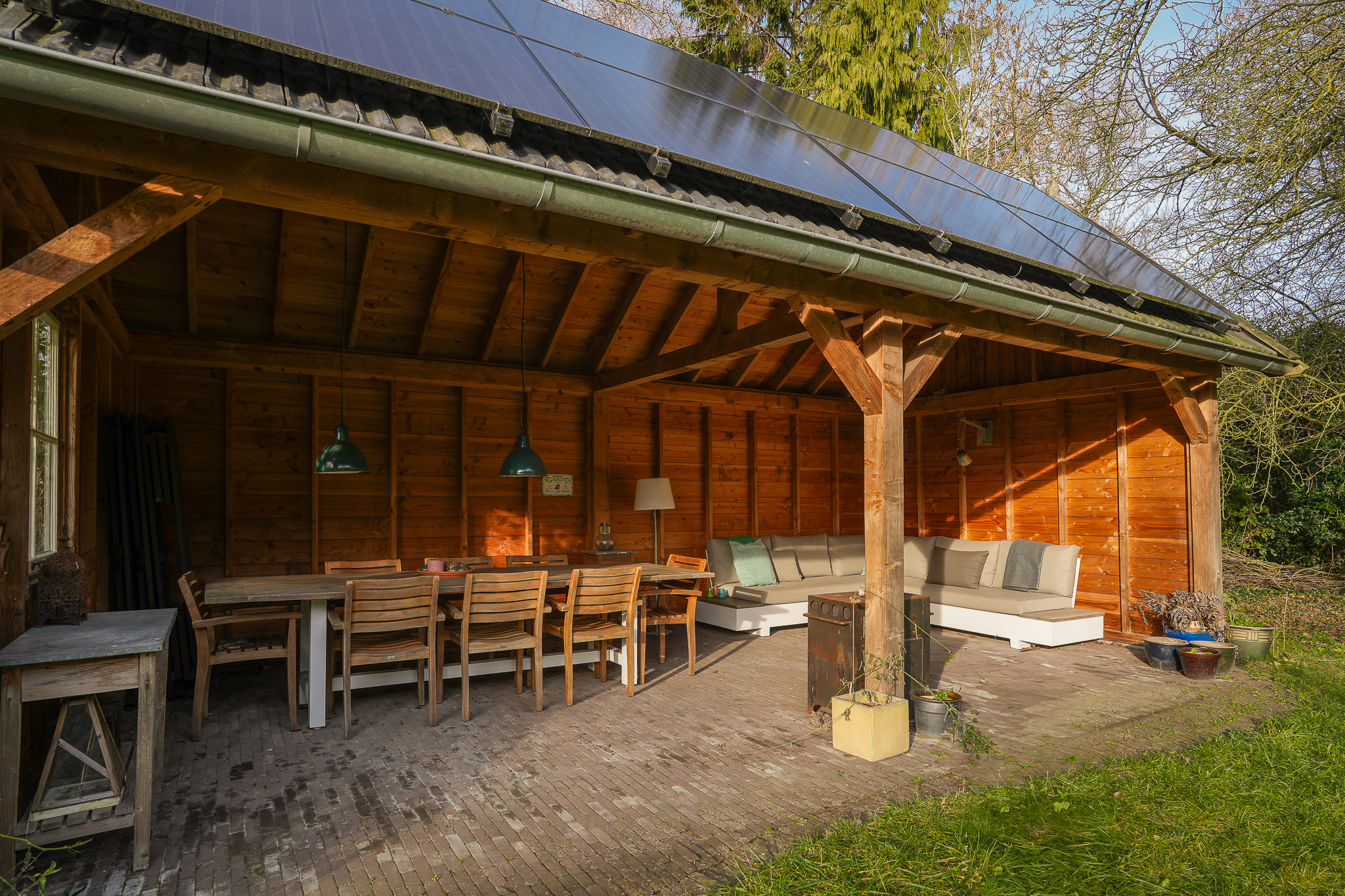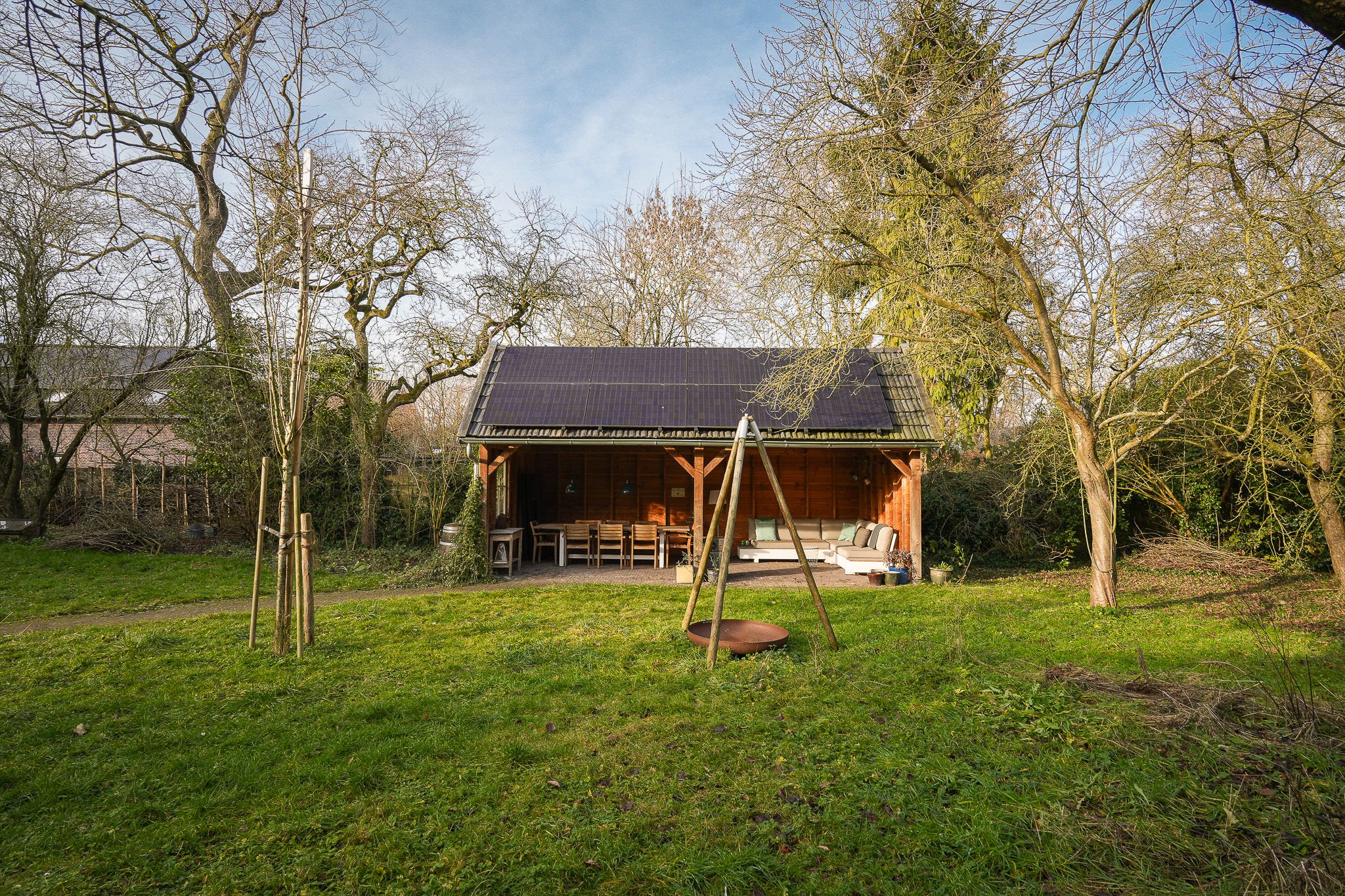 Daarnaast vinden uiteenlopende vogelsoorten en salamanders hier hun toevlucht, wat de tuin tot een levendige en biodiverse buitenruimte maakt. Onder de overkapping van ruim 25 m², gerealiseerd in 2019, is er een fraai zicht over de tuin. De stenen schuur met pannendak vormt een waardevolle aanvulling en biedt ruimte voor opslag, hobby of tuinbenodigdheden.