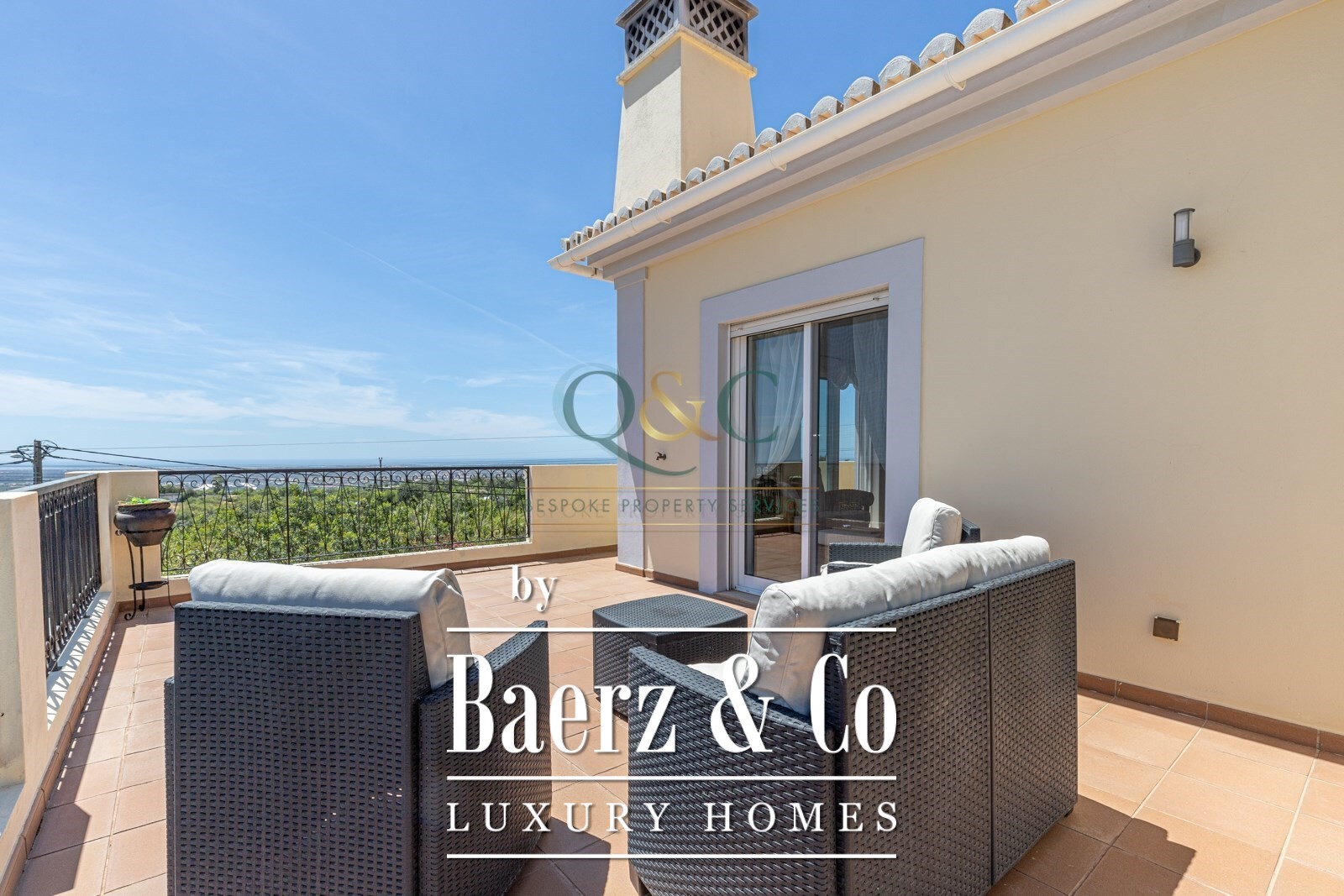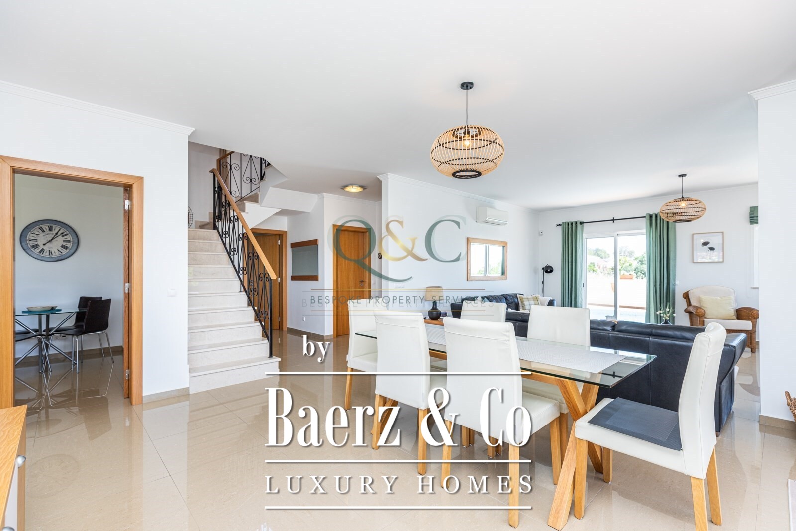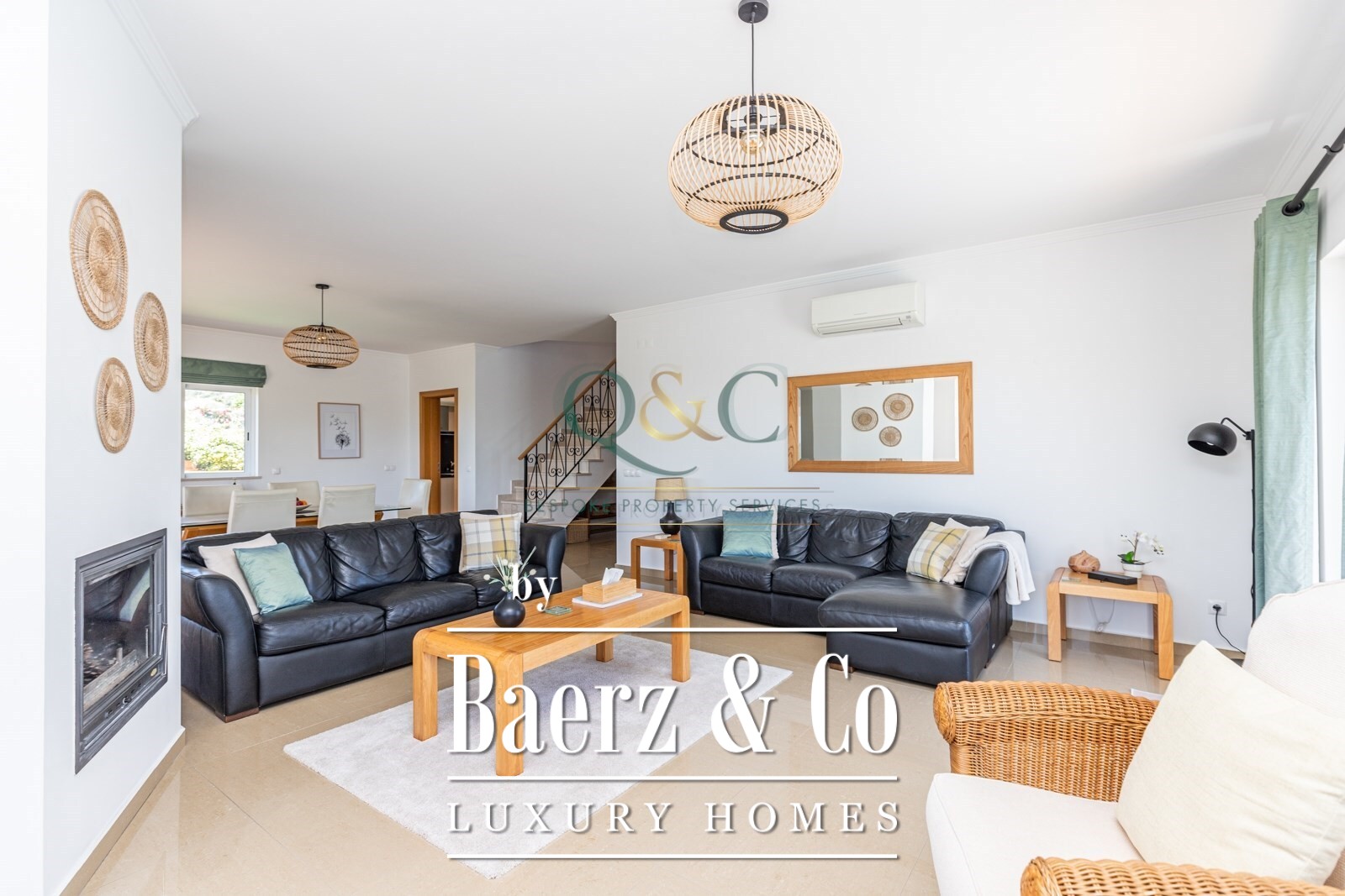 Deze villa in Santa Bárbara de Nexe biedt doordacht wonen over 174 m², beginnend met een inpandige garage en een terras dat het privézwembad omarmt. De entree leidt naar een open woon- en eetkamer, geaccentueerd door een houtkachel. Subtiele overgangen verbinden binnenruimten met overdekte en open terrassen, waardoor licht wordt binnengebracht en het uitzicht op zee en het omliggende landschap wordt geframed.
