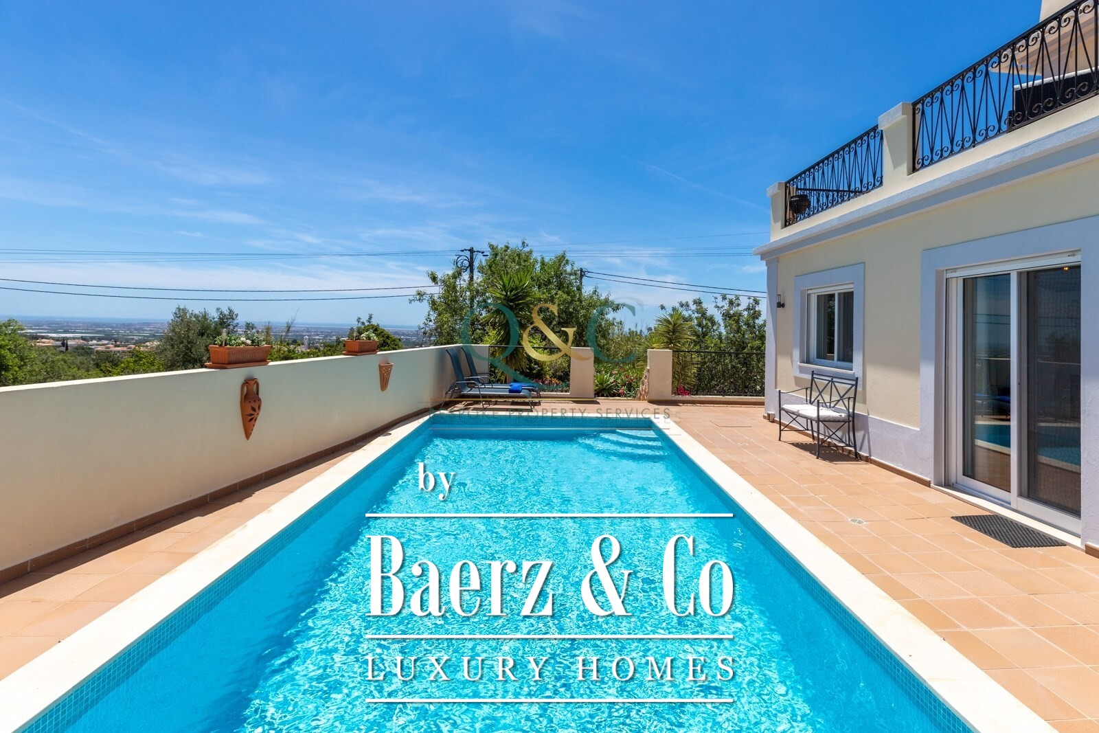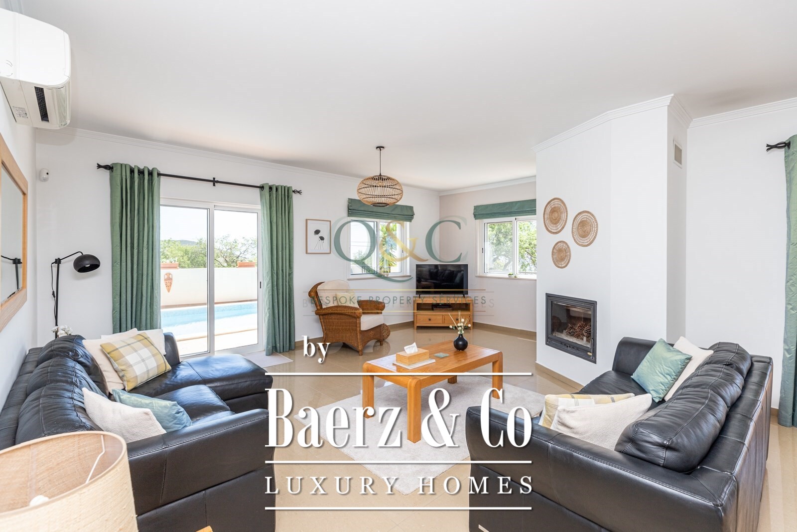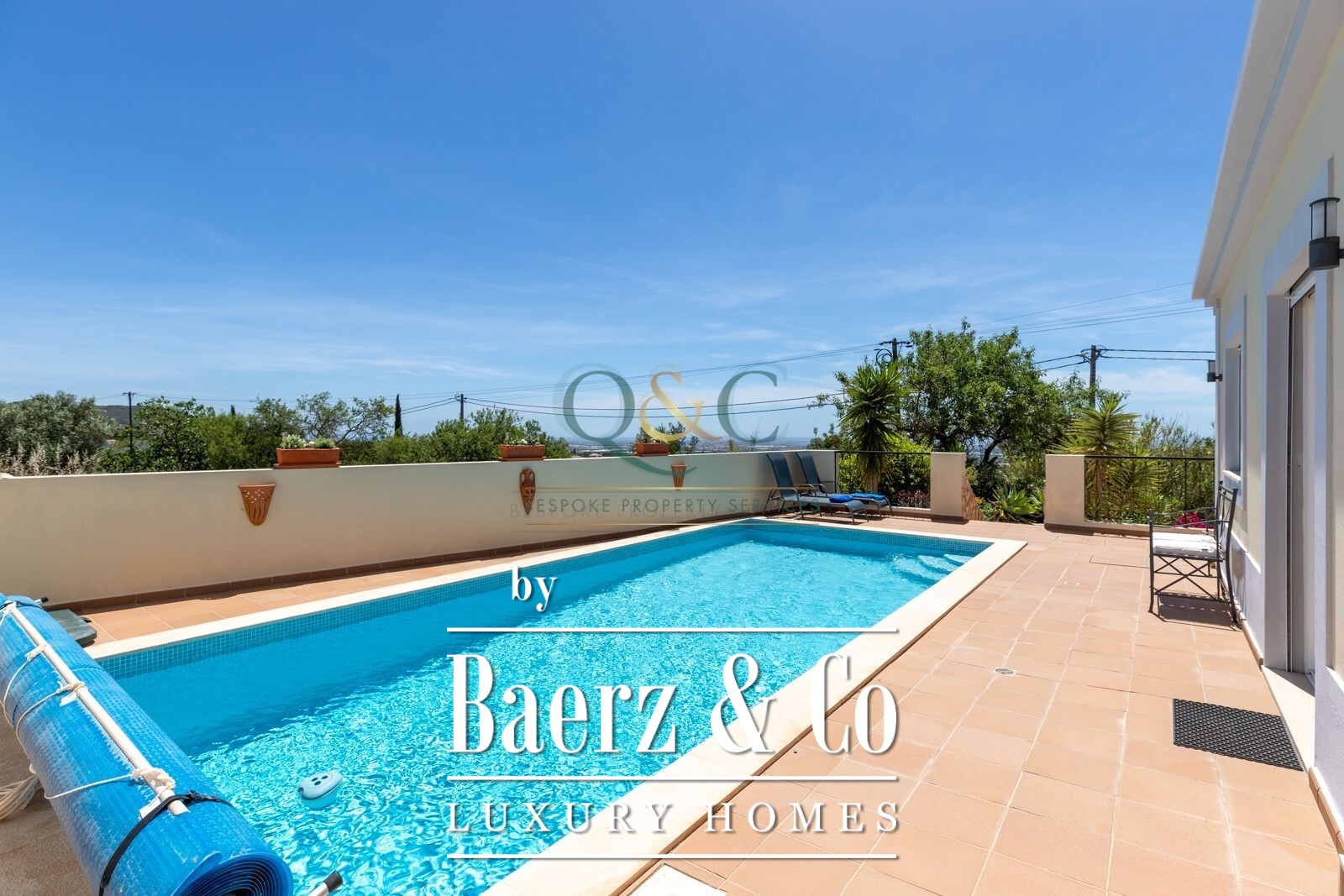 Deze villa in Santa Bárbara de Nexe biedt doordacht wonen over 174 m², beginnend met een inpandige garage en een terras dat het privézwembad omarmt. De entree leidt naar een open woon- en eetkamer, geaccentueerd door een houtkachel. Subtiele overgangen verbinden binnenruimten met overdekte en open terrassen, waardoor licht wordt binnengebracht en het uitzicht op zee en het omliggende landschap wordt geframed.