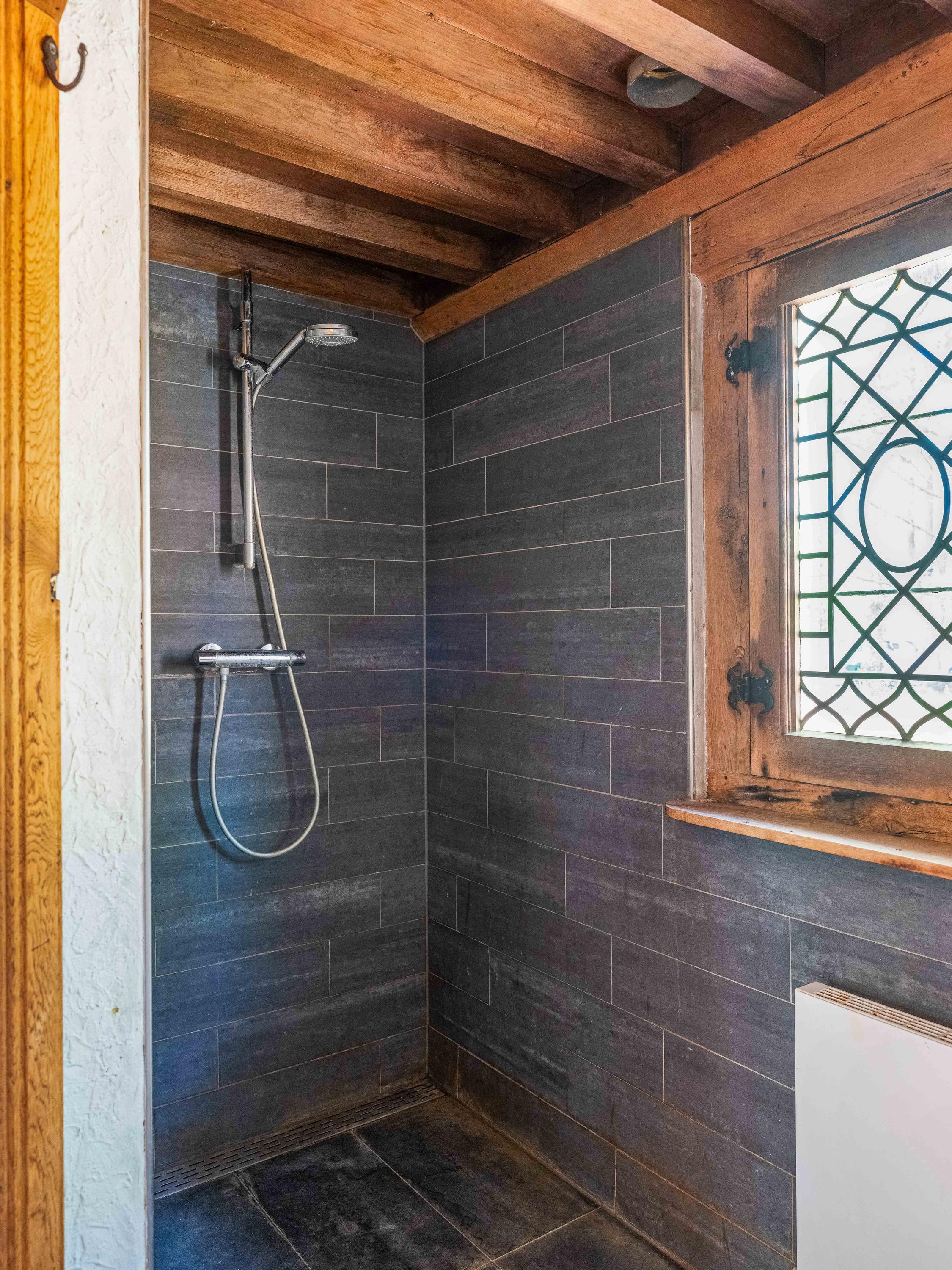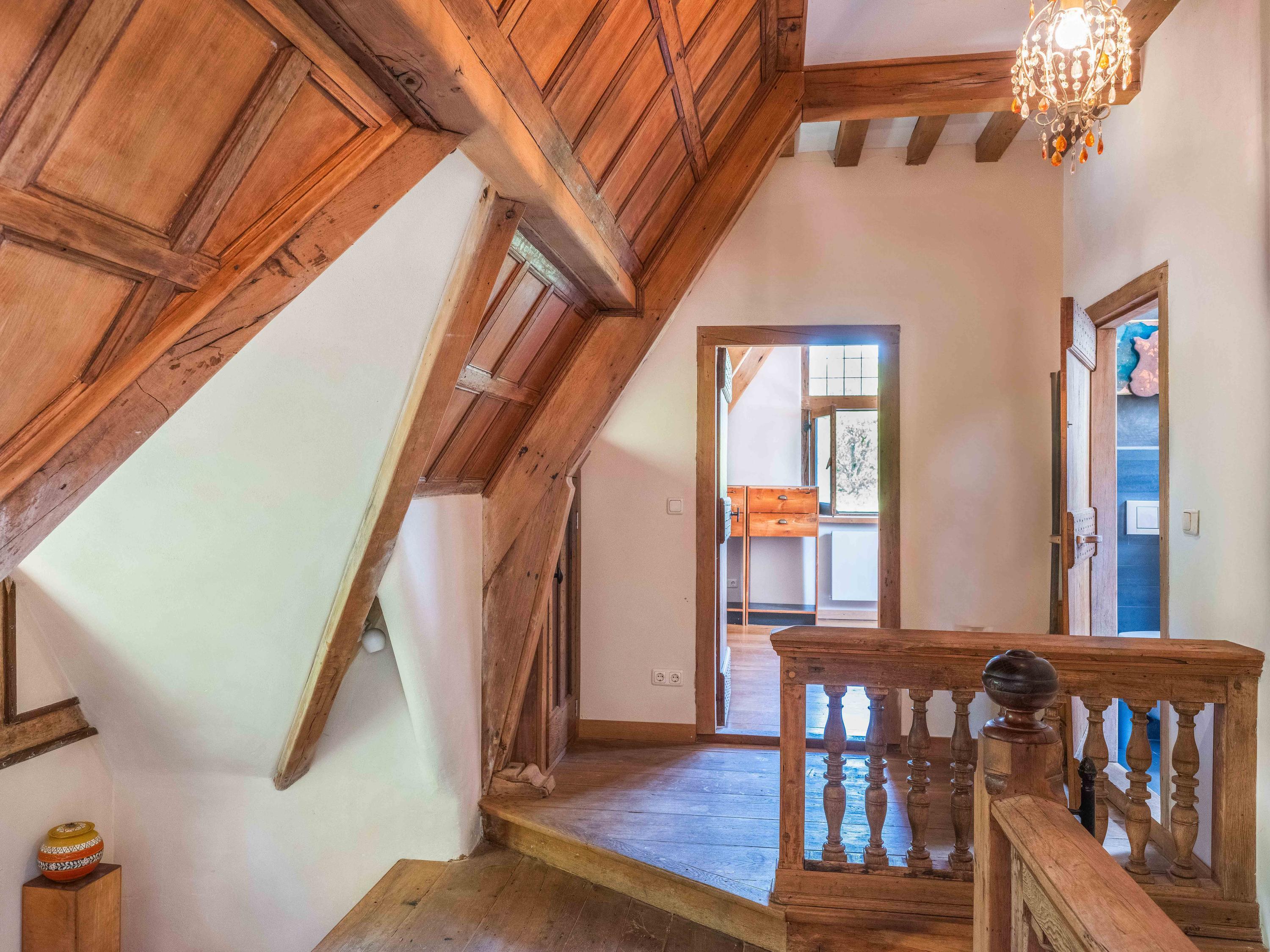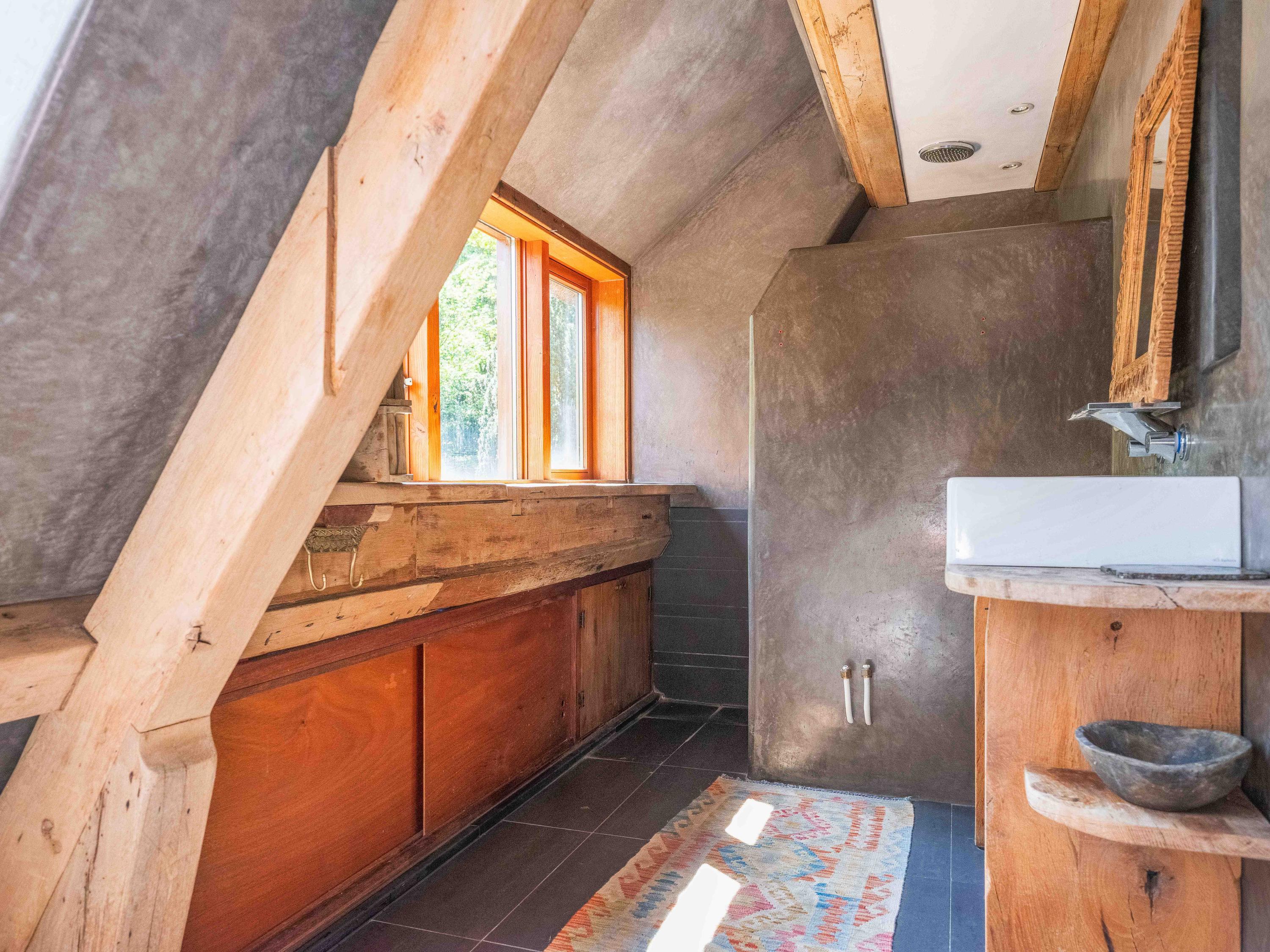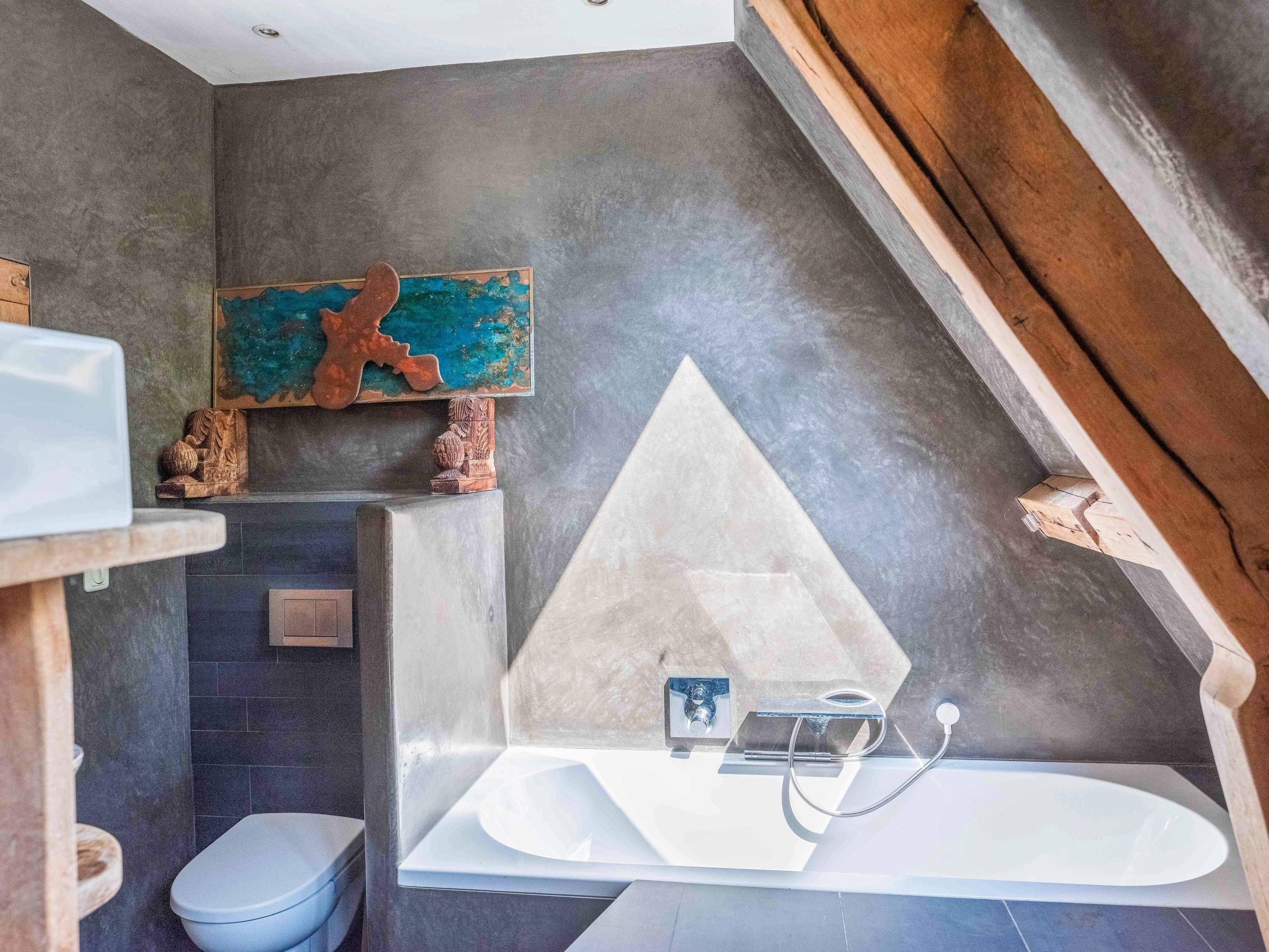 Op de verdieping vinden we naast de ruime overloop twee slaapkamers met vaste kasten en een moderne badkamer uitgevoerd in tadelakt-stuc, met toilet, ligbad, wastafel en douche. Prachtig ook om te zien hoe de balken in het zicht zijn gebleven.