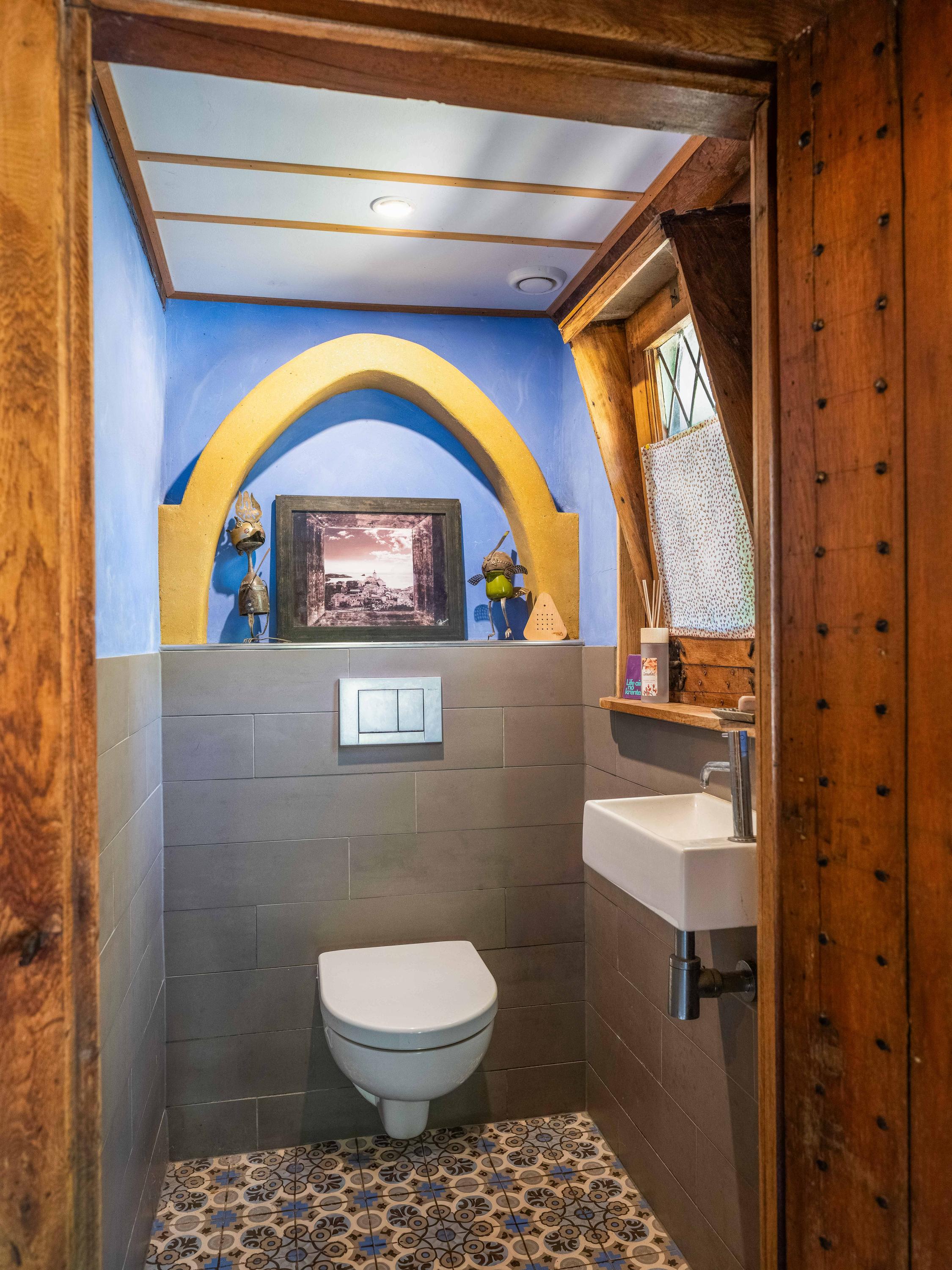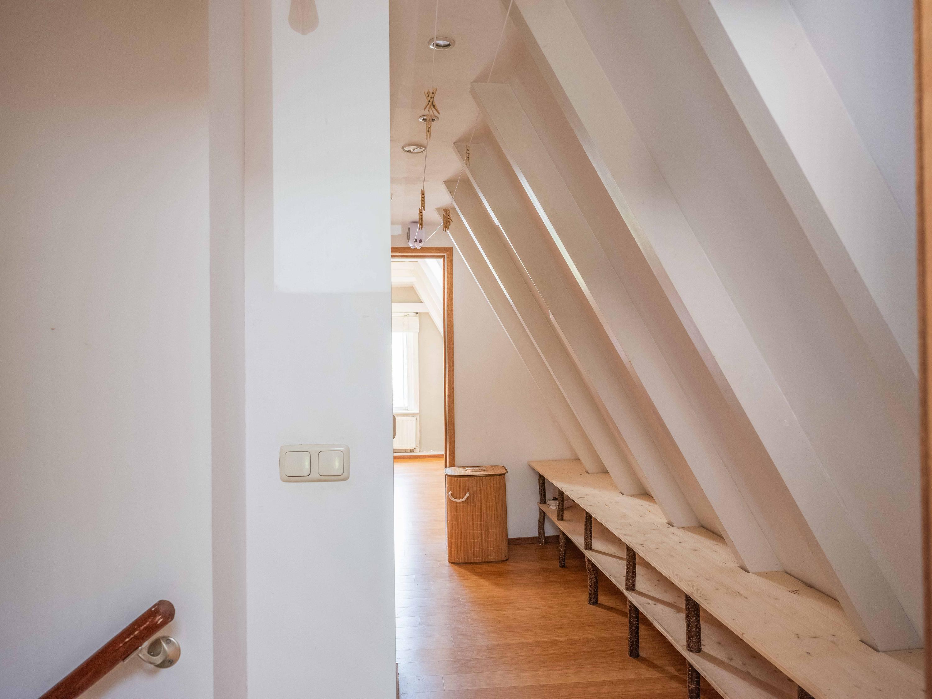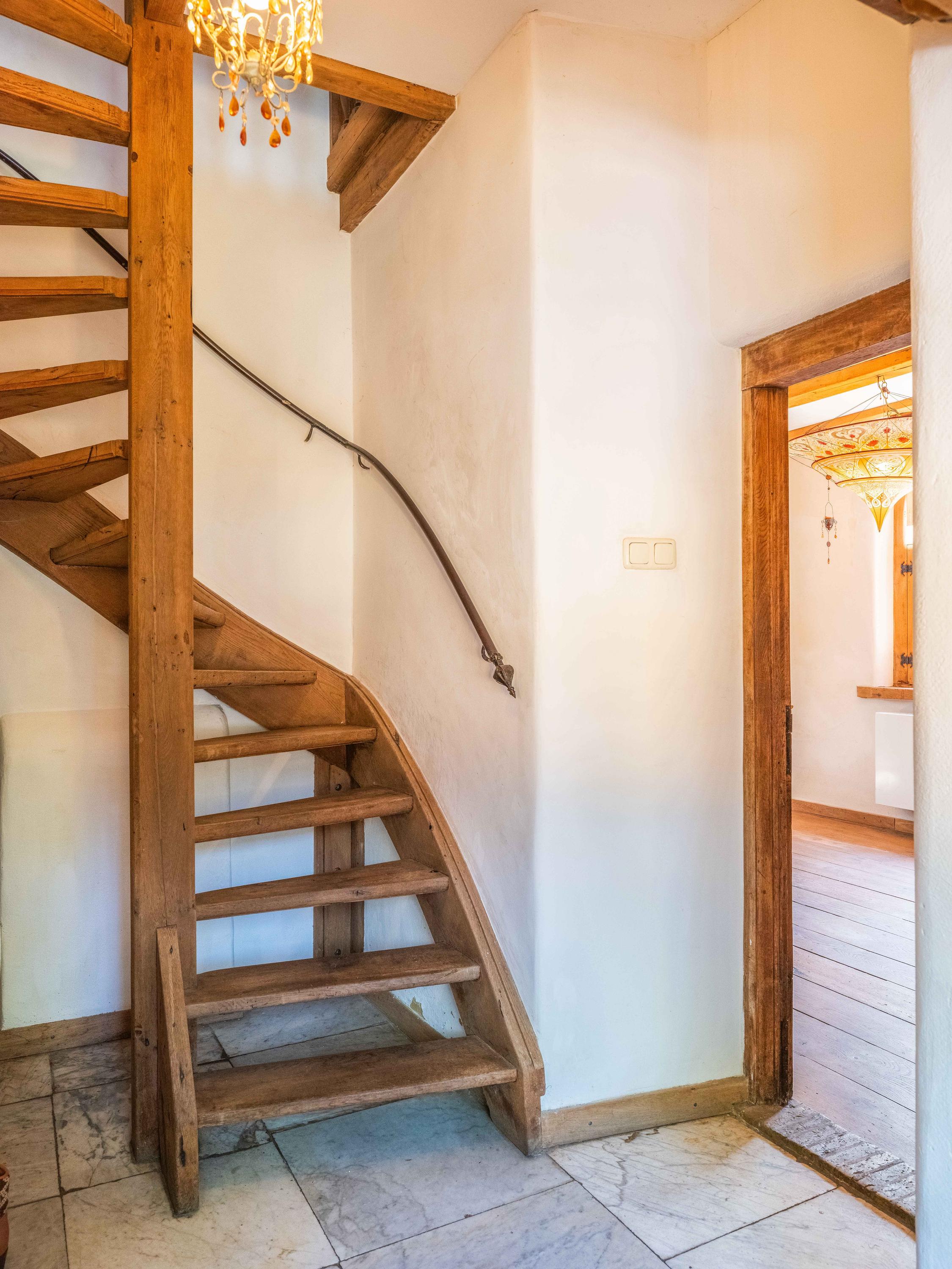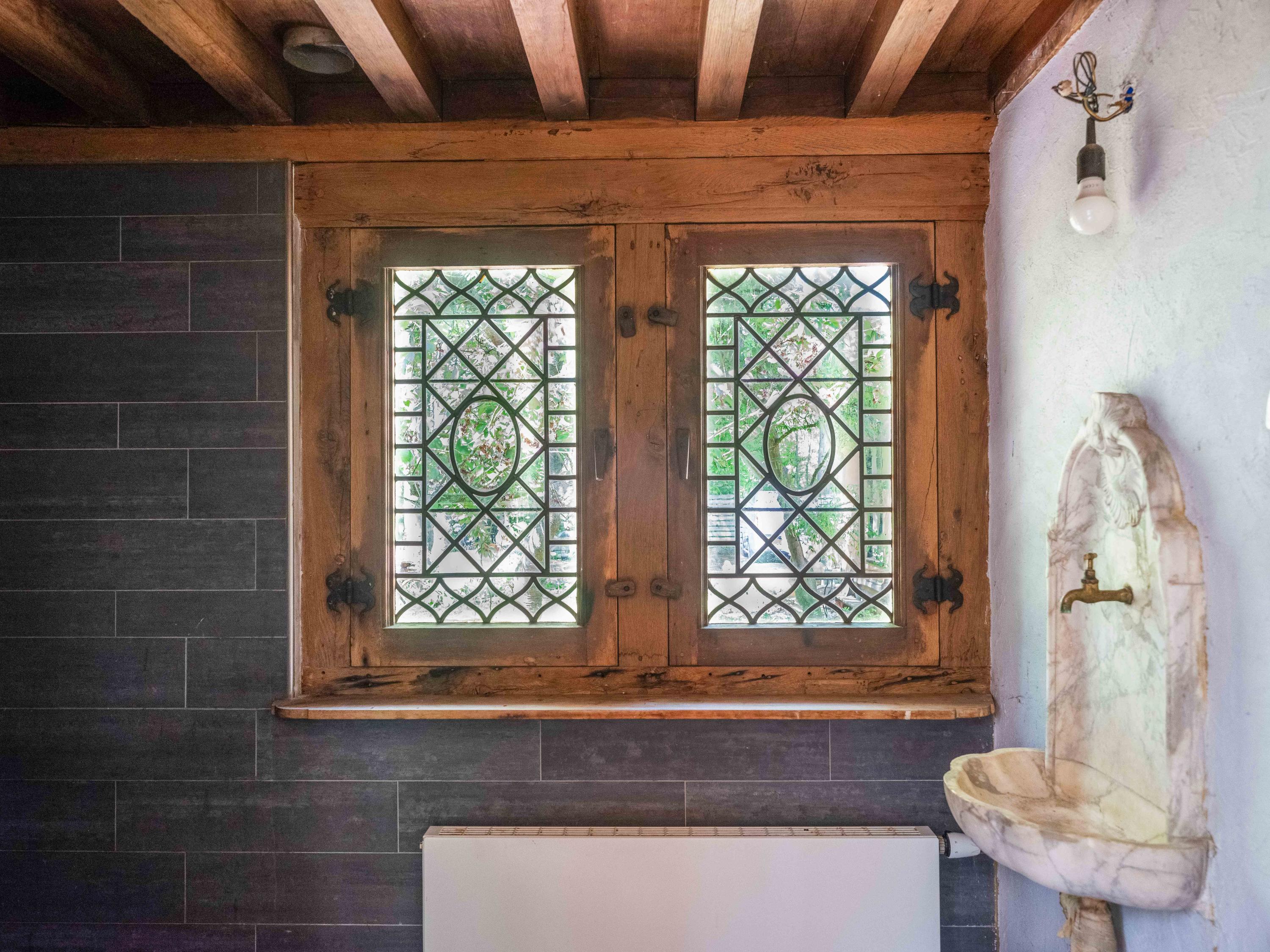 Op de verdieping vinden we naast de ruime overloop twee slaapkamers met vaste kasten en een moderne badkamer uitgevoerd in tadelakt-stuc, met toilet, ligbad, wastafel en douche. Prachtig ook om te zien hoe de balken in het zicht zijn gebleven.