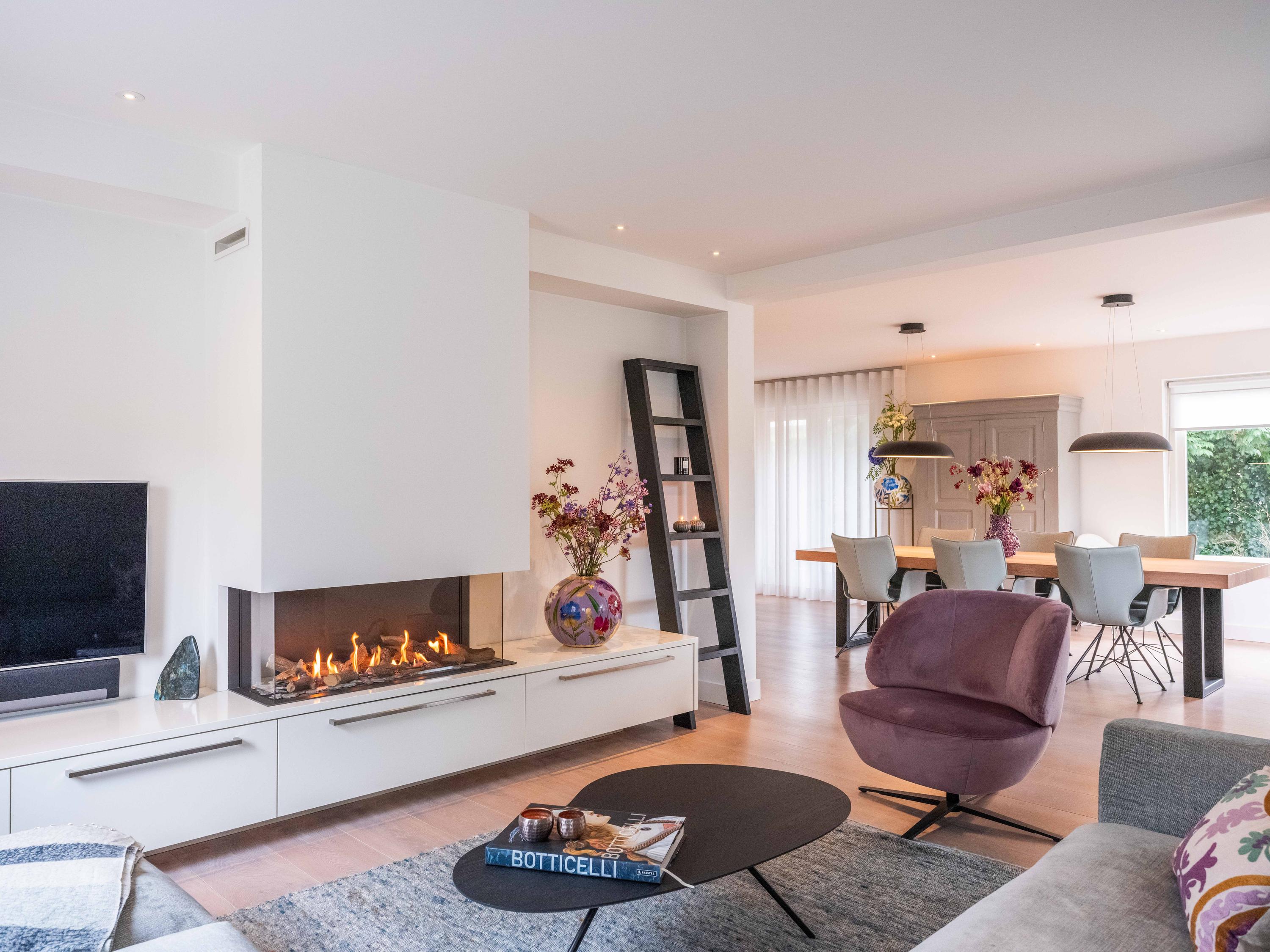 Via dubbele deuren is er toegang tot de royale L-vormige living, hier wordt je meteen wordt verwelkomd door veel licht dankzij de grote raampartijen. In de hoek is een gezellige zithoek met een sfeervolle gashaard. De eiken verlijmde vloer in combinatie met vloerverwarming over de volledige begane grond zorgt voor een warme en comfortabele sfeer.