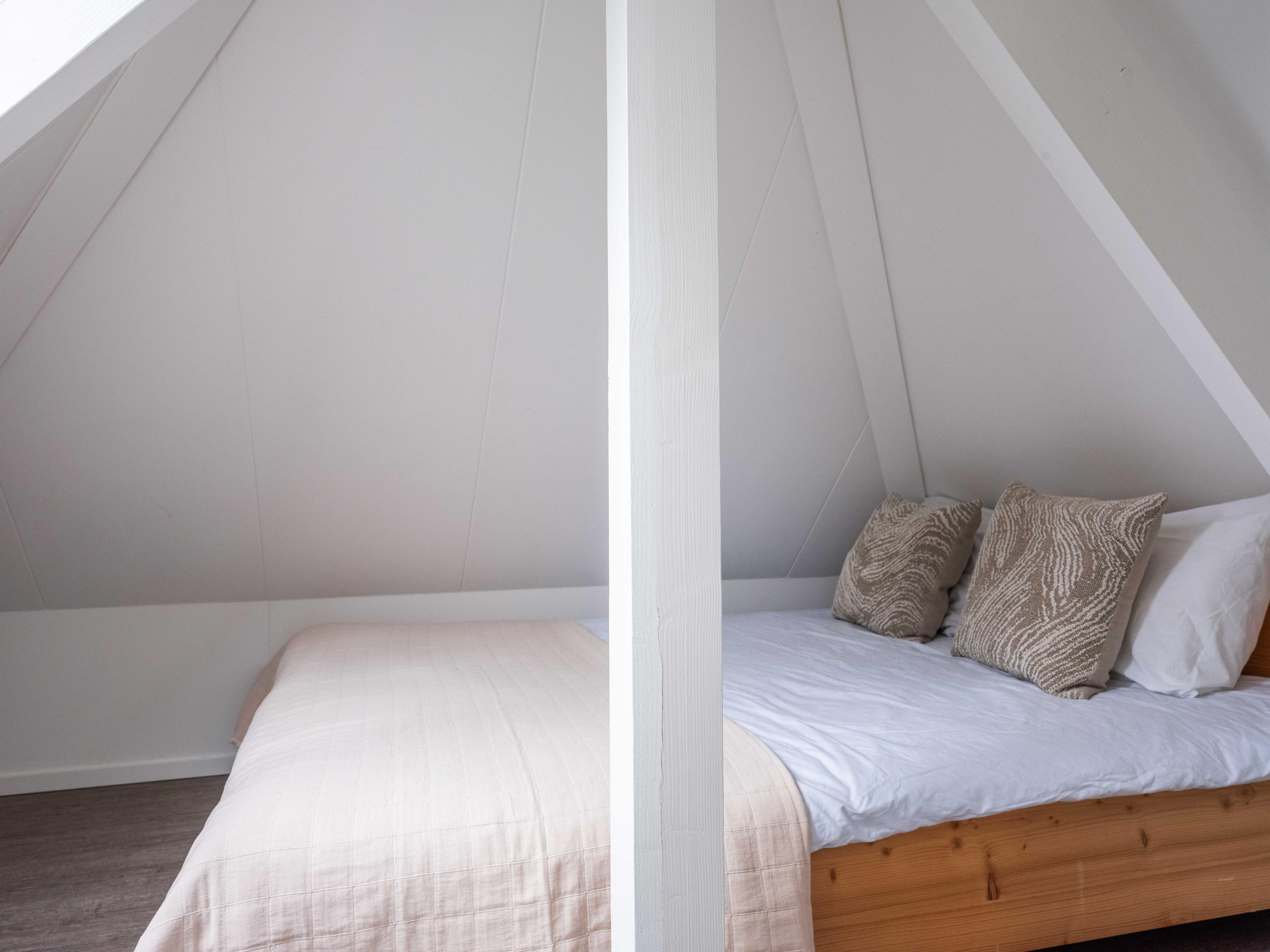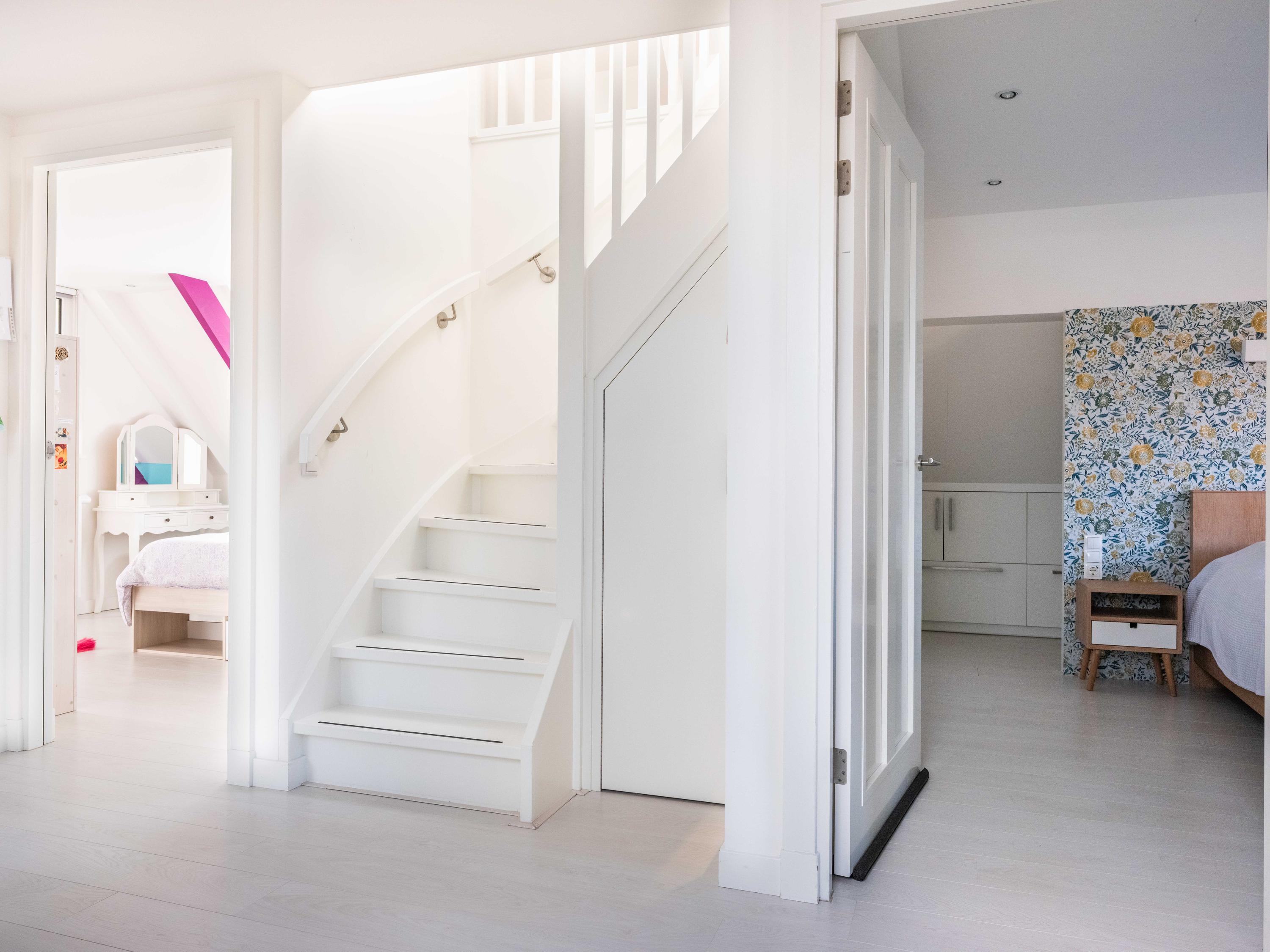 De tweede verdieping biedt nog meer ruimte: een grote overloop en twee kamers. Eén daarvan doet nu dienst als logeerkamer, de andere kamer is nu niet in gebruik maar kan eveneens als werkkamer worden gebruikt.